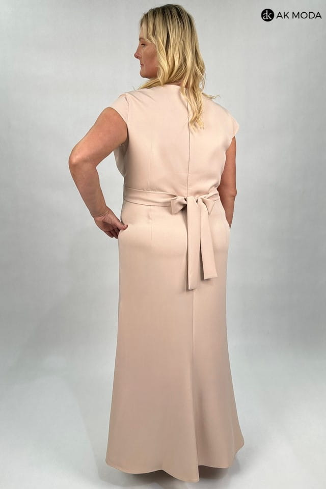 Długa sukienka w kolorze beżowym z kopertowym dekoltem. W komplecie pasek z ozdobnym kwiatkiem.
