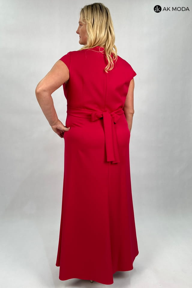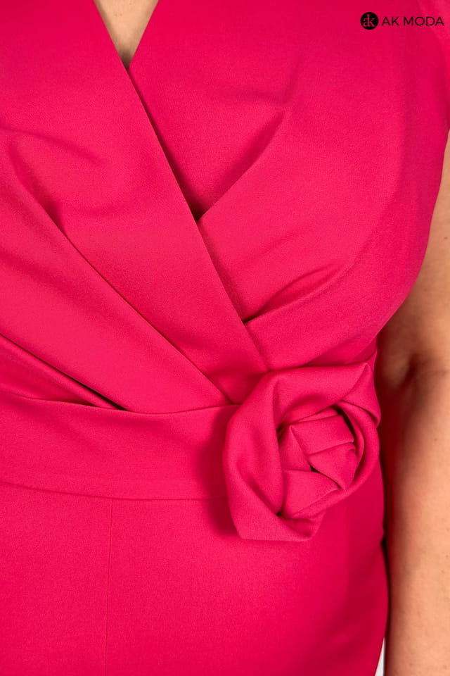 Długa sukienka w kolorze malinowym z kopertowym dekoltem. W komplecie pasek z ozdobnym kwiatkiem.