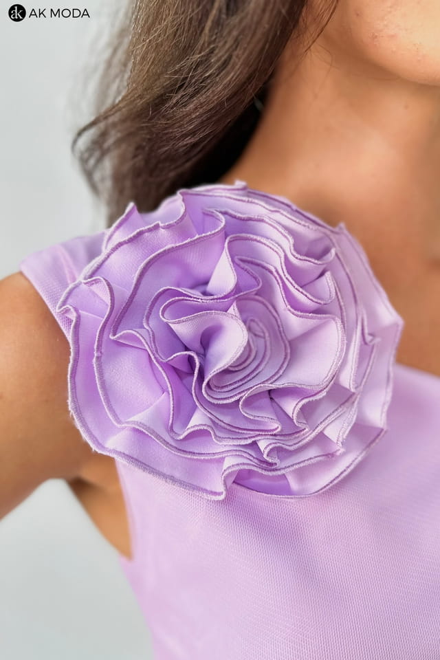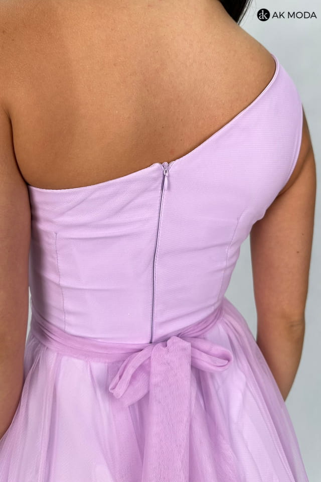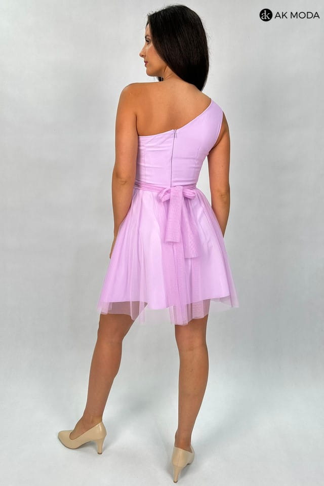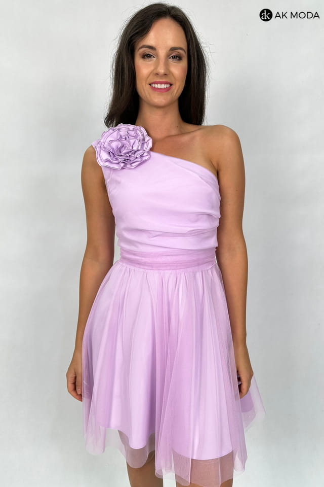 Krótka rozkloszowana sukienka na jedno ramię w kolorze fioletowym. Wierzchnia warstwa tiulowa, na ramieniu odpinany ozdobny kwiatek, w talii wiązany pasek.