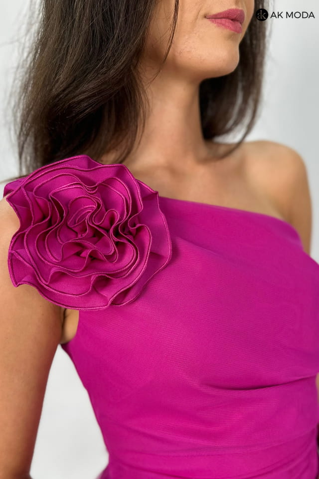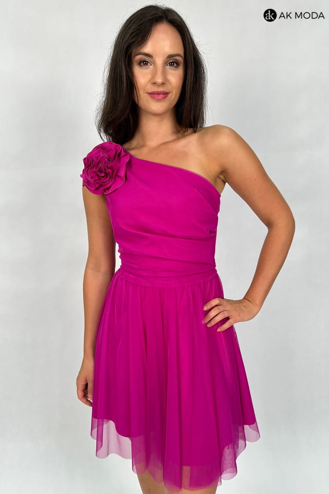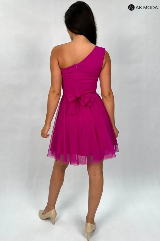 Krótka rozkloszowana sukienka na jedno ramię w kolorze biskupim. Wierzchnia warstwa tiulowa, na ramieniu odpinany ozdobny kwiatek, w talii wiązany pasek.