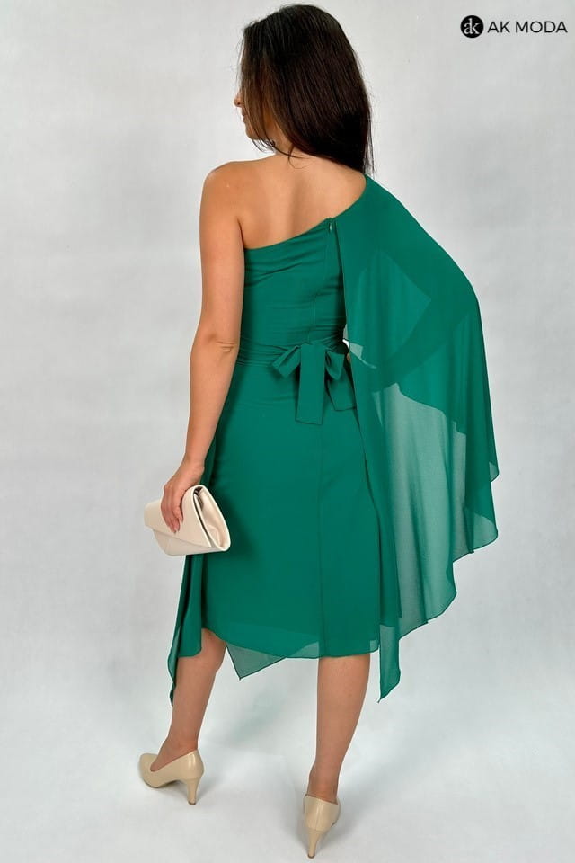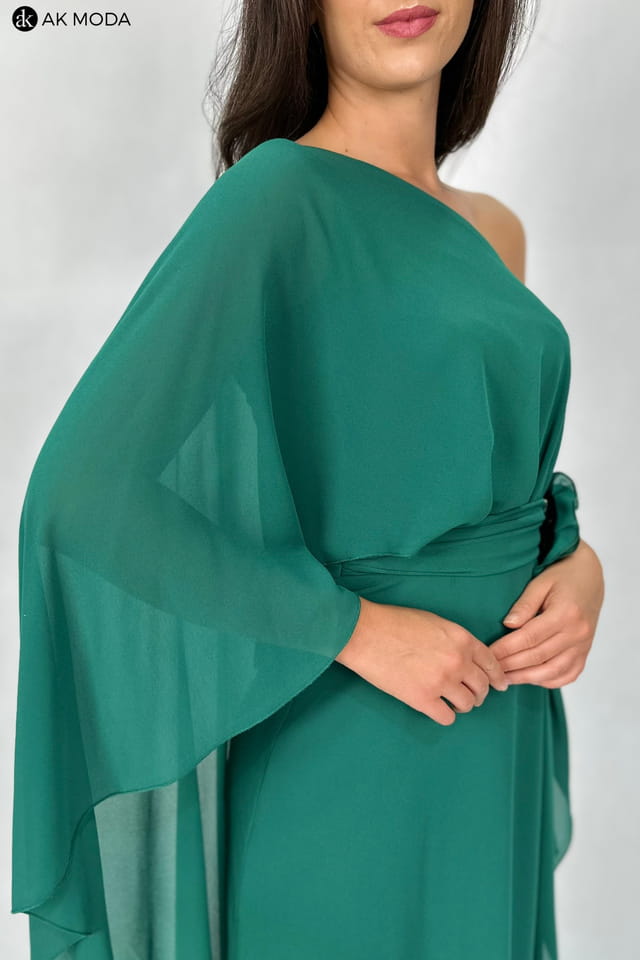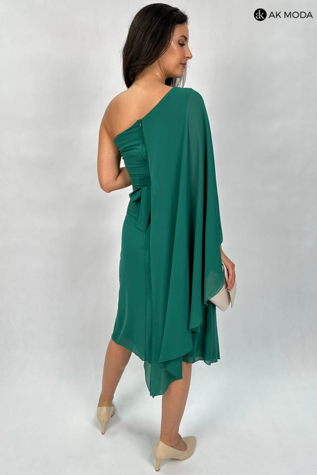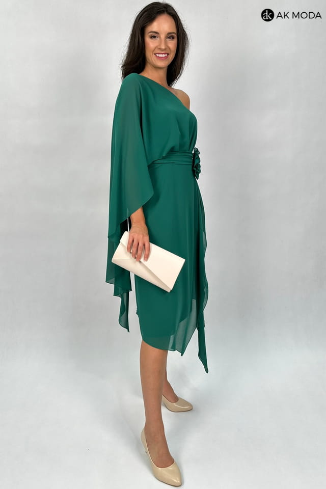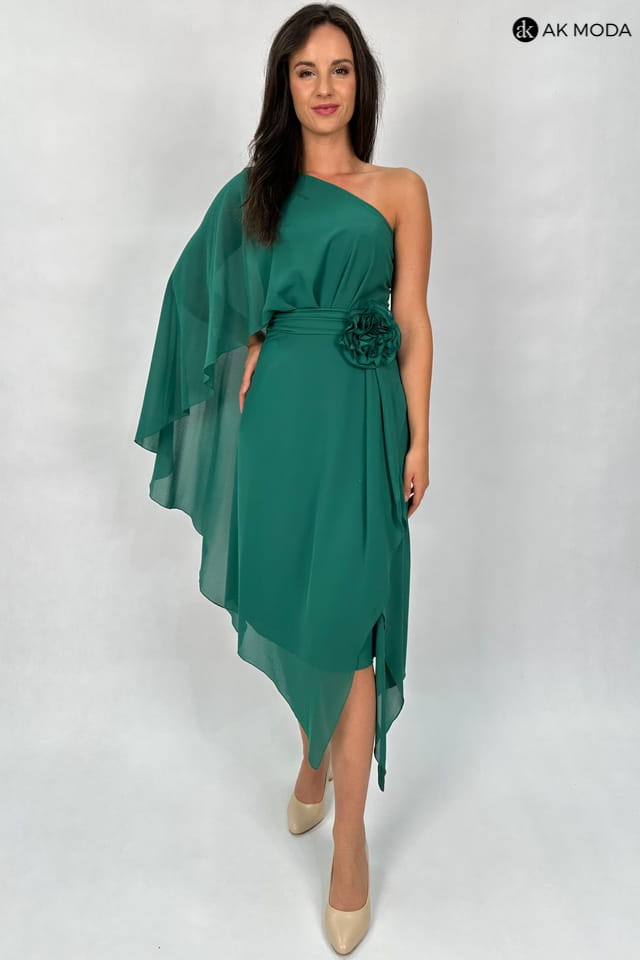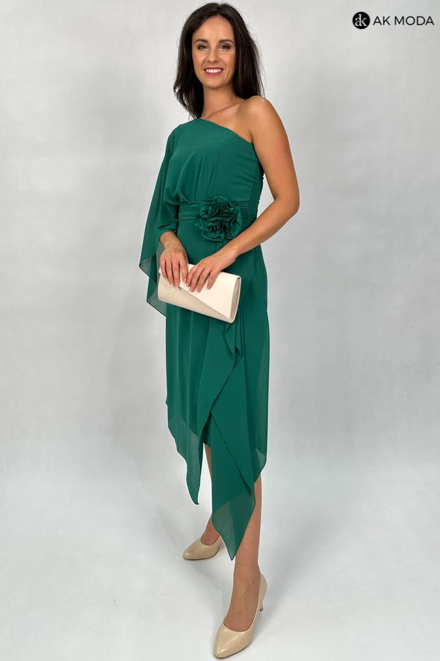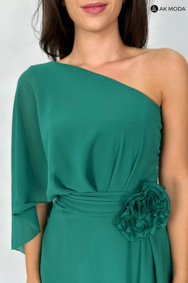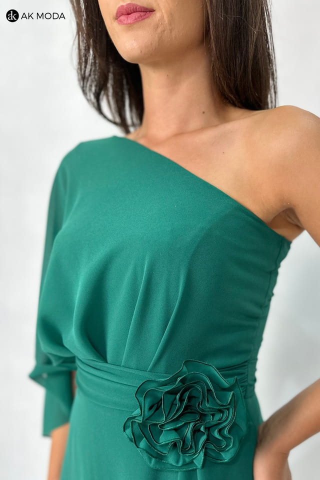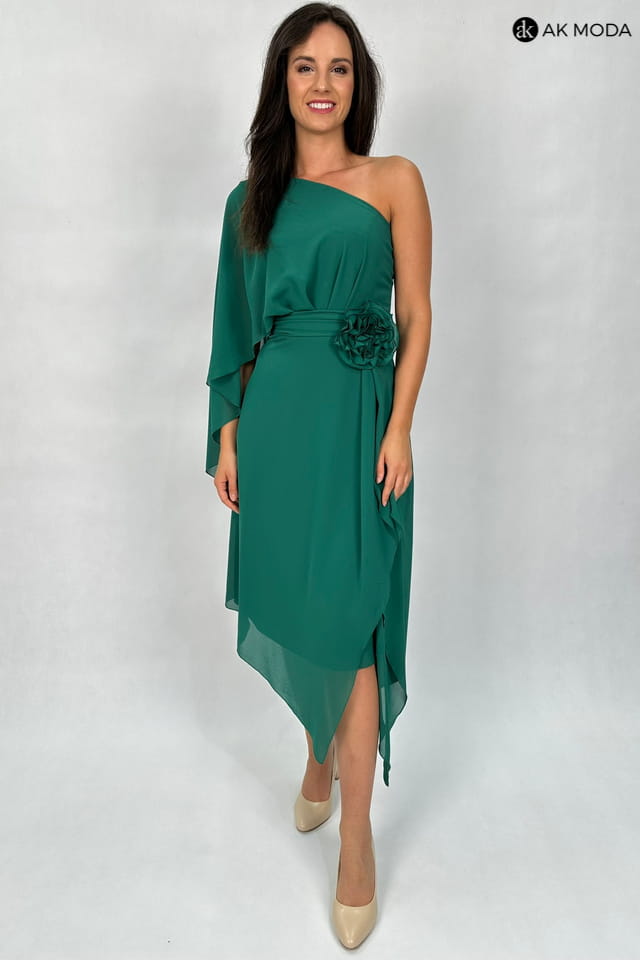 Ciemnozielona sukienka na jedno ramię z asymetrycznym dołem. Rękaw w formie luźnego, zwiewnego materiału, na ramieniu odpinany ozdobny kwiatek, w talii wiązany pasek.