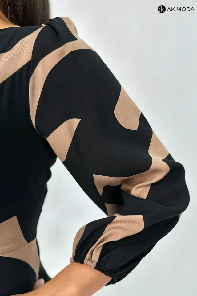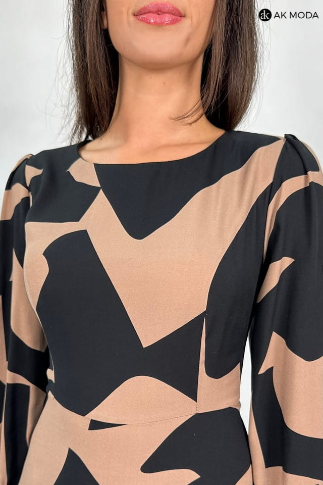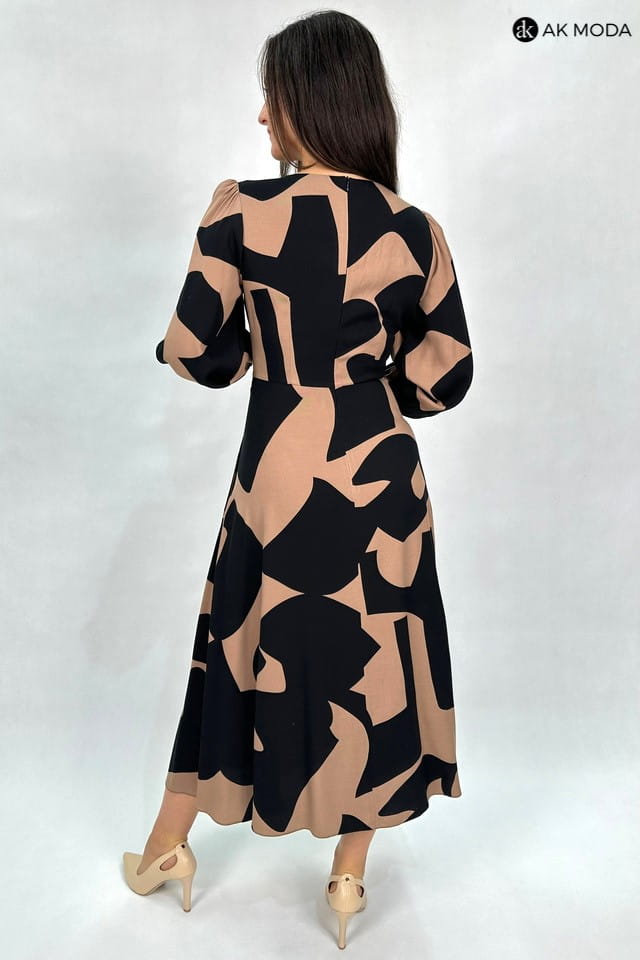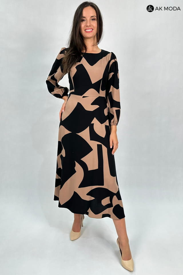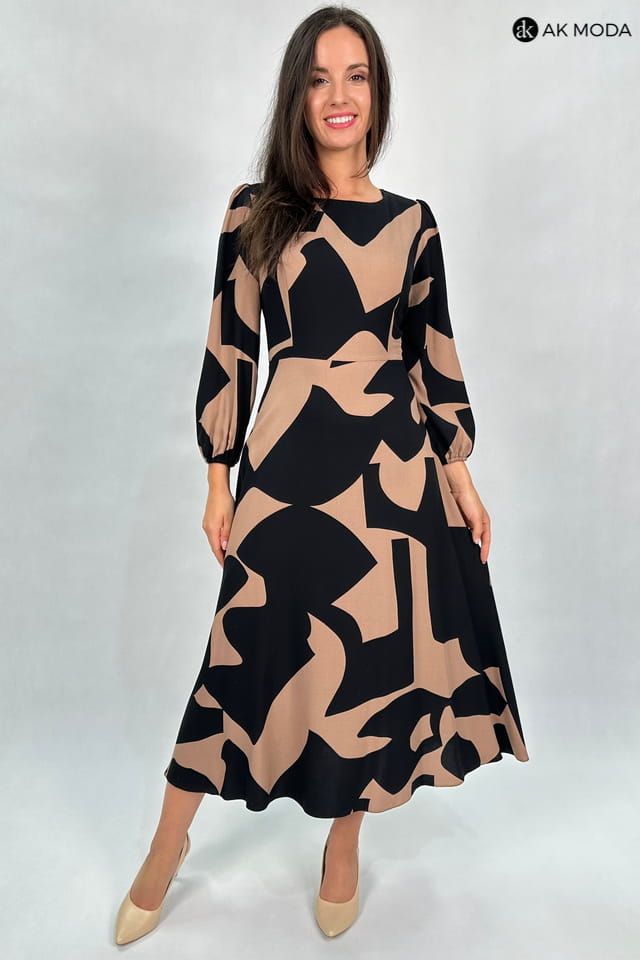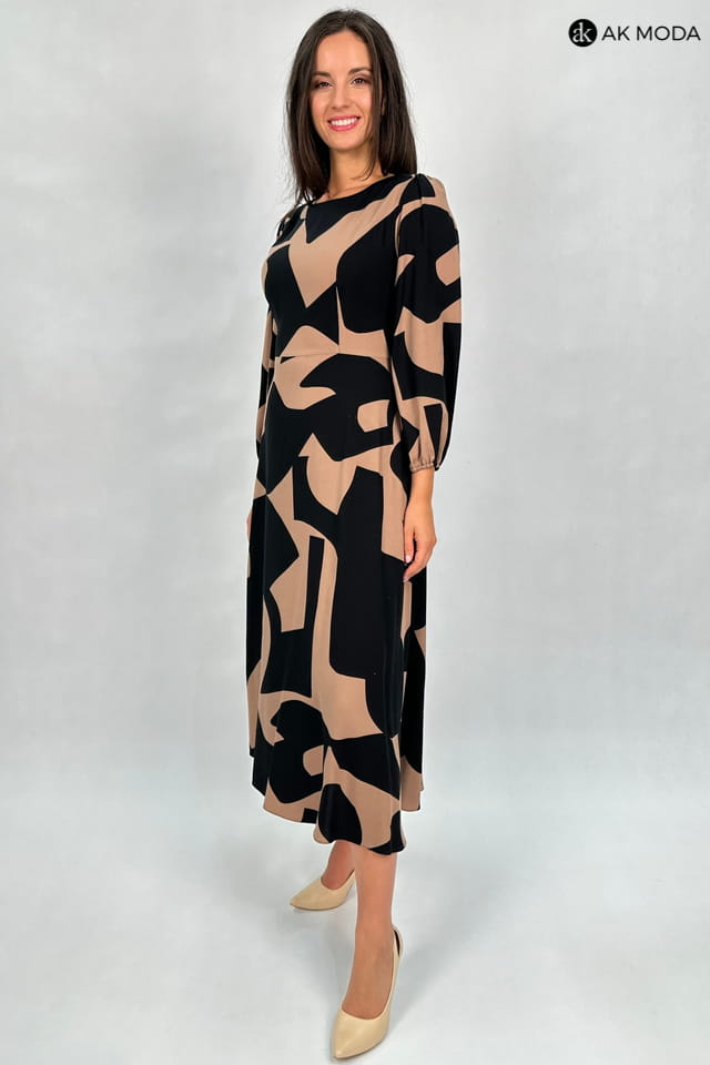 Rozkloszowana sukienka midi w czarno - brązowe wzory. Sukienka posiada kieszenie.