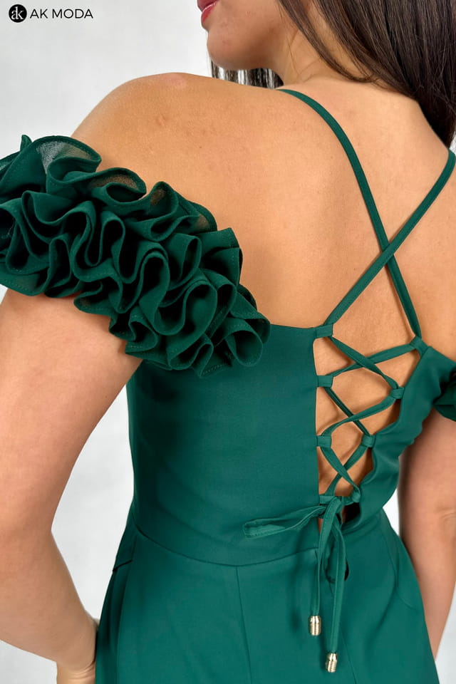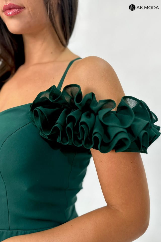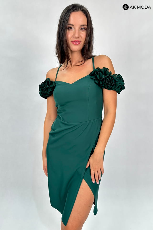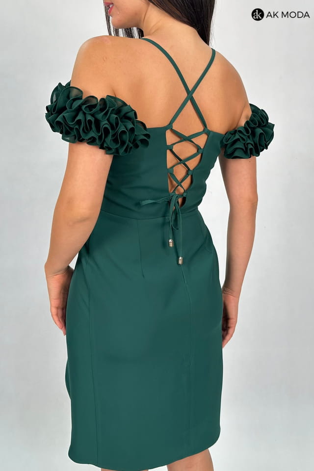 Krótka dopasowana sukienka w kolorze butelkowej zieleni z efektownym sznurowaniem na plecach. Opadające falbanki na ramionach oraz rozcięcie na nodze dodają całej stylizacji elegancji. Fason idealnie sprawdzi się na ważne uroczystości, wesele oraz studniówkę.