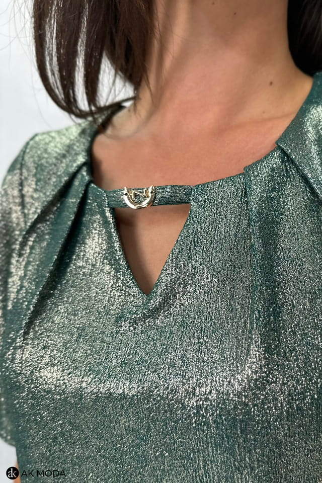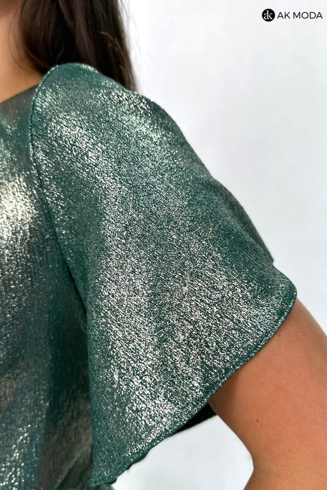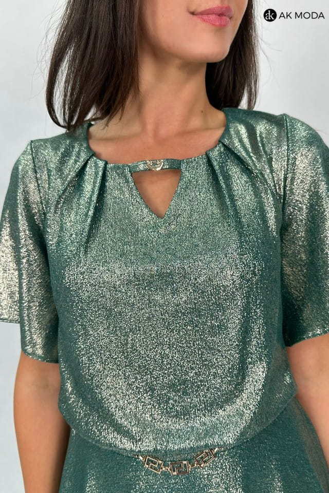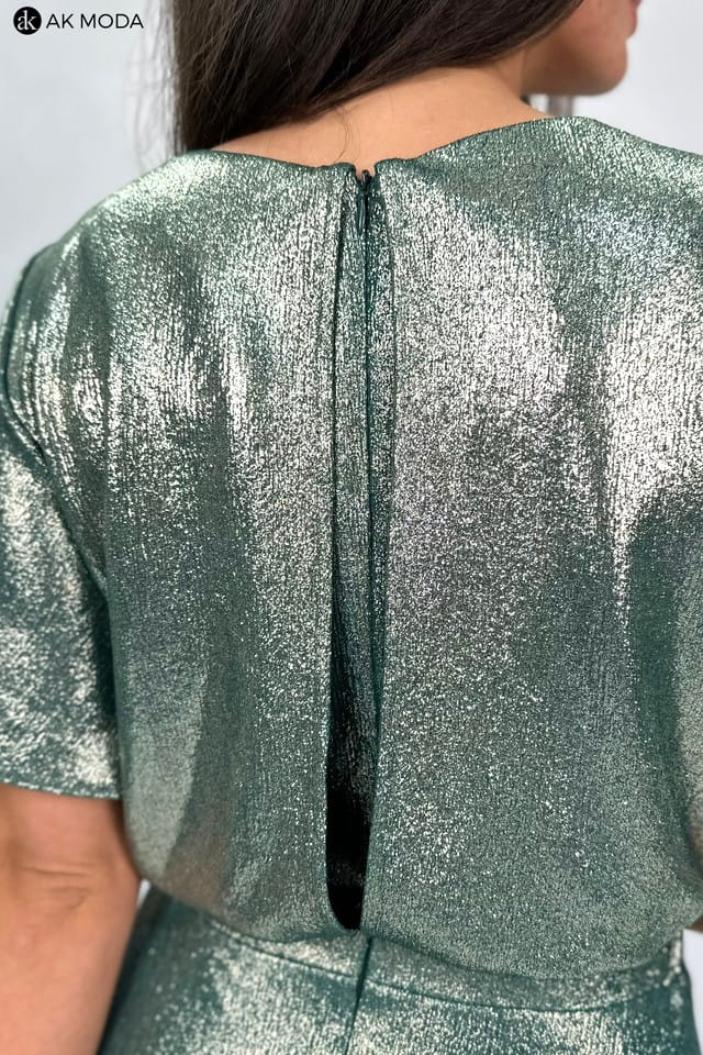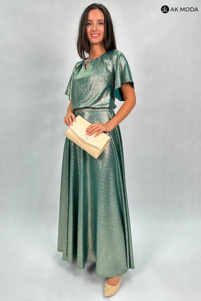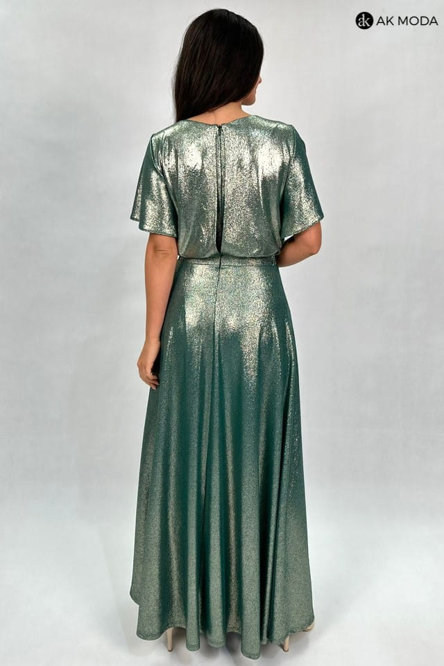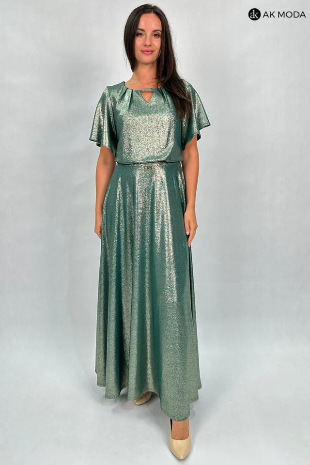 Długa rozkloszowana sukienka w kolorze zielonym ze złotym połyskiem. Krótki luźny rękaw, przy dekolcie marszczenie, w pasie po bokach gumki.