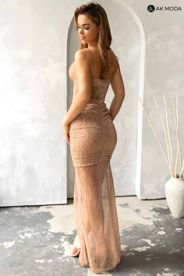 Długa dopasowana sukienka w kolorze złotym na cienkich regulowanych ramiączkach, wykonanana z błyszczącego materiału. Dół sukienki i wstawka pod biustem transparentne.
