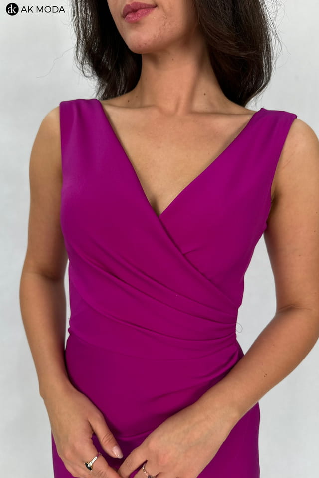 Krótka dopasowana sukienka w kolorze fioletowym na szerokich ramiączkach. Dekolt kopertowy, w pasie marszczenie, dół zakładany z rozcięciem na nodze.