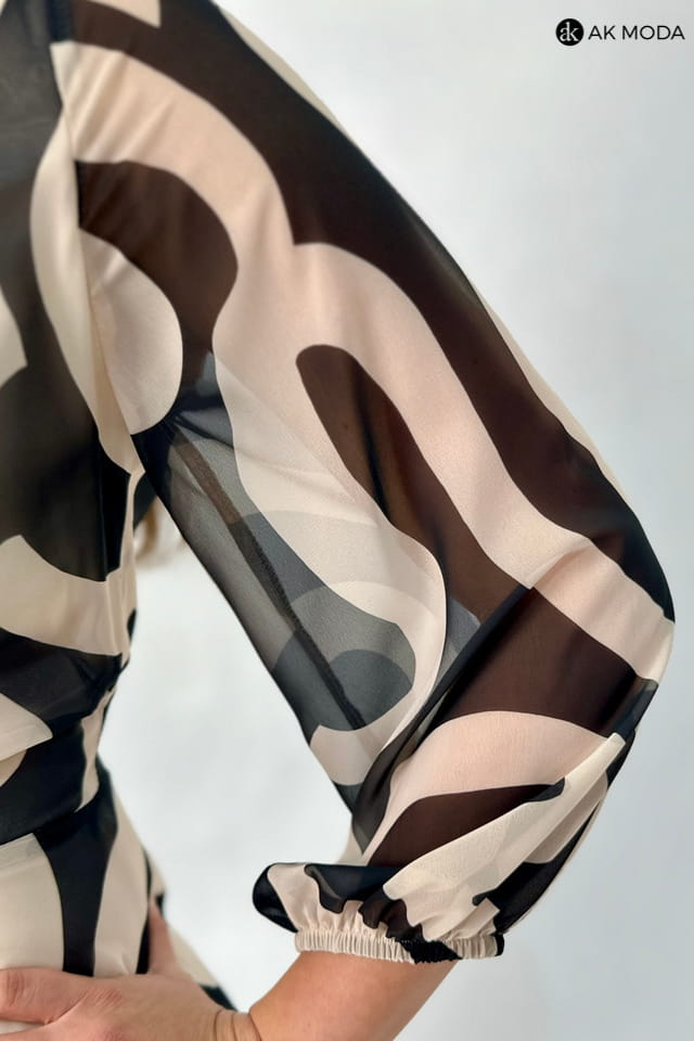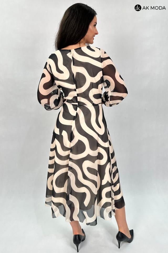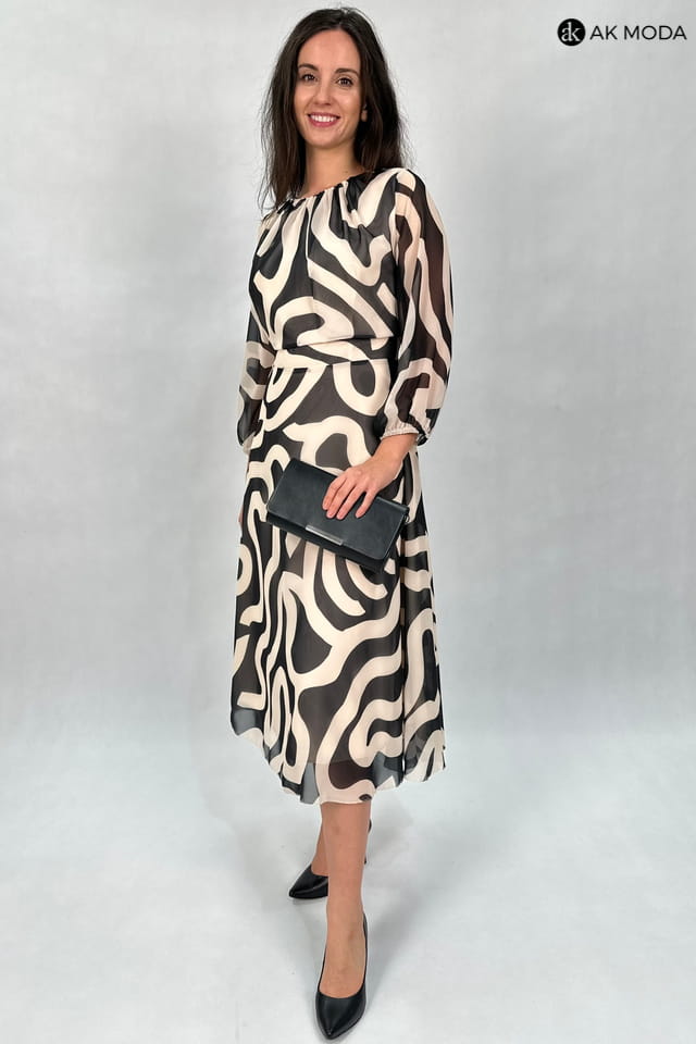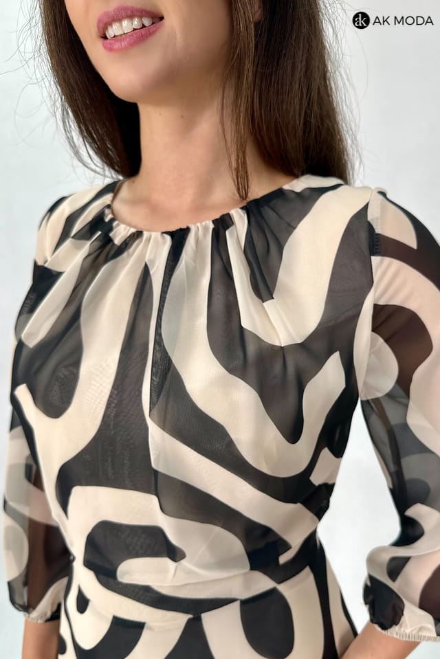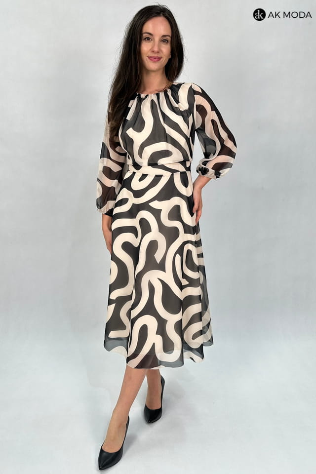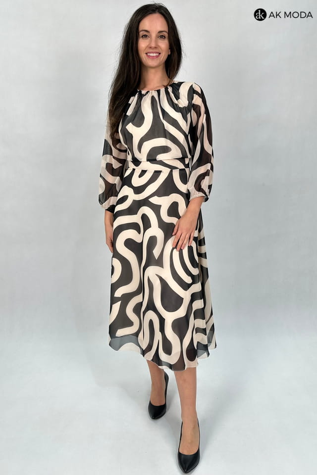 Zwiewna sukienka midi w czarno - beżowe wzory. Dekolt okrągły z ozdobnym marszczeniem, transparentne rękawy 3/4 zakończone gumką. Fason rozkloszowany z luźniejszą górą.