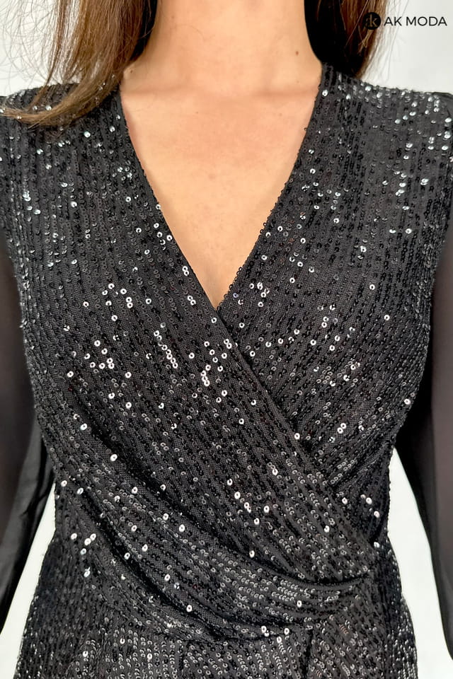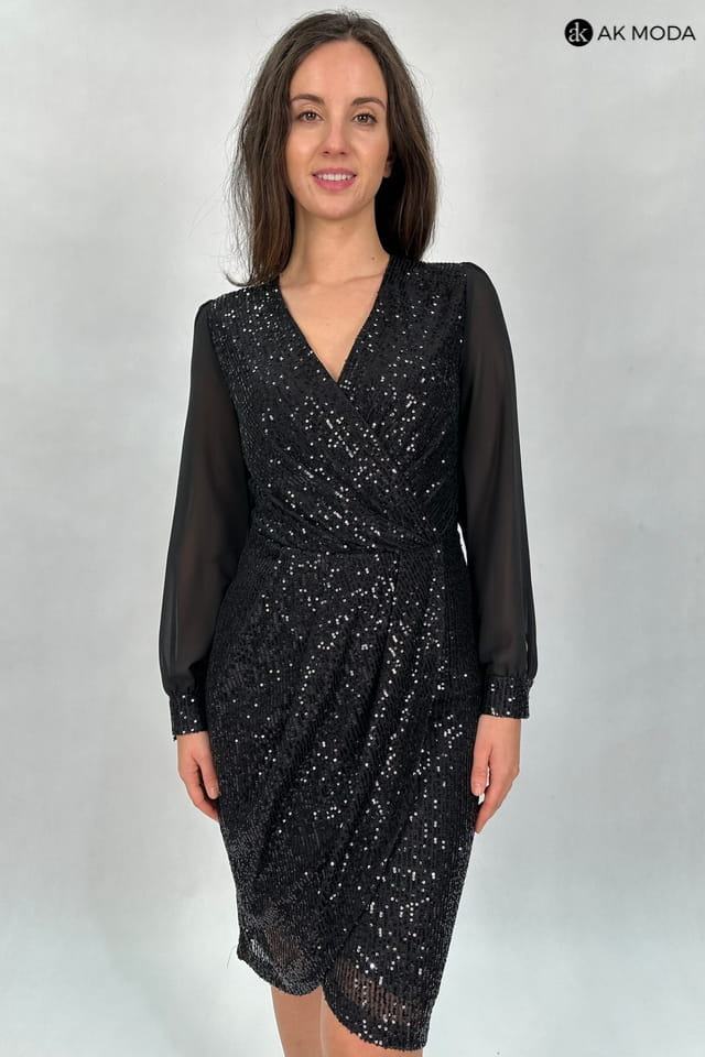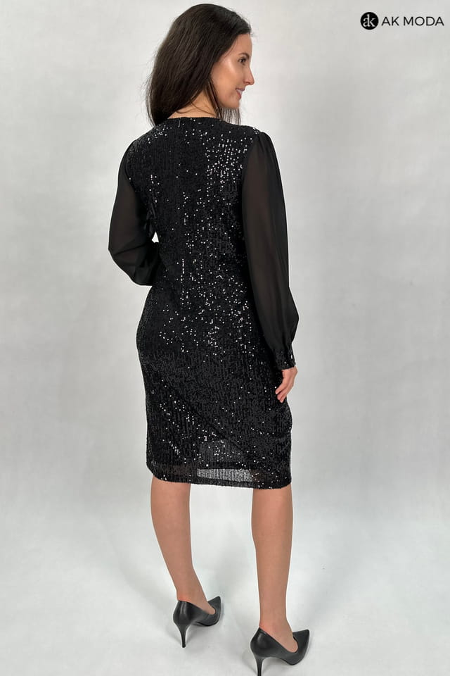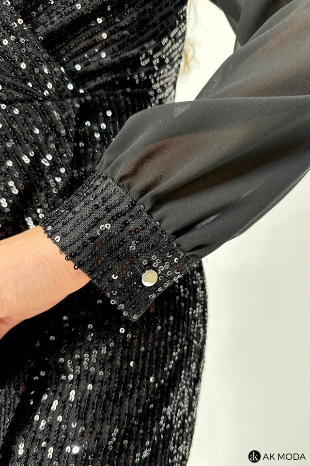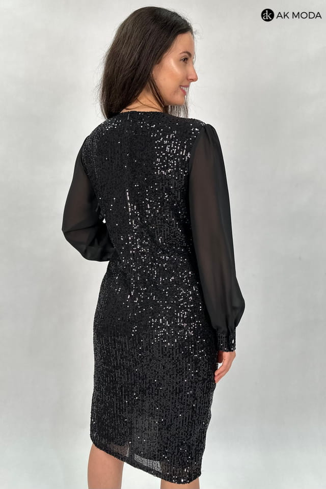 Czarna, dopasowana sukienka, wyszywana błyszczącymi cekinami. Długie, transparentne rękawy, zakończone zapinanymi mankietami, dekolt kopertowy, dół zakładany.