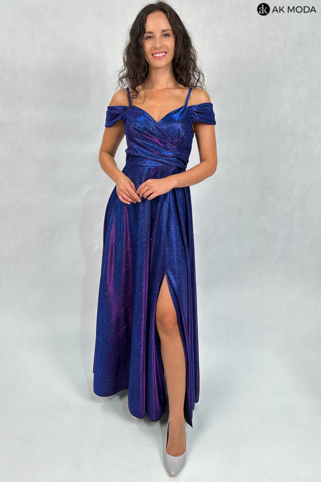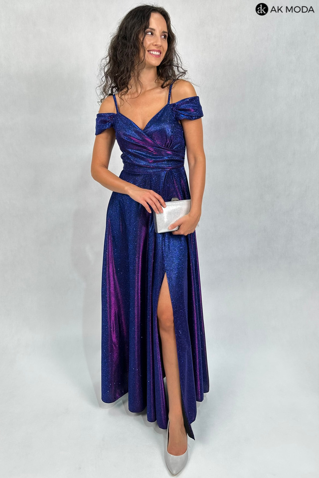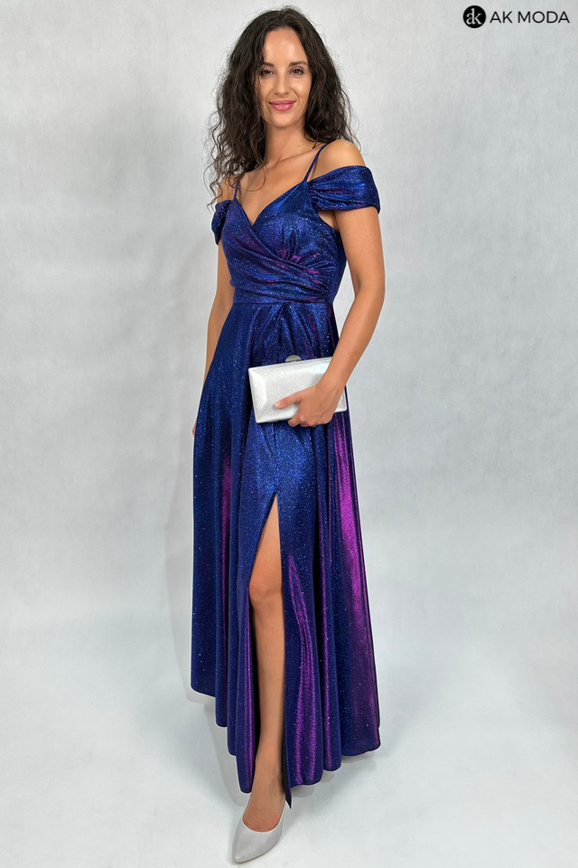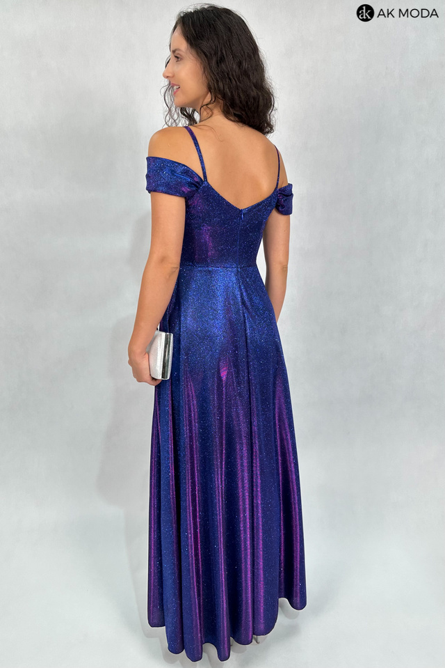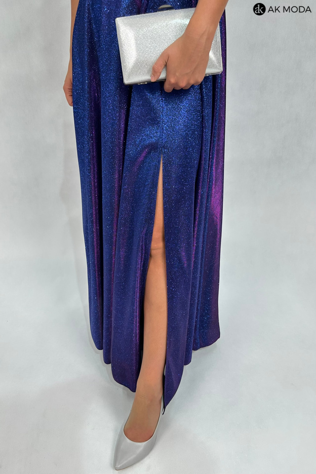 Długa, rozkloszowana sukienka w kolorze granatowym z różową poświatą na cienkich szelkach. Dekolt kopertowy - dopasowuje się do biustu, opadające ramiona, z boku rozcięcie. Sukienka uszyta z brokatowego materiału.