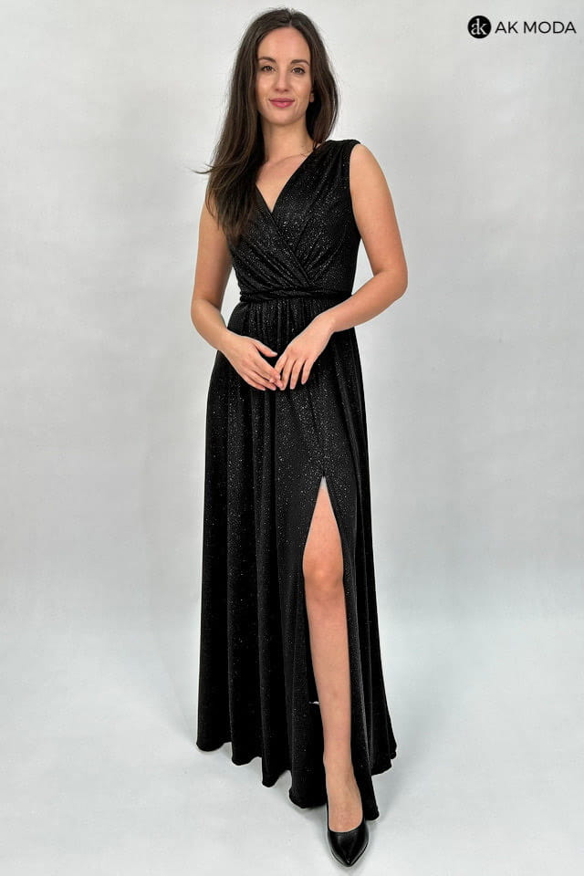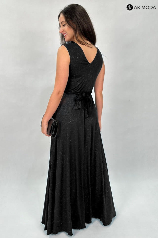 Długa rozkloszowana sukienka w kolorze czarnym z rozcięciem na nogę. Dekolt kopertowy, w pasie gumka. W komplecie dwa wiązane paski. Sukienka uszyta z elastycznego, brokatowego materiału.
