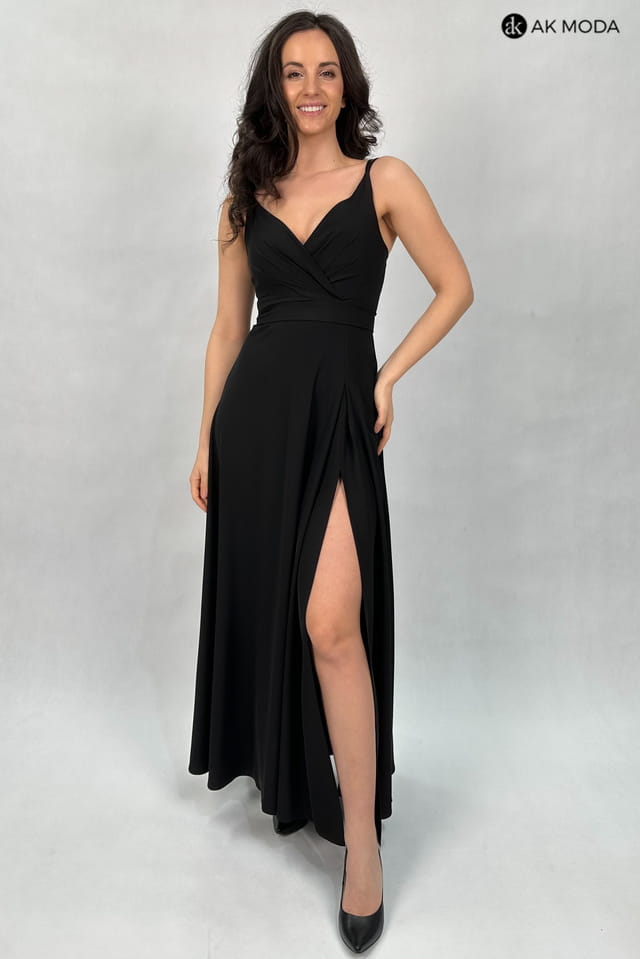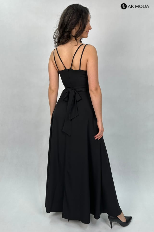 Długa, rozkloszowana sukienka w kolorze czarnym. Dekolt kopertowy, podwójne ramiączka, w talii wiązany pasek.
