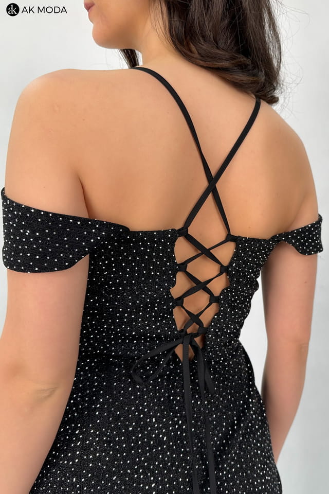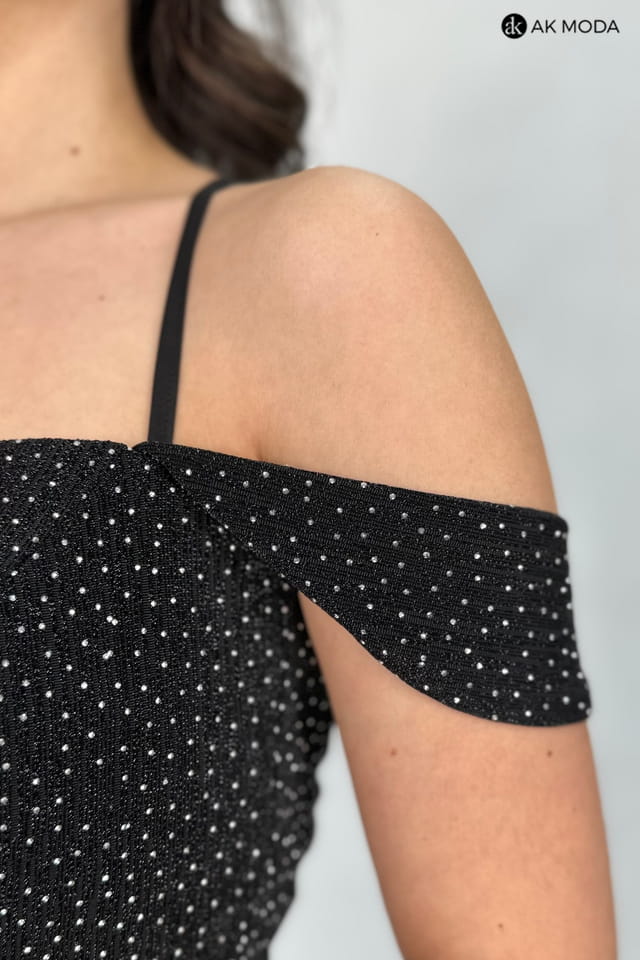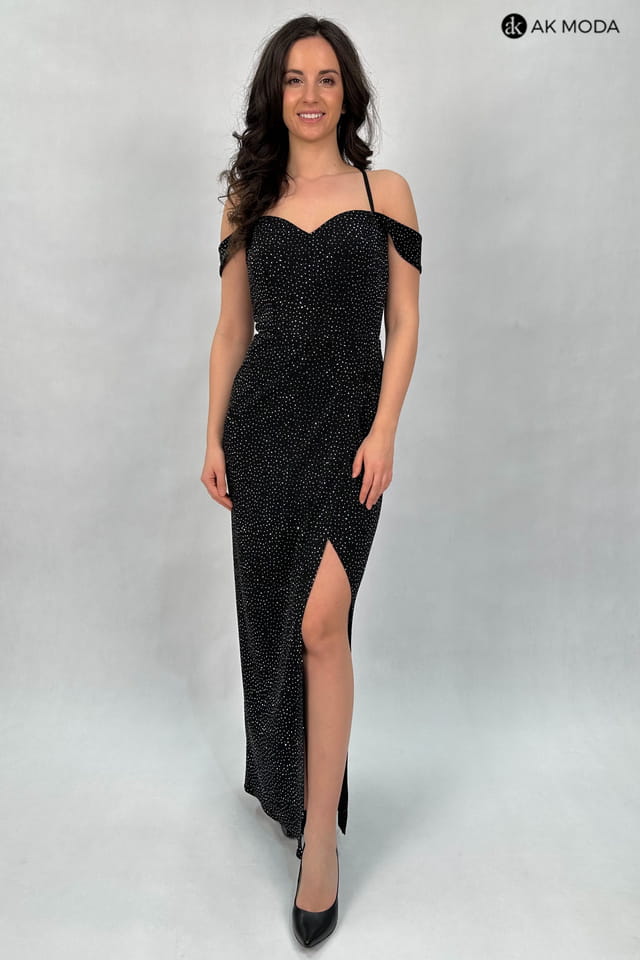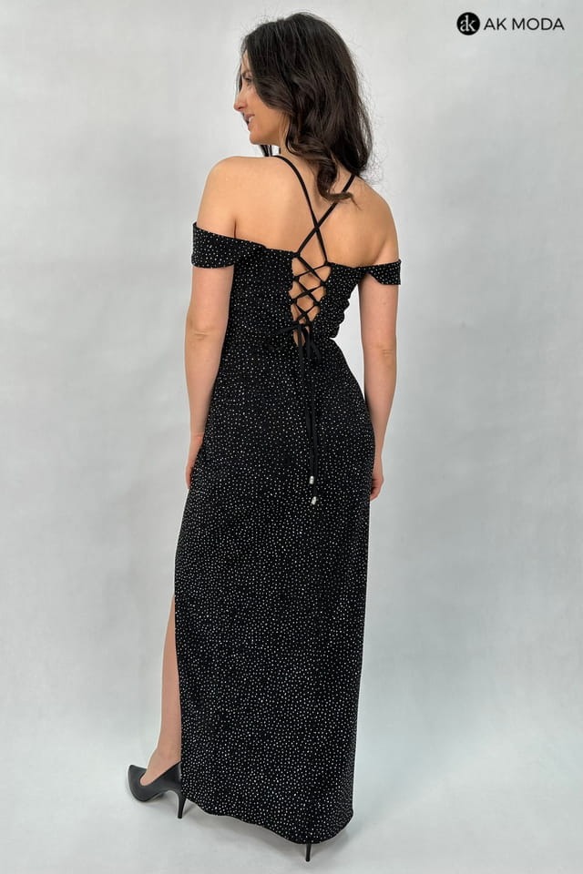 Elegancka sukienka maxi w kolorze czarnym, na grubych ramiączkach, z zakładanym dołem. Dekolt w kształcie serca, sznurowanie na plecach. Sukienka uszyta z delikatnie błyszczącego, elastycznego materiału, w całości zdobionego srebrnymi kamyczkami.