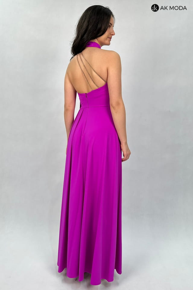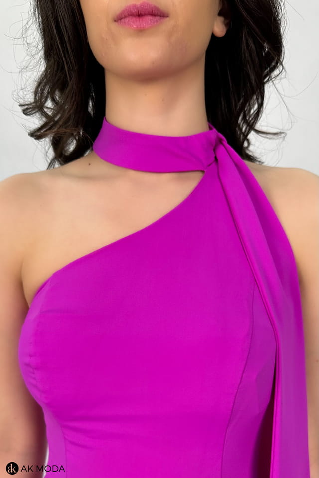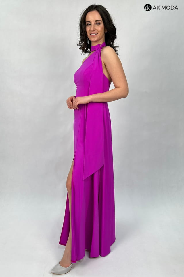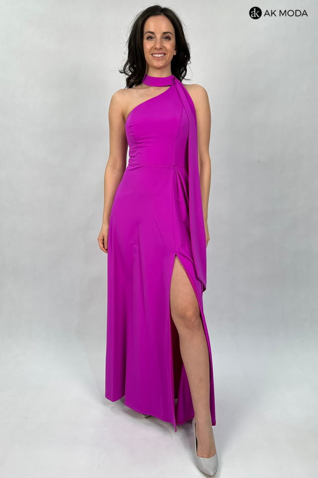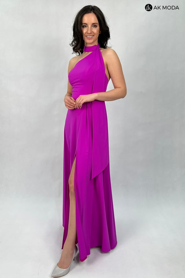 Elegancka, długa sukienka na jedno ramię w kolorze fioletowym z ozdobną szarfą zapinaną na szyi. Dół rozkloszowany z rozcięciem z boku, na plecach wszyte błyszczące sznurki w kolorze złota. Sukienka uszyta z elastycznego materiału.