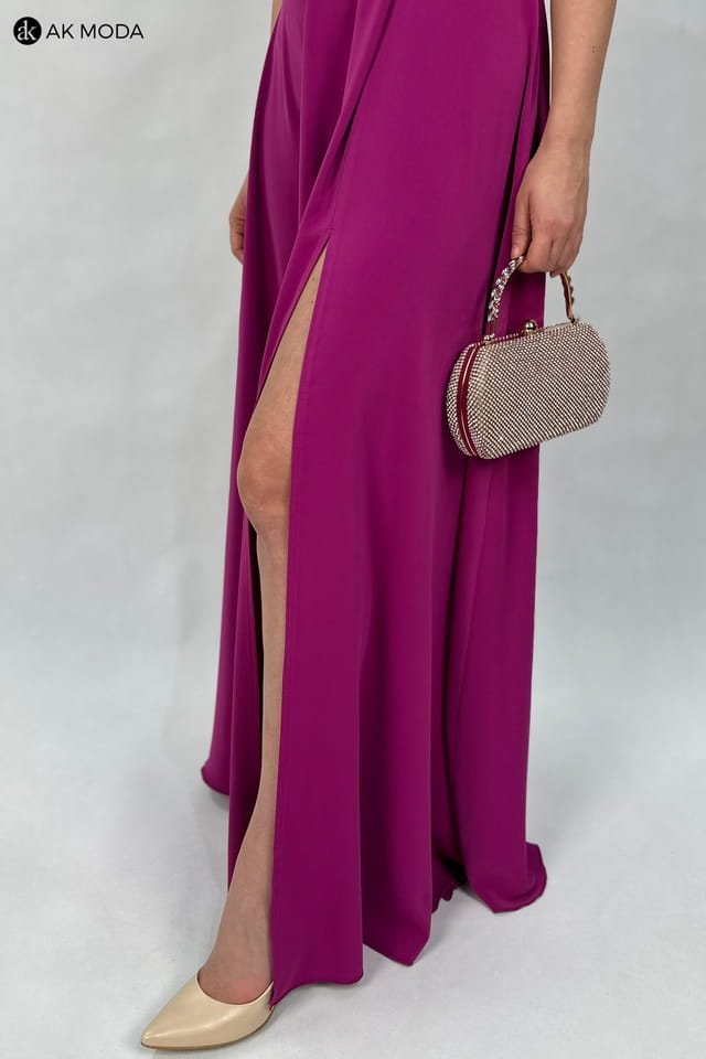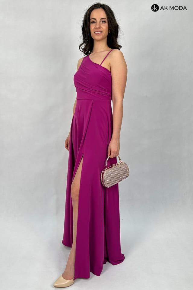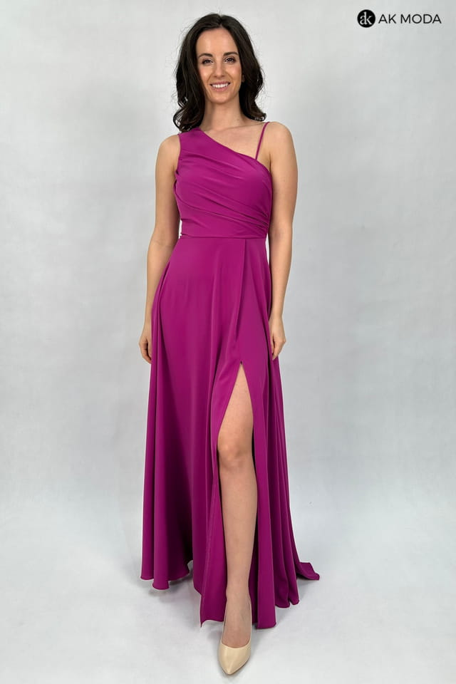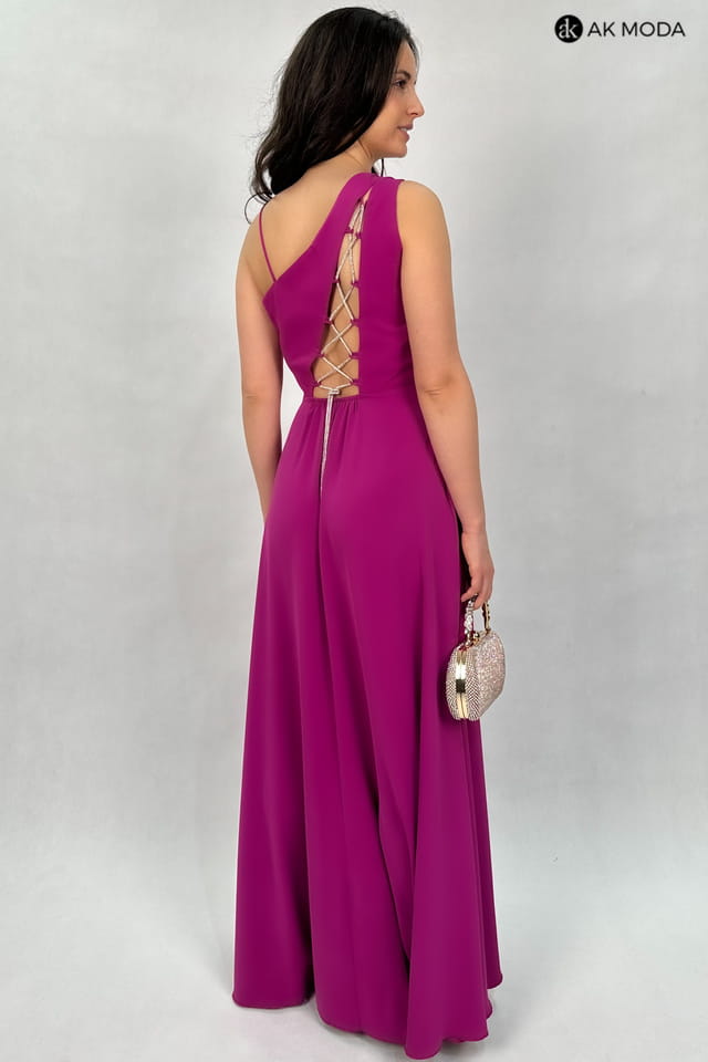 Elegancka sukienka maxi na jedno ramię, w kolorze fioletowym, z efektownym sznurowaniem na plecach. Góra luźniejsza, dół rozkloszowany z rozcięciem z boku, z tyłu w pasie gumka. W zestawie dwa sznurki do wiązania na plecach, ozdobny brokatowy oraz gładki, w kolorze sukienki.