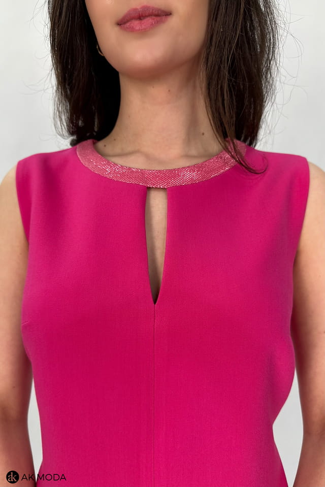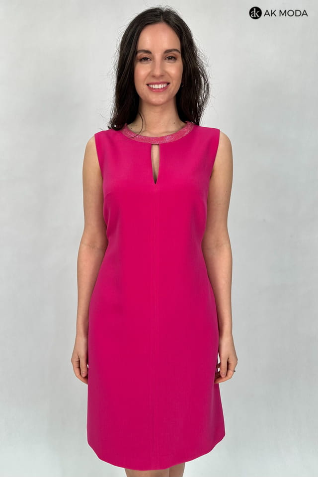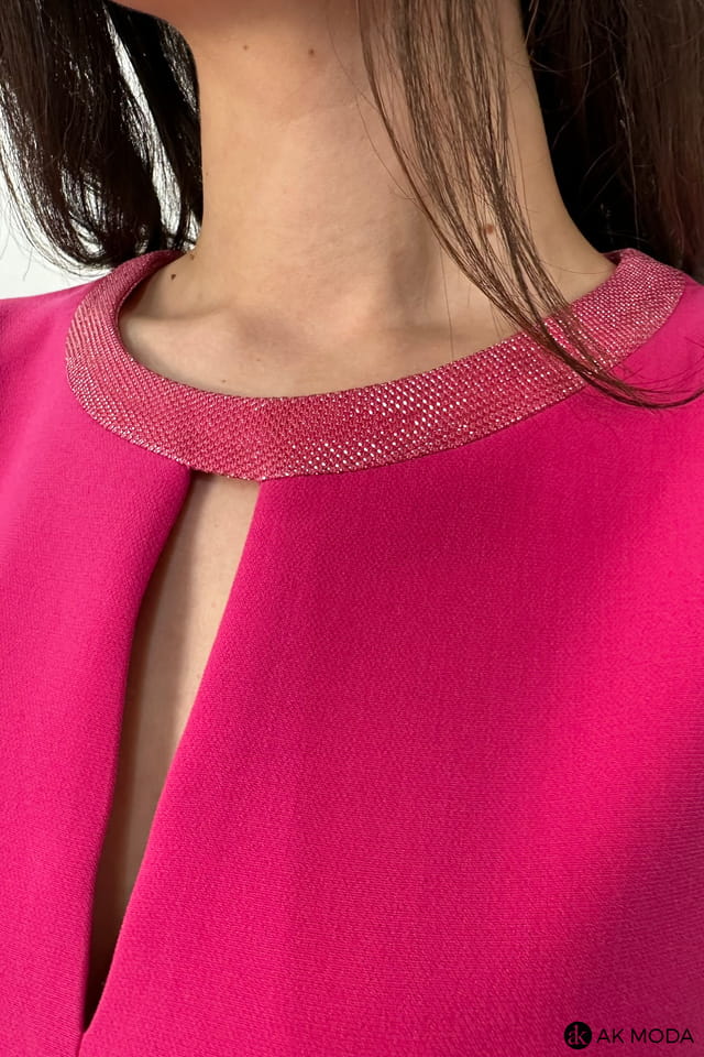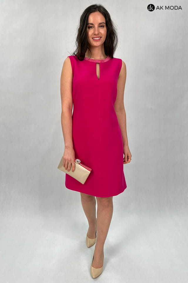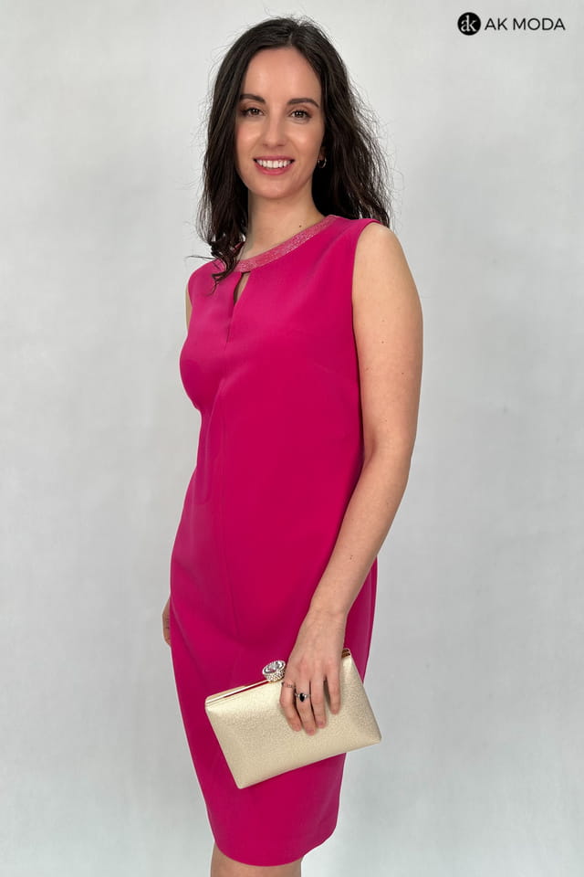 Elegancka, prosta sukienka mini w kolorze fuksjowym. Dekolt okrągły z pęknięciem, obszyty błyszczącym materiałem.
