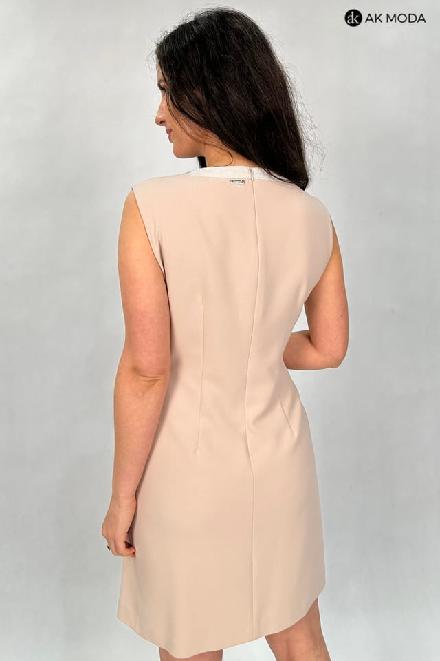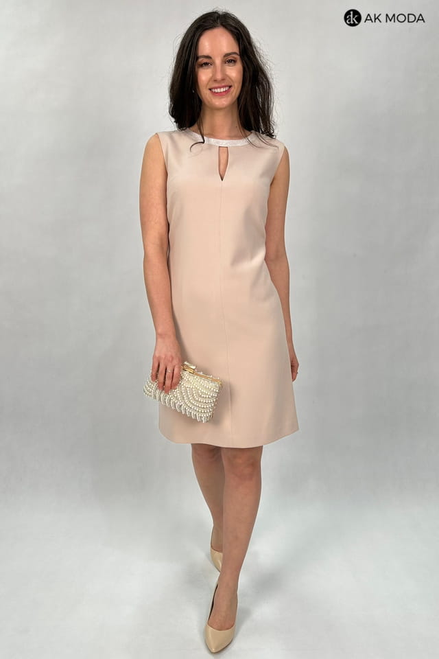 Elegancka, prosta sukienka mini w kolorze beżowym. Dekolt okrągły z pęknięciem, obszyty błyszczącym materiałem.