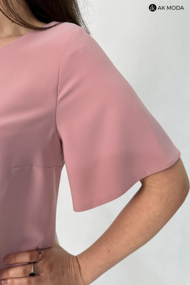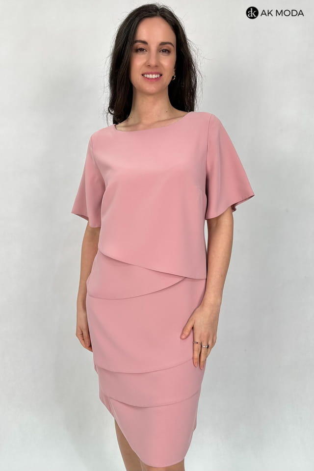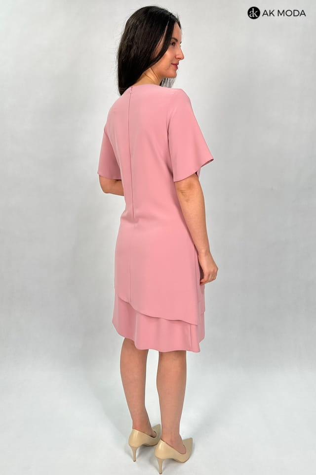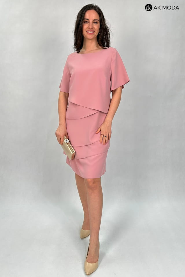Elegancka sukienka w kolorze pudrowego różu, uszyta z asymetrycznych, warstwowych falban. Luźny, prosty fason z krótkimi rękawkami i okragłym dekoltem.
