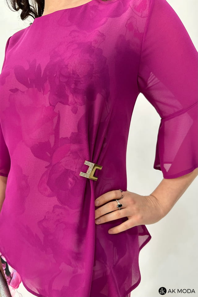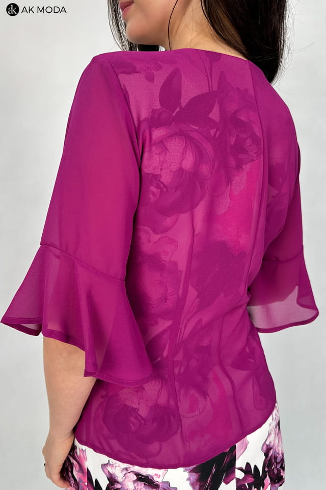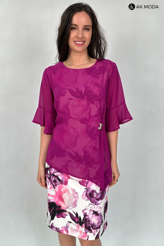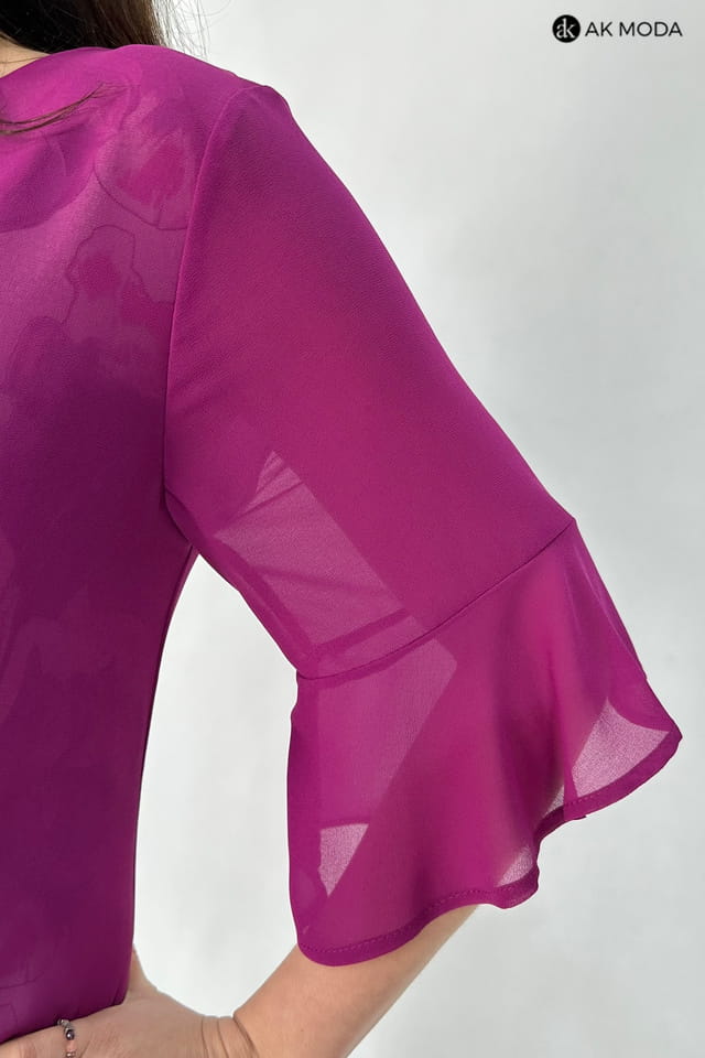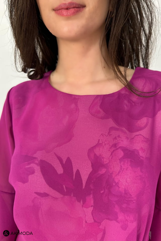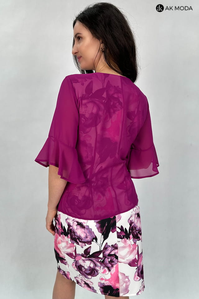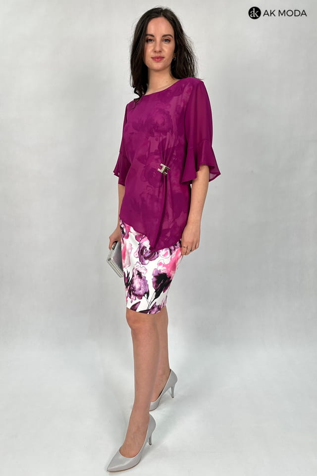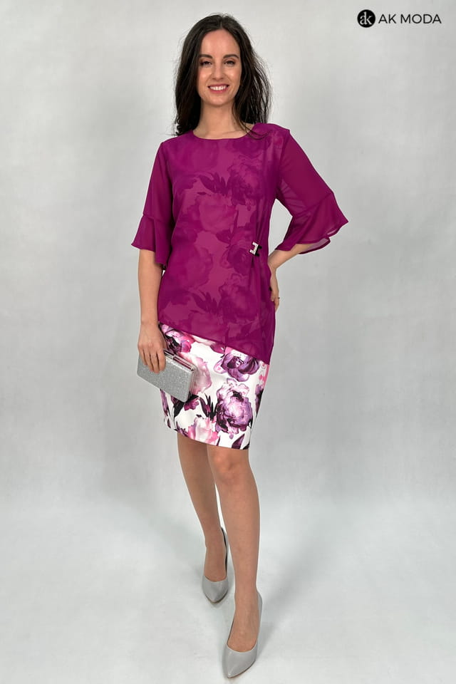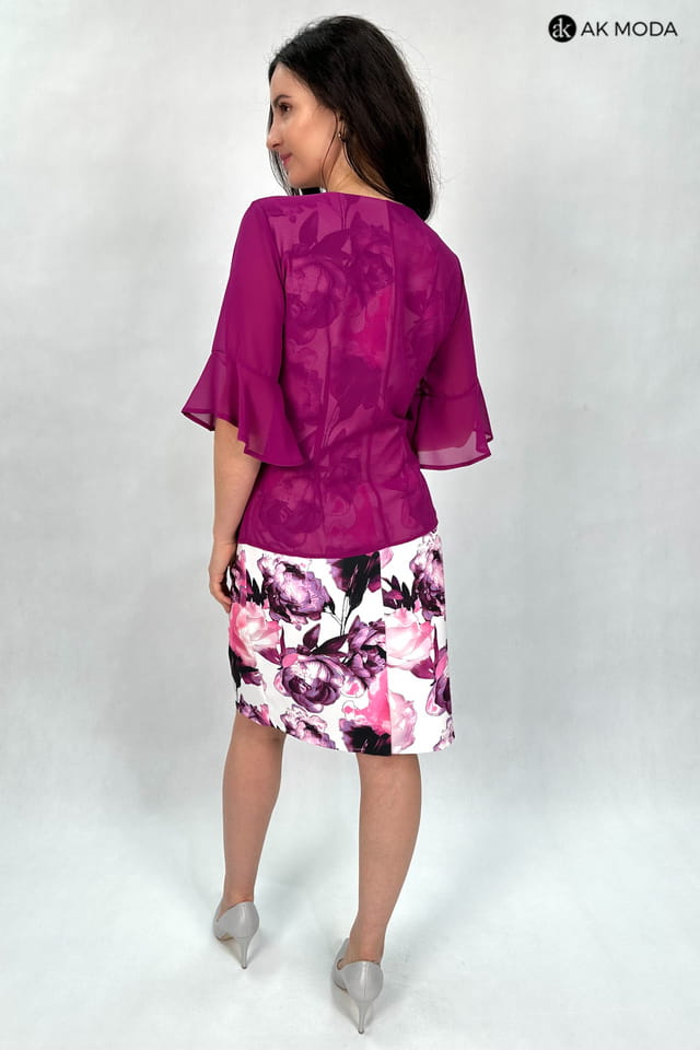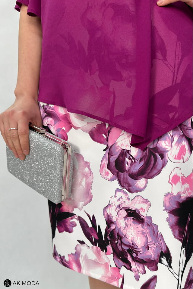 Krótka, kwiecista sukienka utrzymana w różowo-fioletowej kolorystyce. Fason dopasowany, z luźną transparentną narzutką z krótkimi rękawami w kolorze fioletowym.