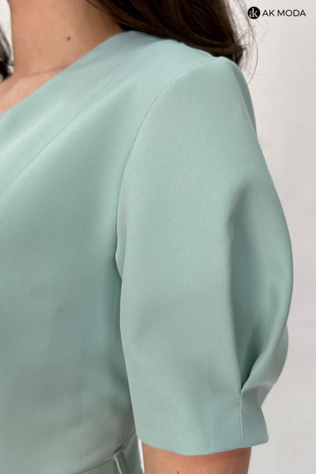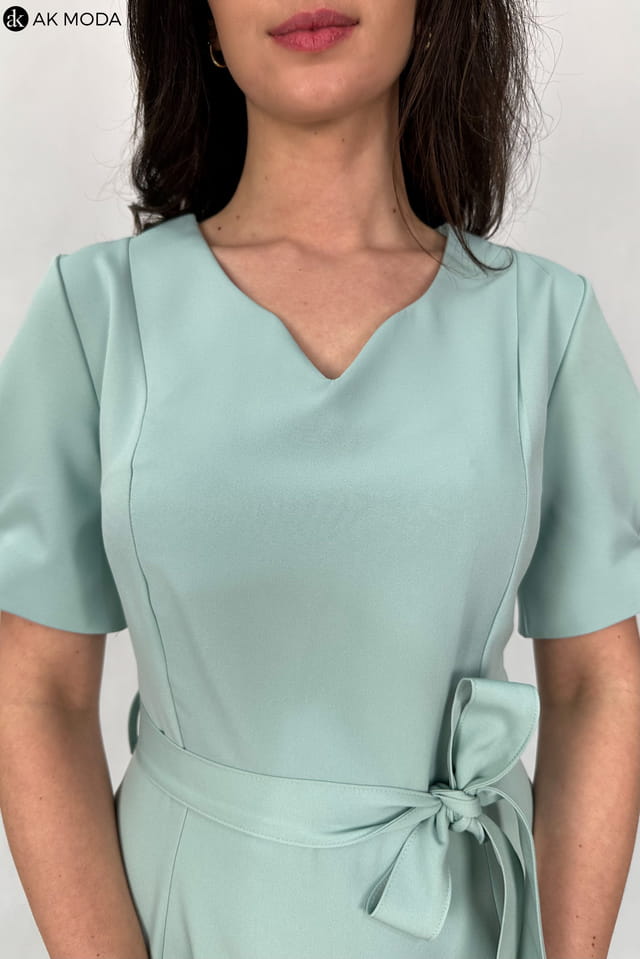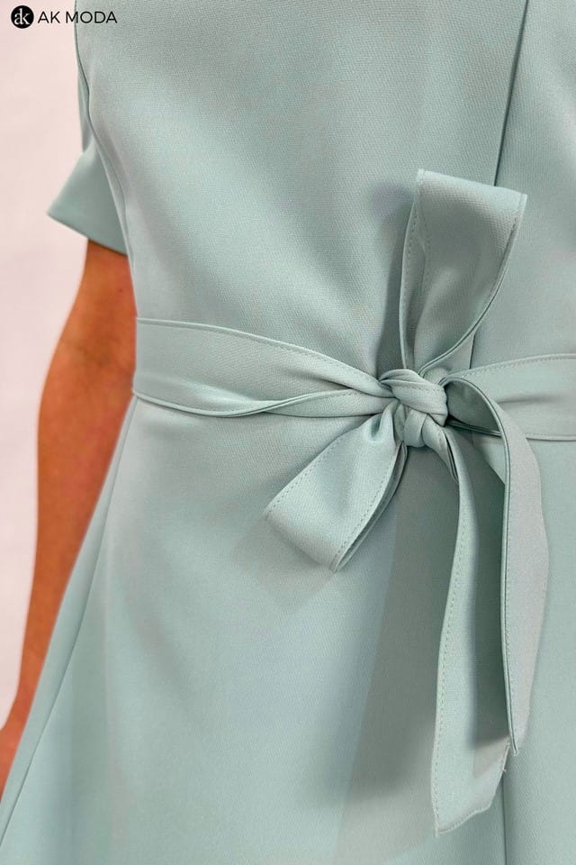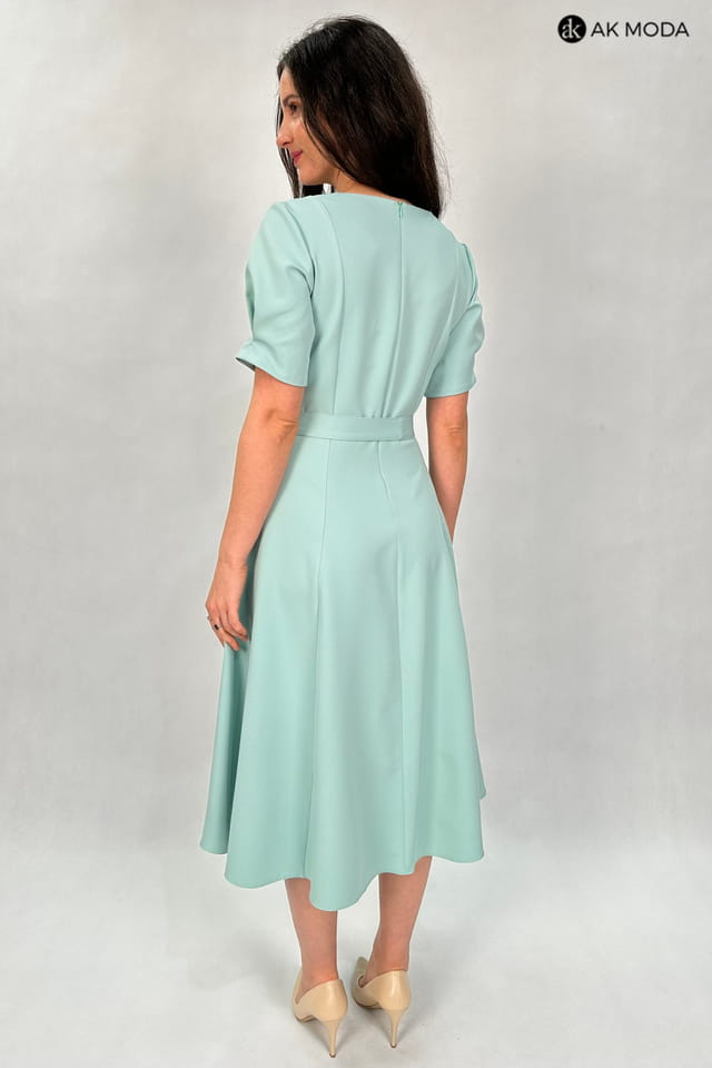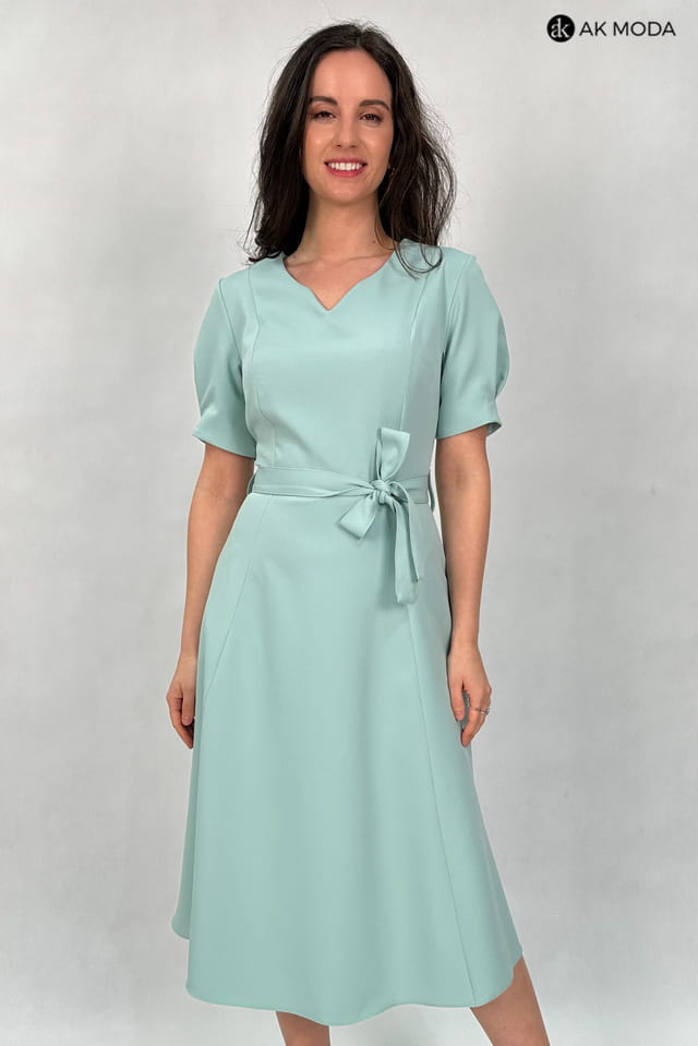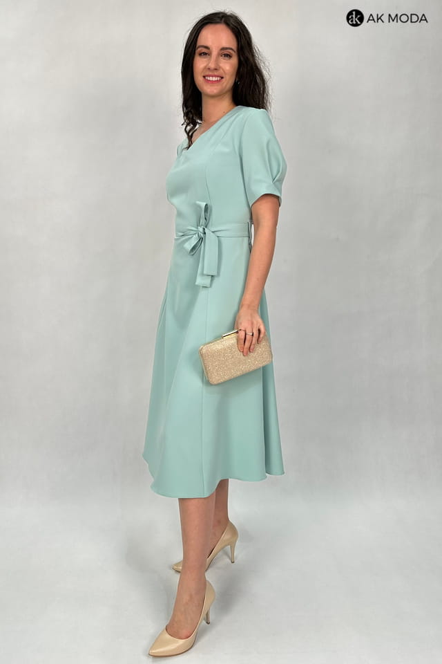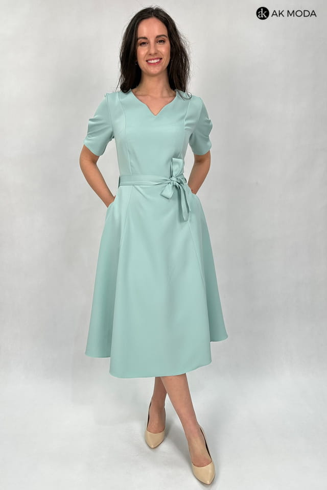 Elegancka sukienka midi w kolorze miętowym z krótkimi rękawami i dekoltem w szpic. Fason rozkloszowany, z kieszeniami, w talii wiązany pasek.