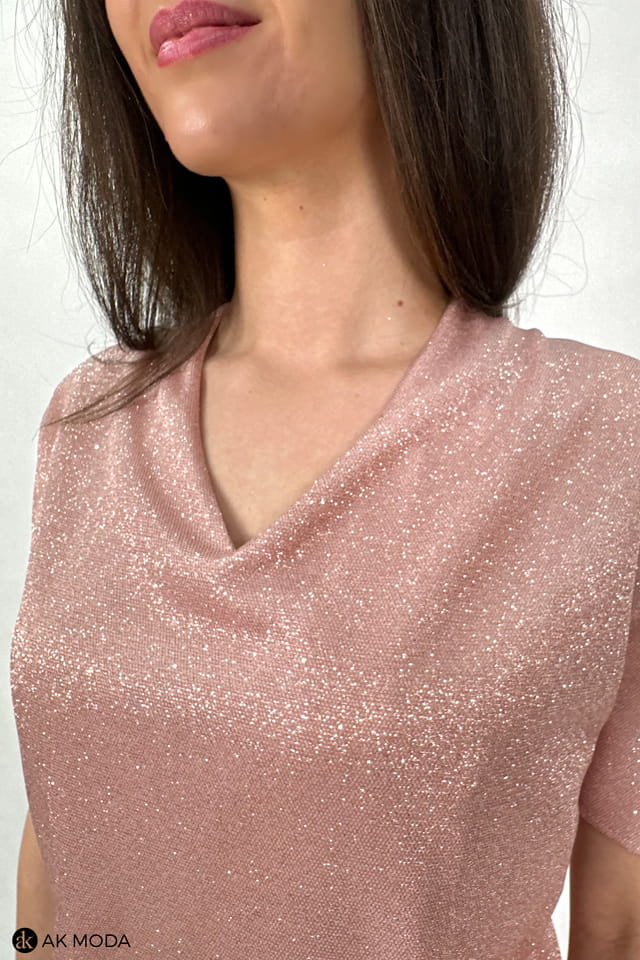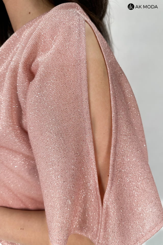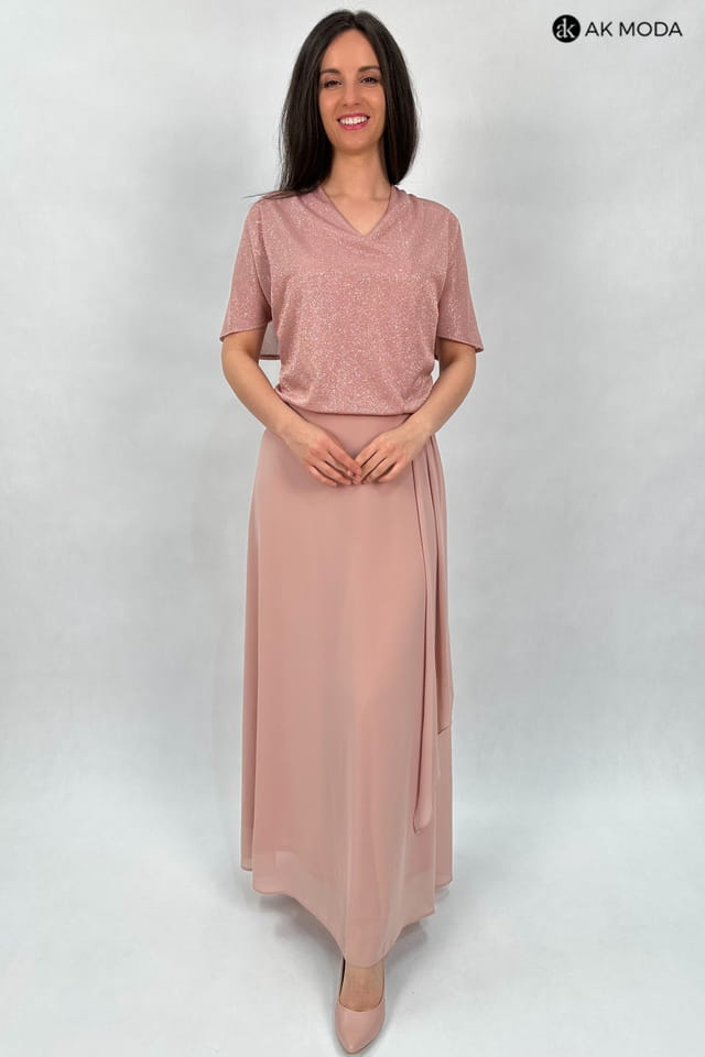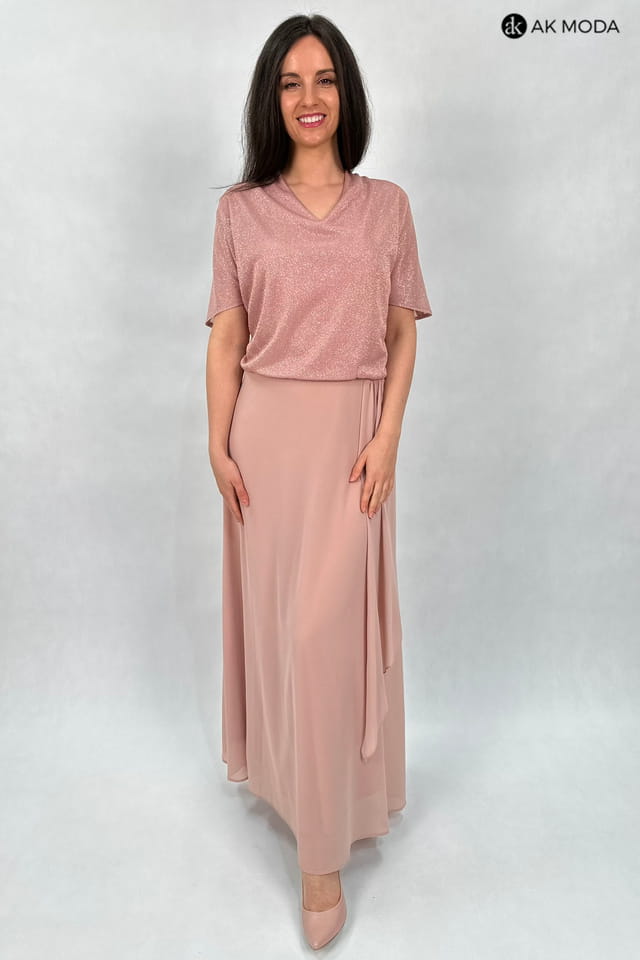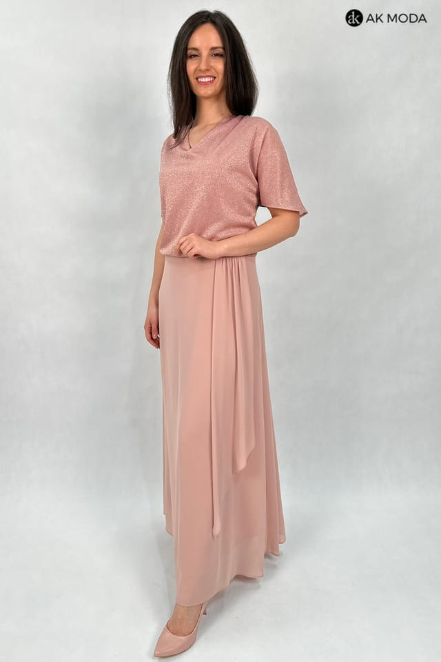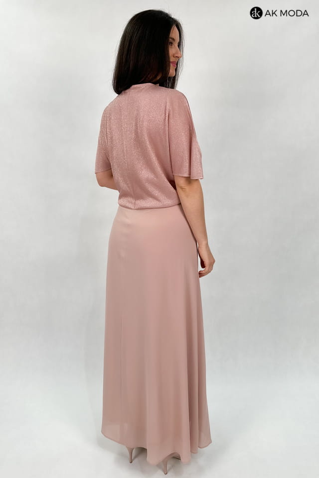 Długa, rozkloszwana sukienka w kolorze brudnego pudrowego różu z błyszczącą górą i tiulowym dołem. Dekolt w szpic, krótkie kimonowe rękawki z pęknięciami, góra luźniejsza, elastyczna.