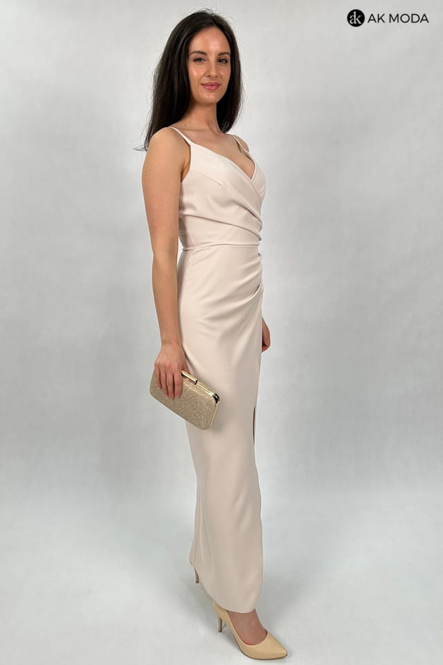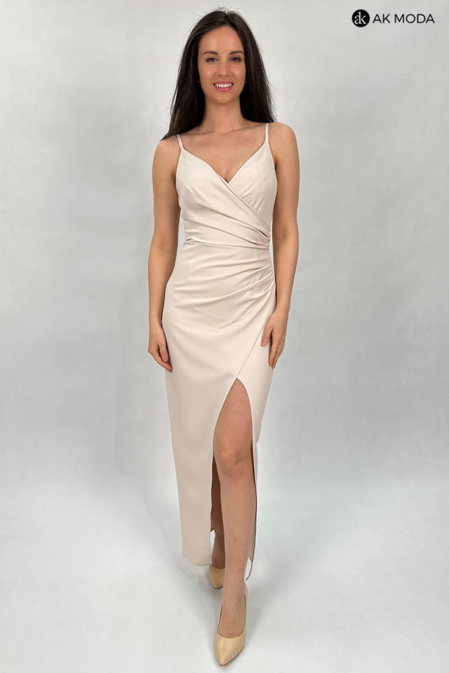Prosta, długa sukienka na cienkich ramiączkach, w kolorze beżowym z rozcięciem na nodze. Dekolt kopertowy, w pasie marszczenie.