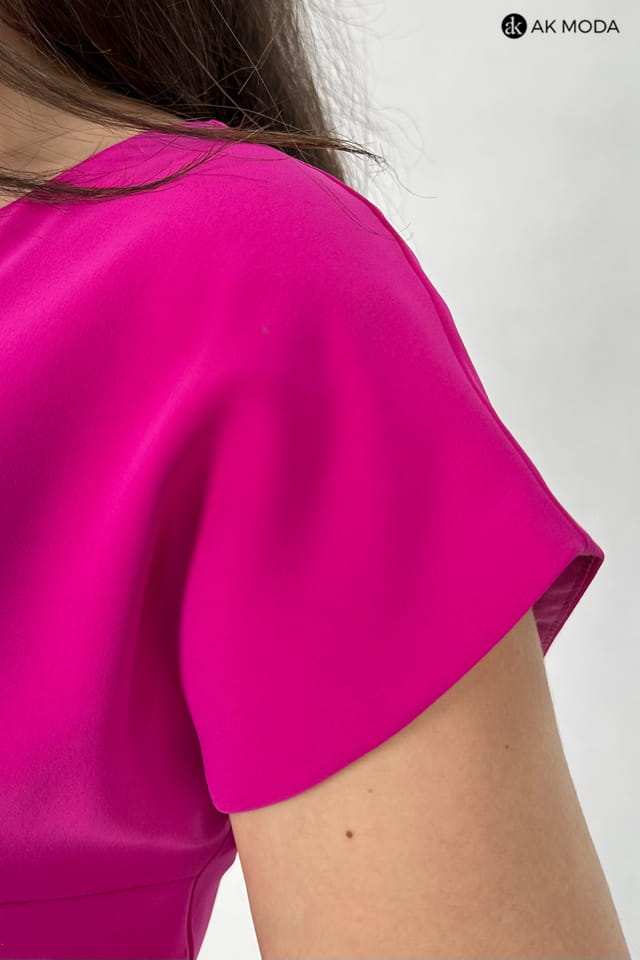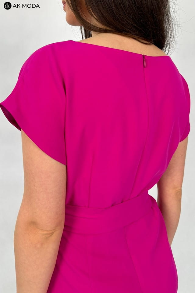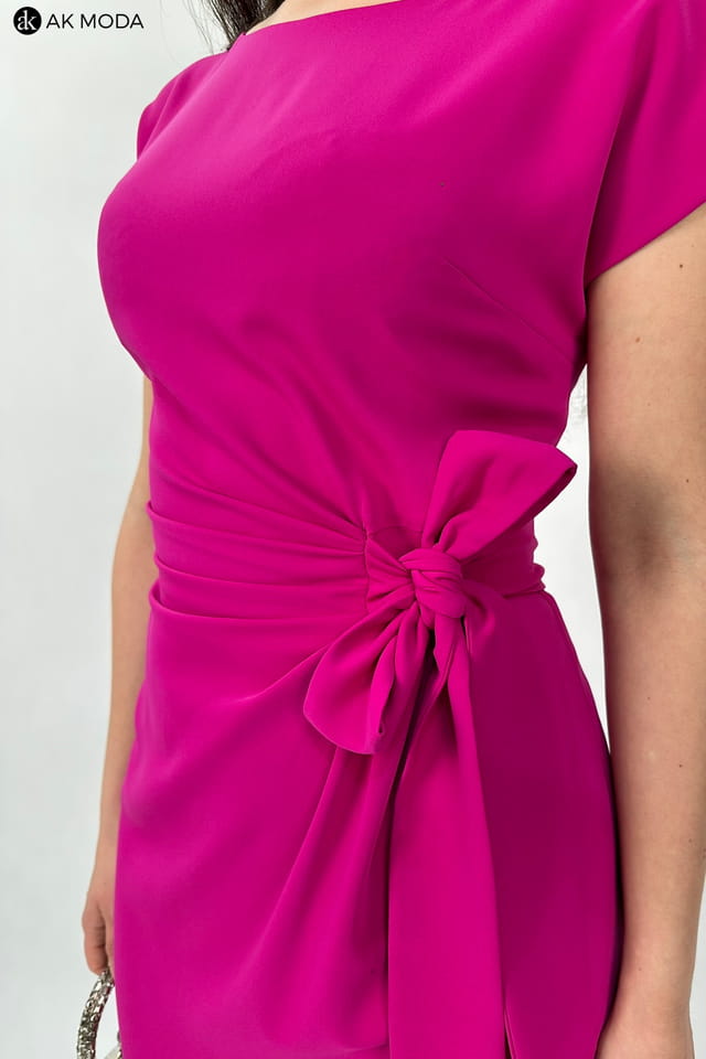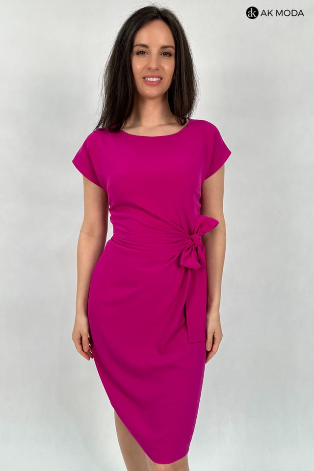 Elegancka, dopasowana sukienka w kolorze różowym, z marszczeniem i wiązaniem w talii. Dekolt okrągły, krótkie rękawy.