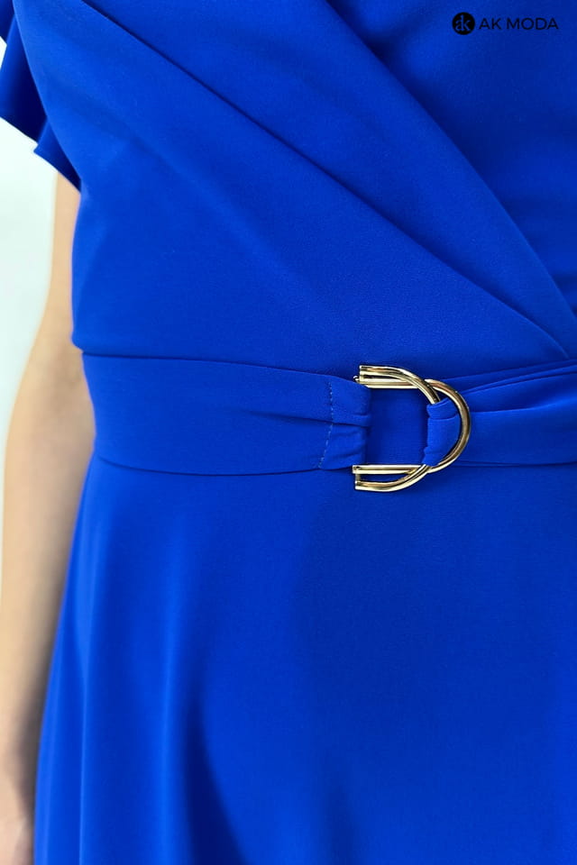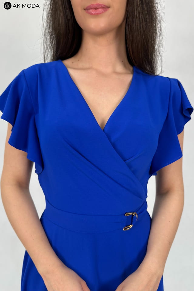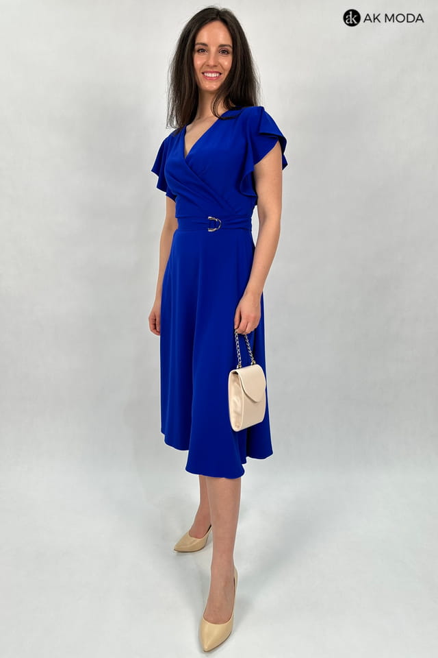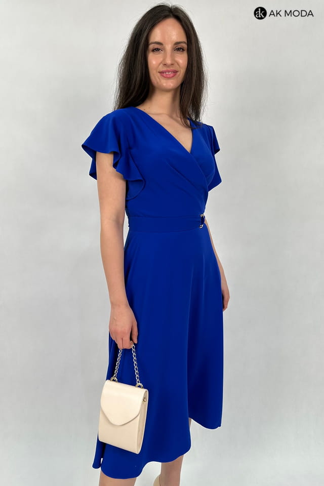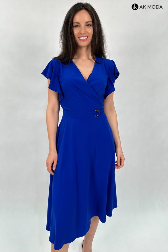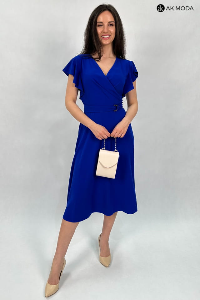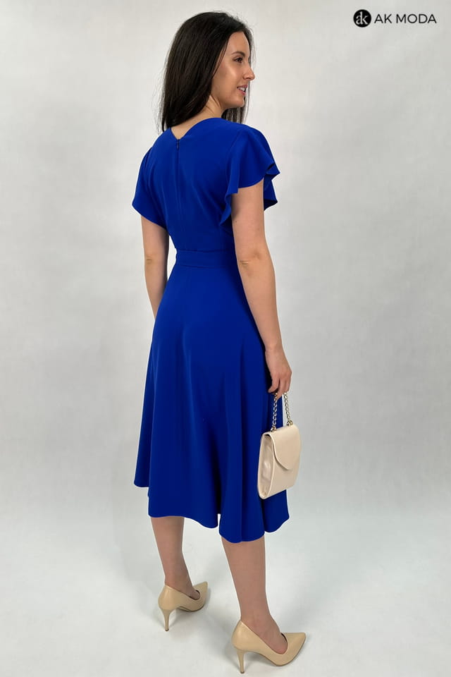 Rozkloszowana sukienka midi w kolorze chabrowym. Dekolt kopertowy, w talii pasek, przy ramionach falbanki.