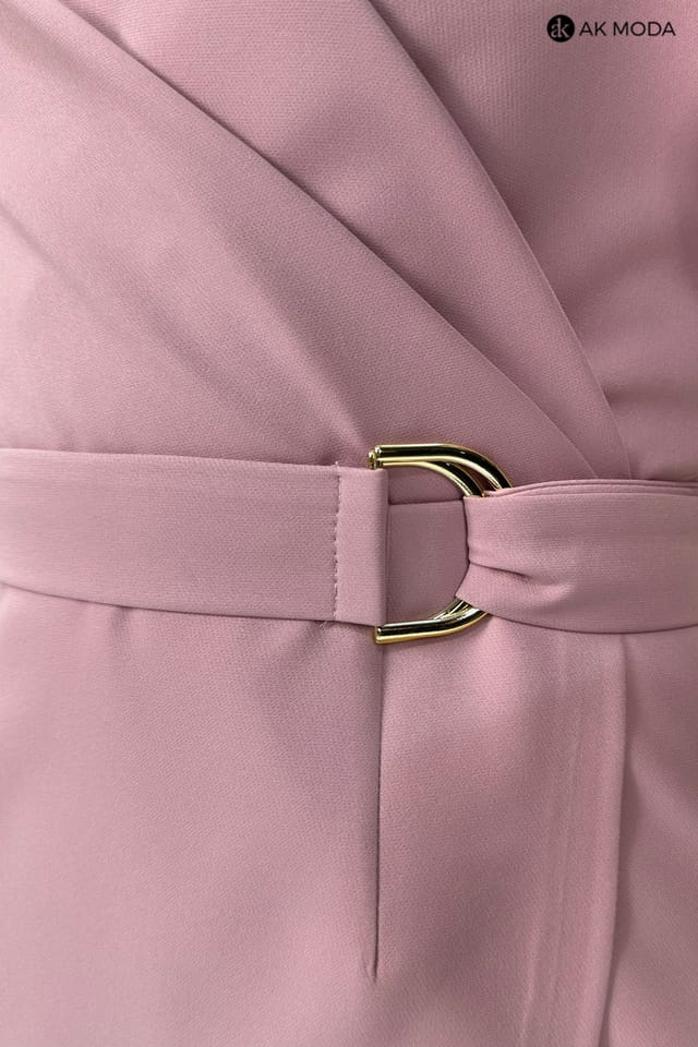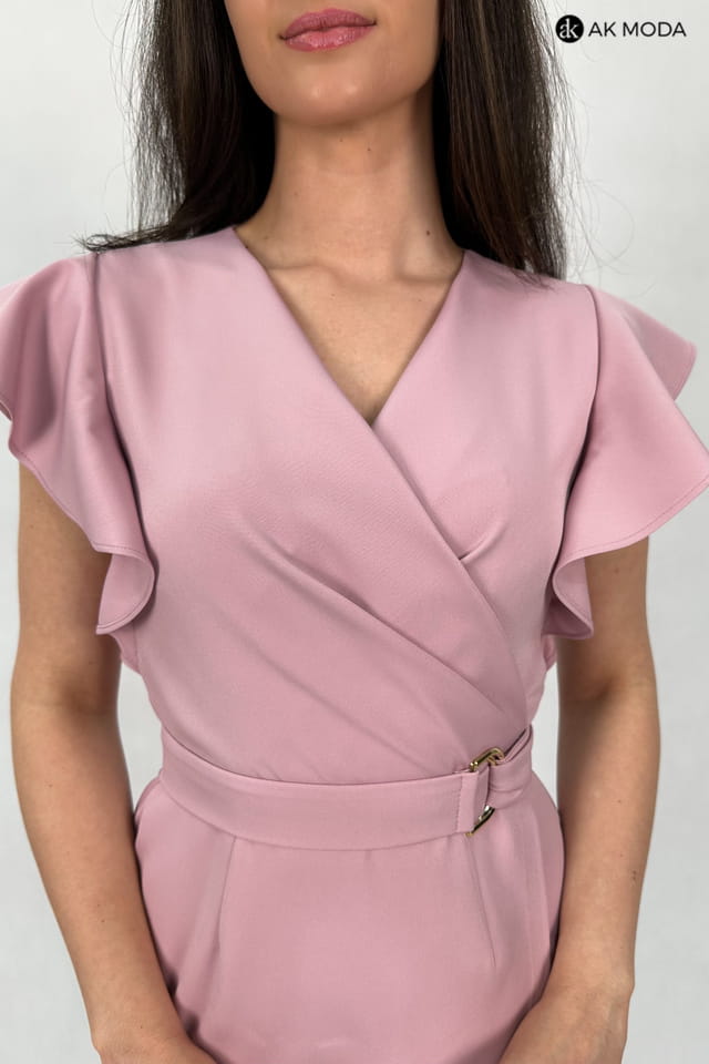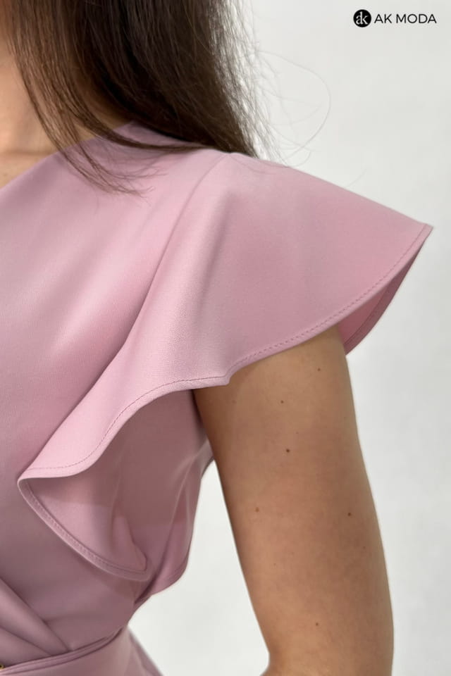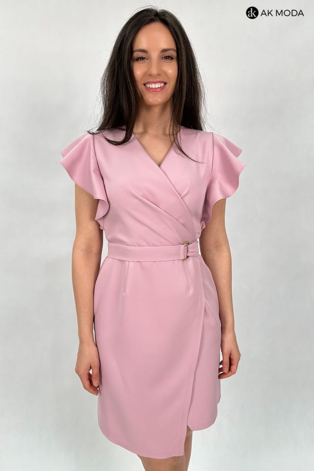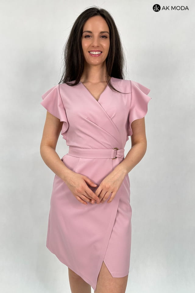 Krótka, dopasowana sukienka w kolorze różowym z zakładanym, asymetrycznym dołem. Fason odcinany w talii, dekolt kopertowy, przy ramionach falbanki.
