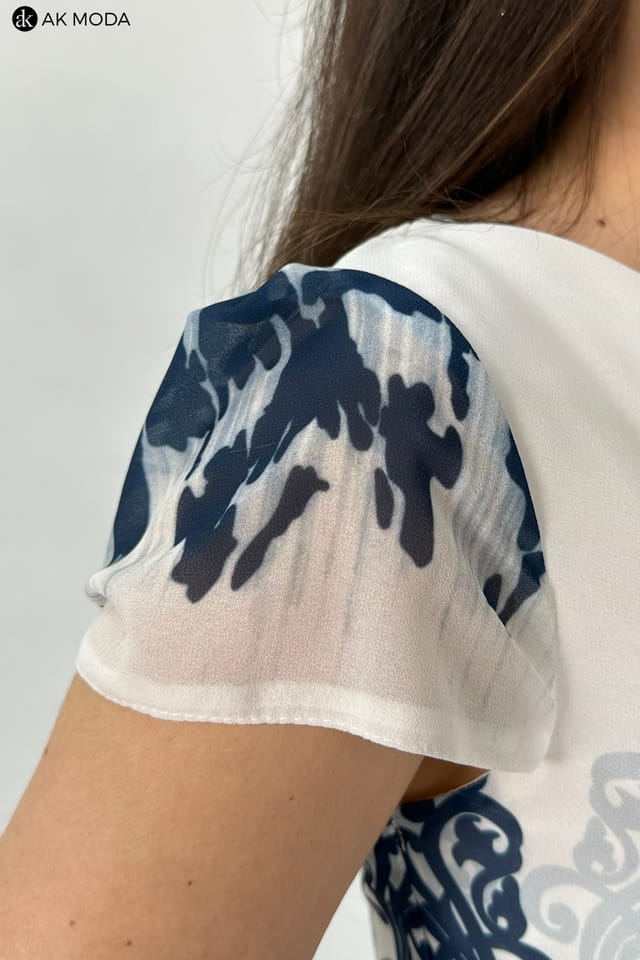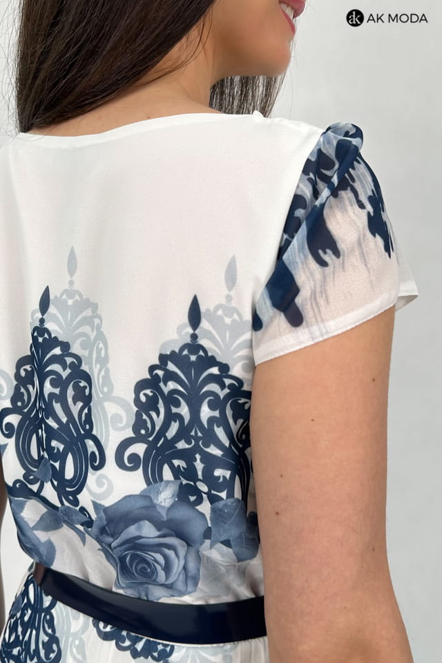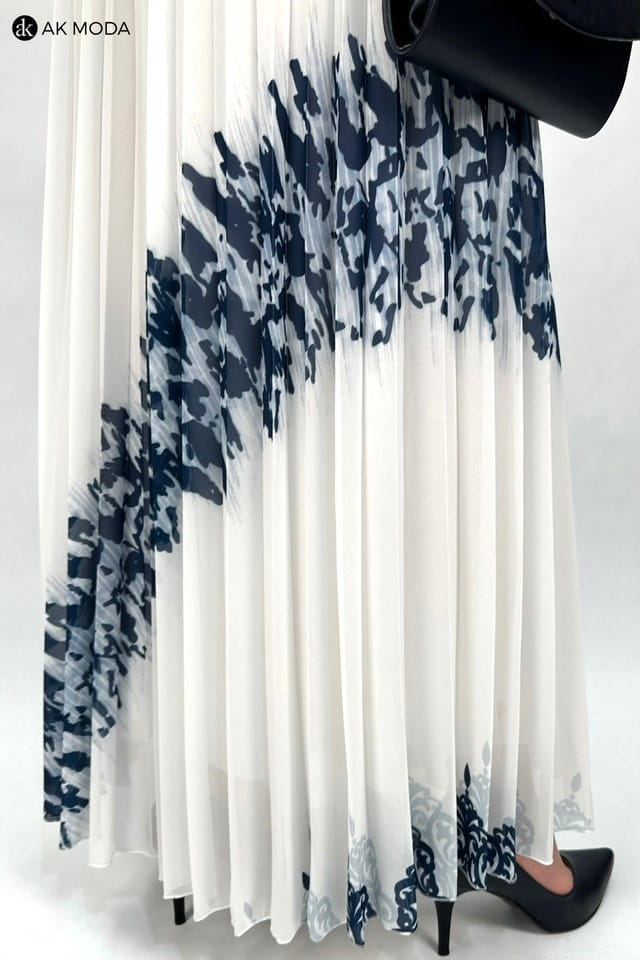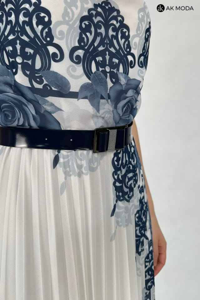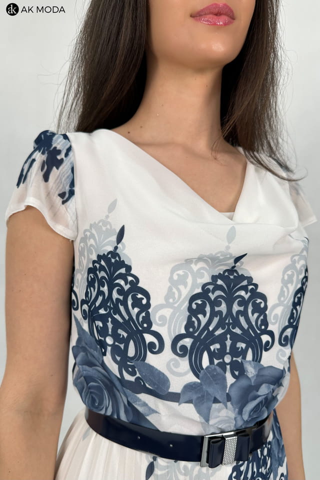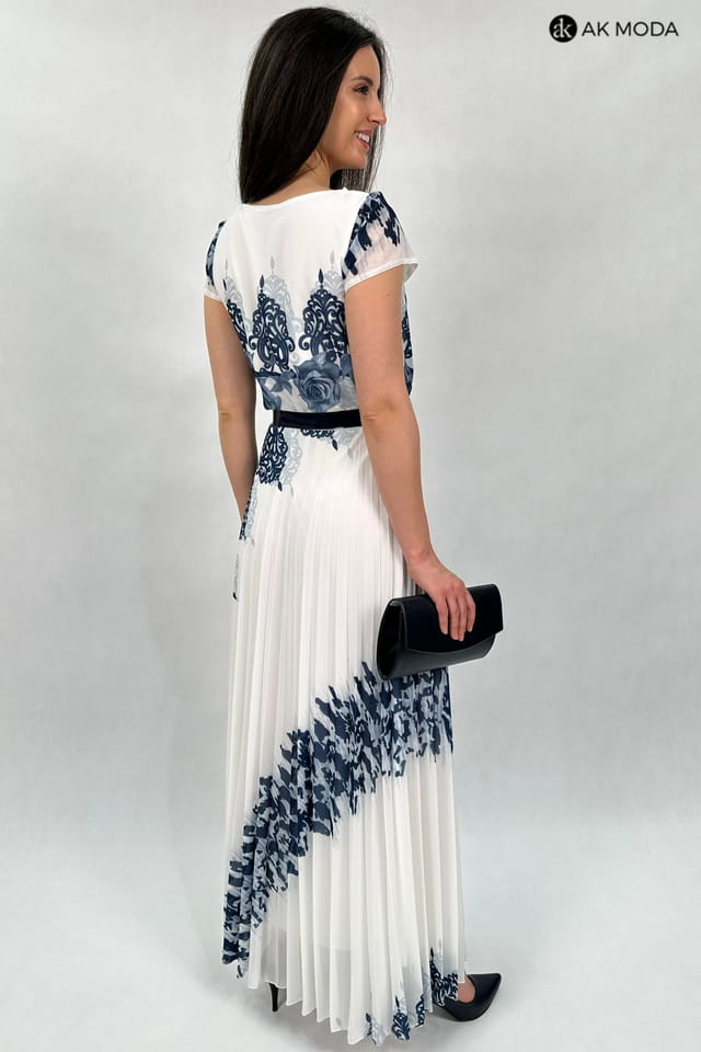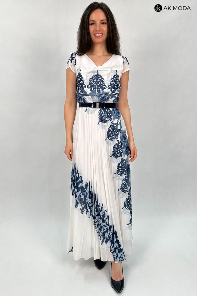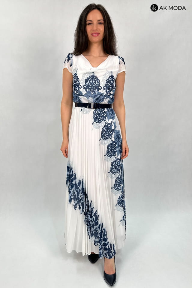 Długa sukienka w kolorze ecru z kwiatowym printem. Dekolt typu "woda", dół plisowany, w talii gumka.