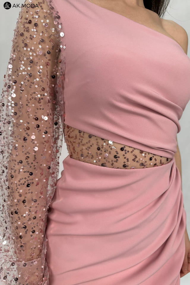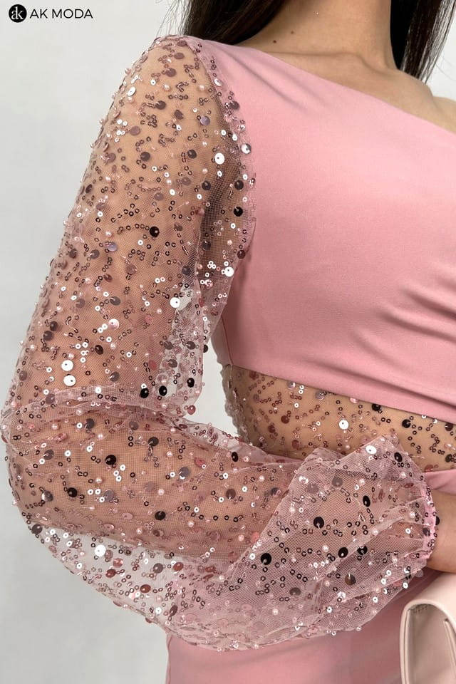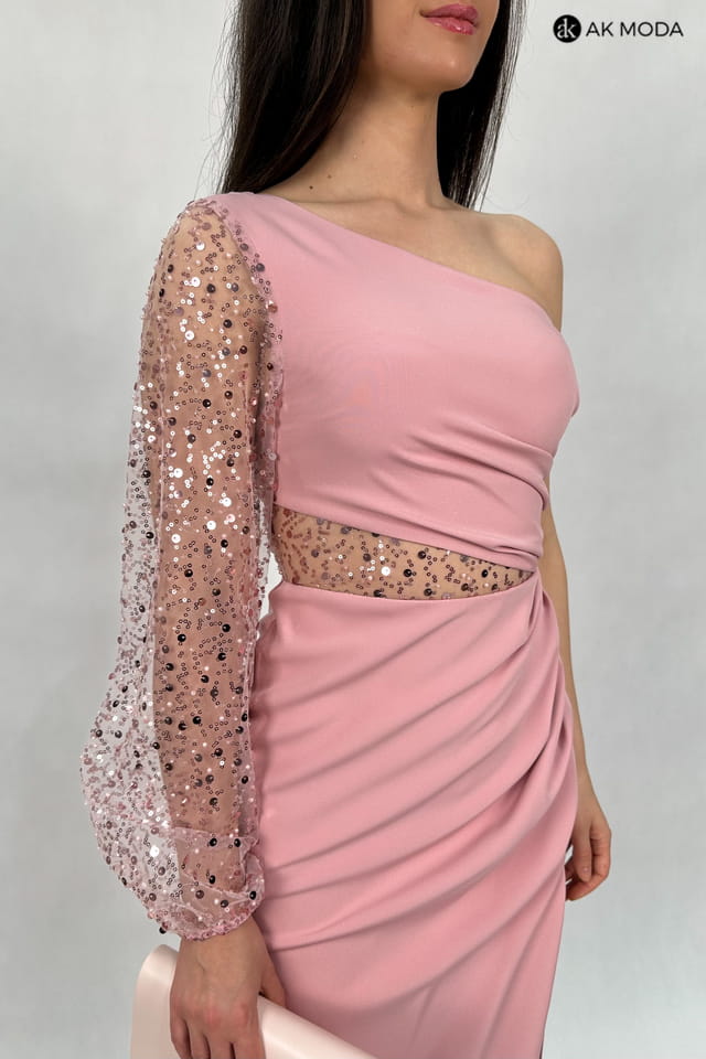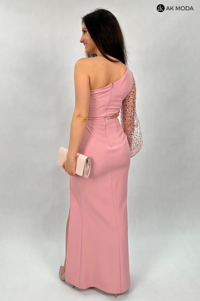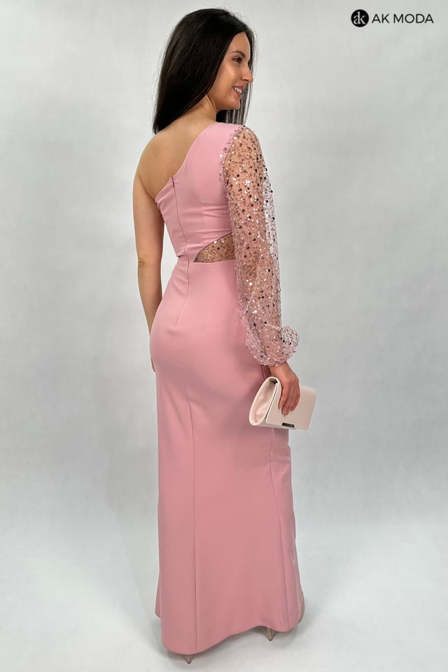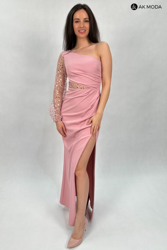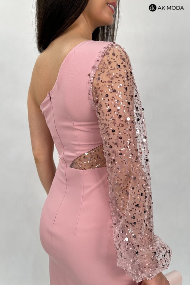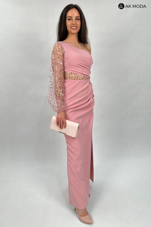 Długa, dopasowana sukienka na jedno ramię, w kolorze pudrowego różu, z rozcięciem na nodze. Efektownie marszczona na boku, w pasie cekinowa wstawka, rękaw długi ozdobiony cekinami.