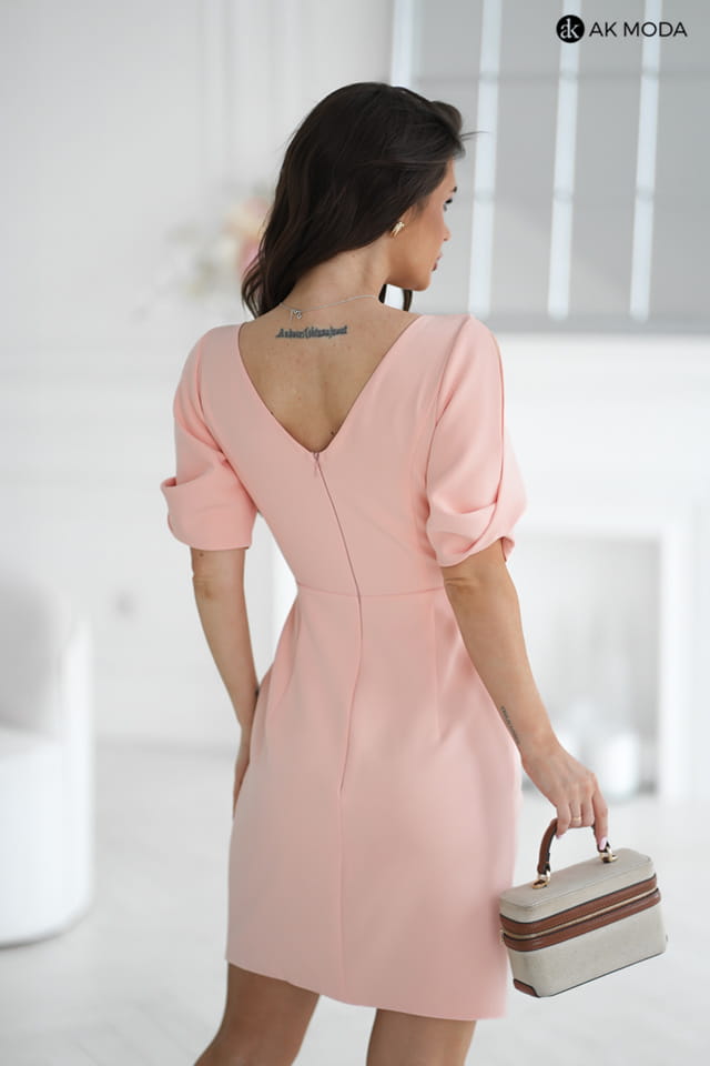 Krótka, dopasowana sukienka w kolorze brzoskwiniowym z wycięciem na plecach. Dekolt kopertowy, krótkie rękawy z pęknięciami. Fason odcinany w talii, z zakładanym dołem.