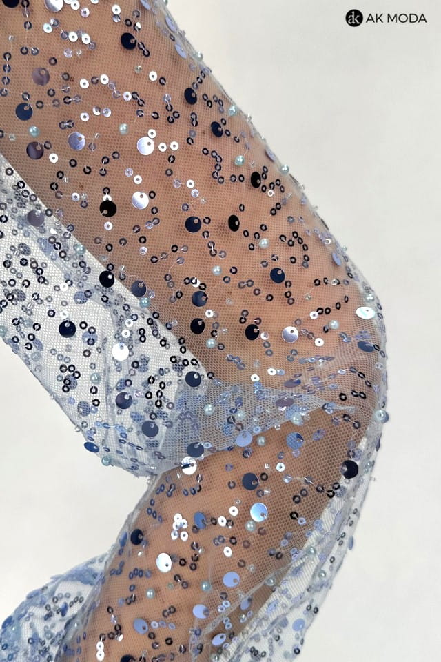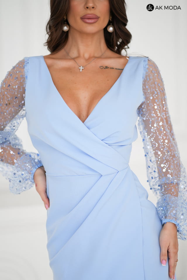 Krótka, dopasowana sukienka w kolorze niebieskim, z kopertowym dekoltem i wycięciem na plecach. Długie rękawy ozdobione cekinami, dół zakładany z rozcięciem na nodze.