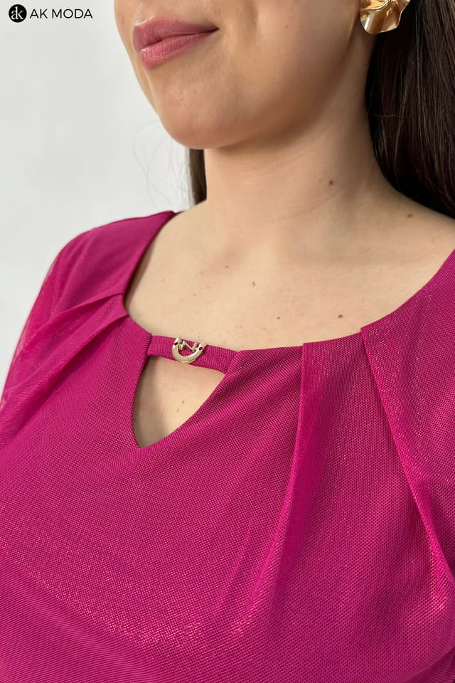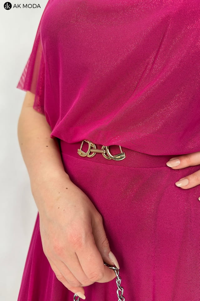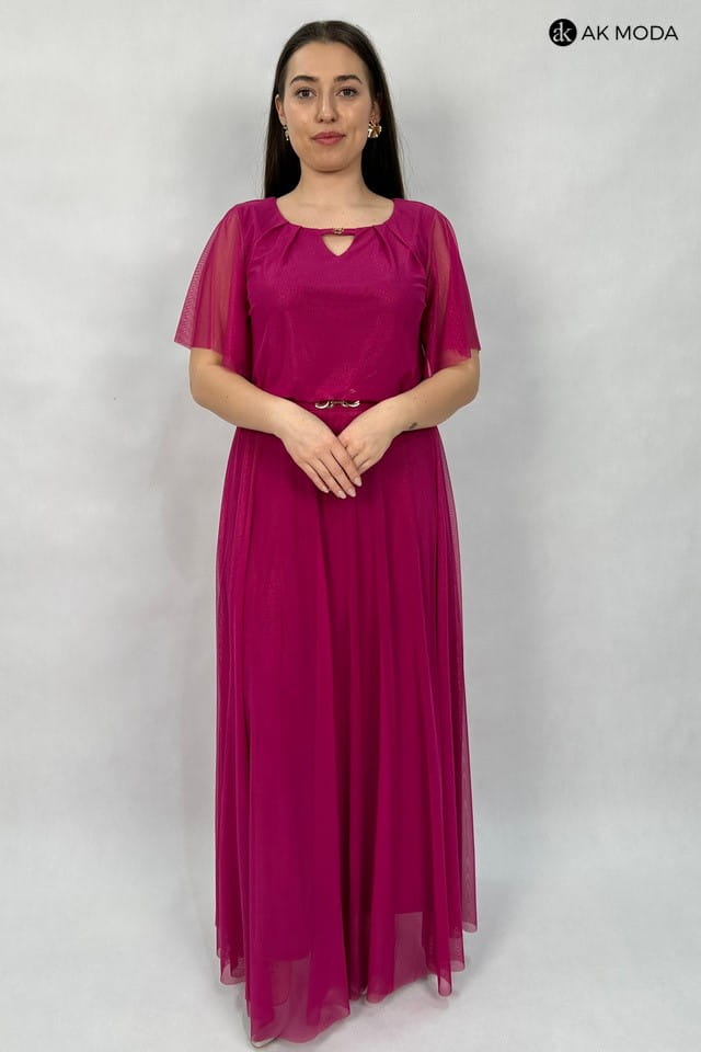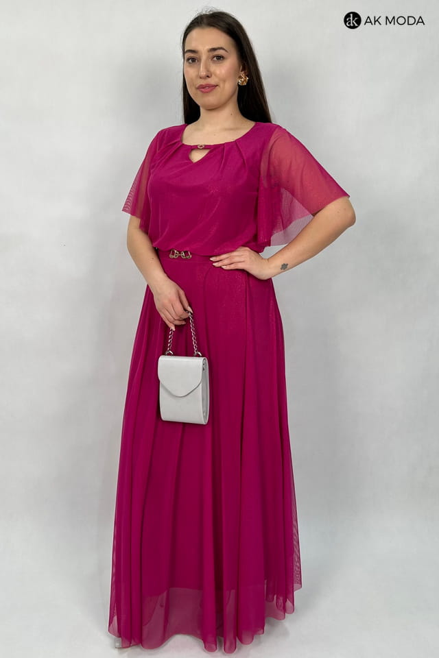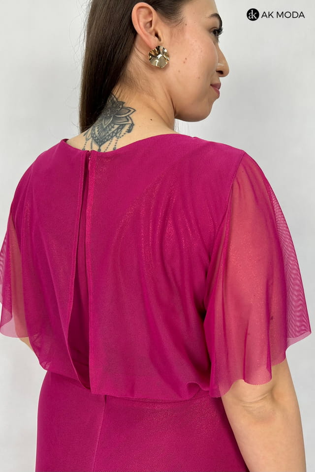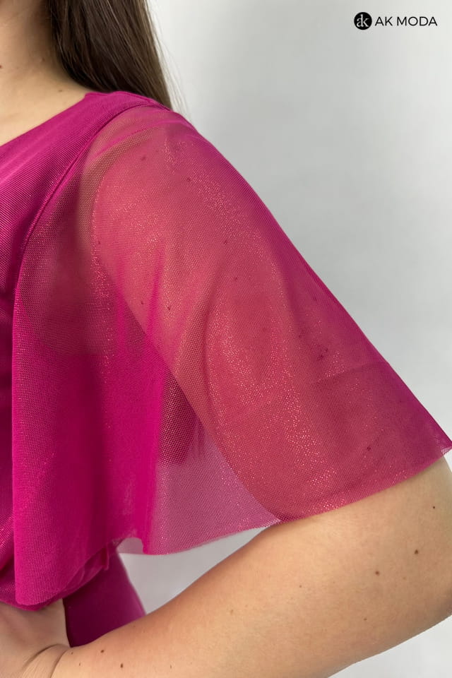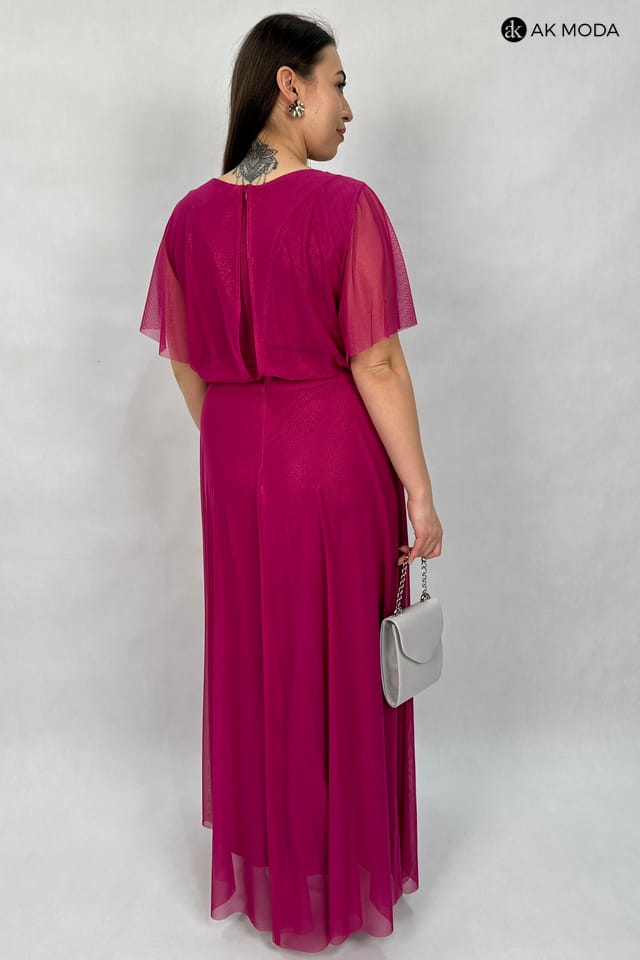 Długa, rozkloszowana sukienka w kolorze fioletowym z delikatną błyszczącą poświatą. Dekolt okrągły z pęknięciem, transparentne, luźne rękawy. Sukienka uszyta z elastycznego, siateczkowego materiału.