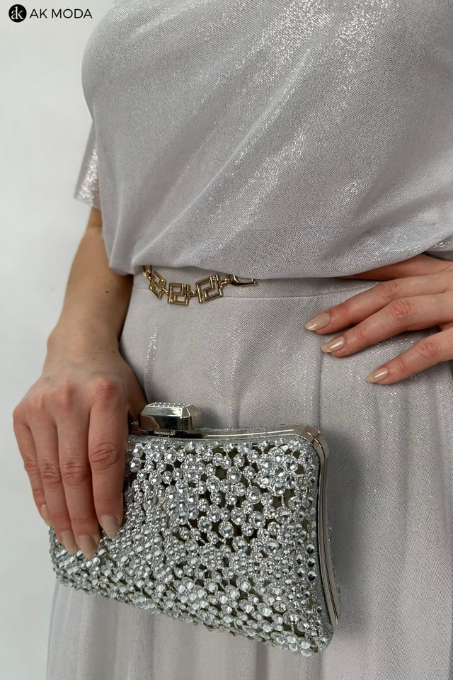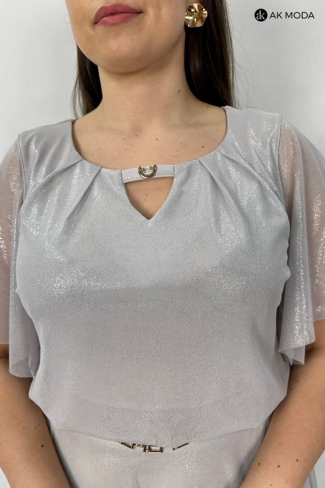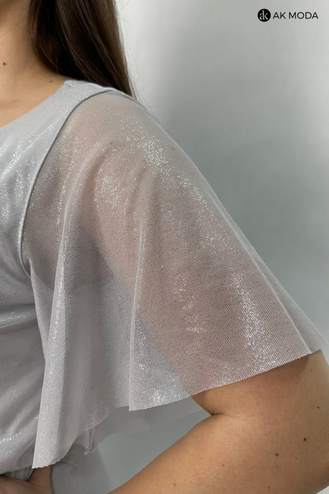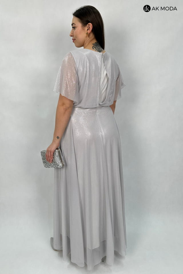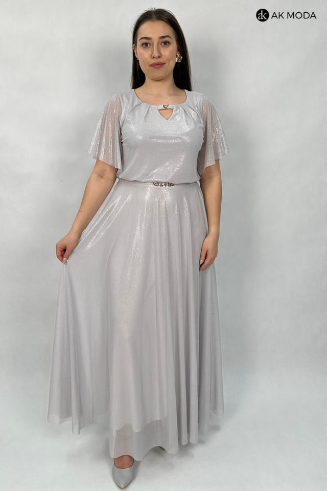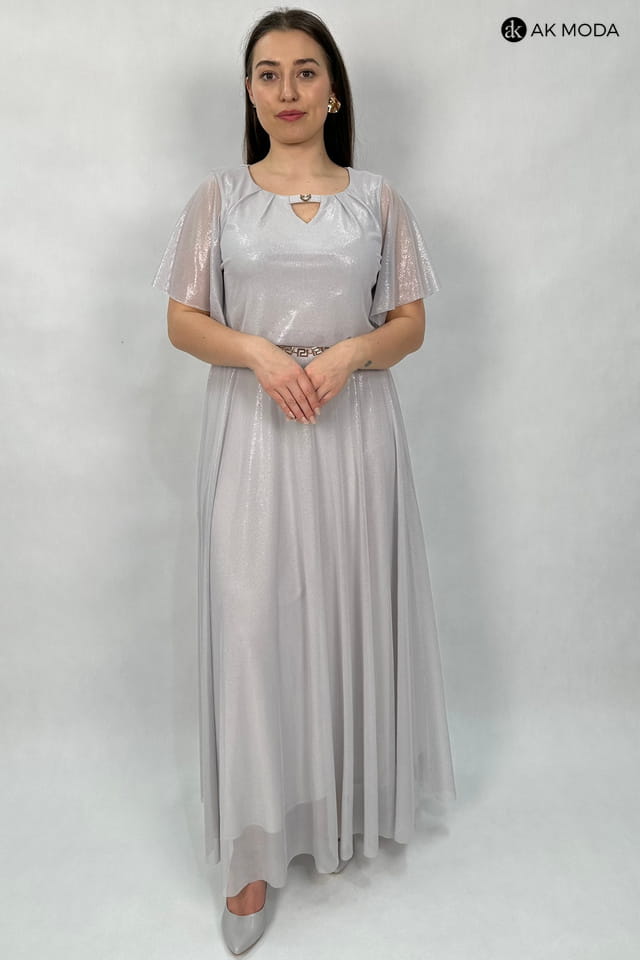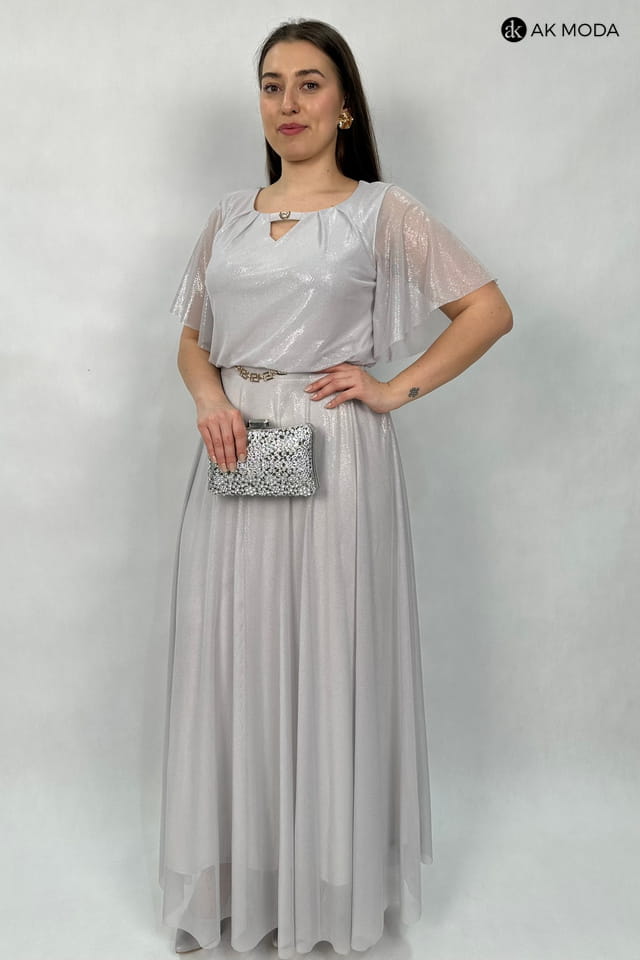 Długa, rozkloszowana sukienka w kolorze szarym z delikatną błyszczącą poświatą. Dekolt okrągły z pęknięciem, transparentne, luźne rękawy. Sukienka uszyta z elastycznego, siateczkowego materiału.