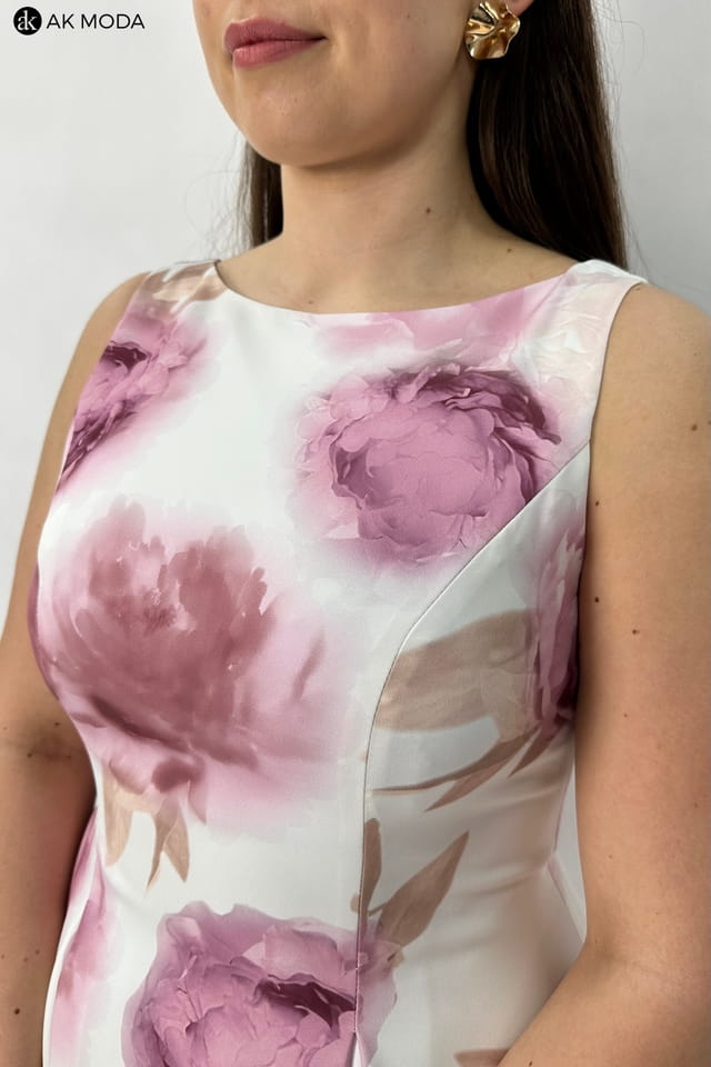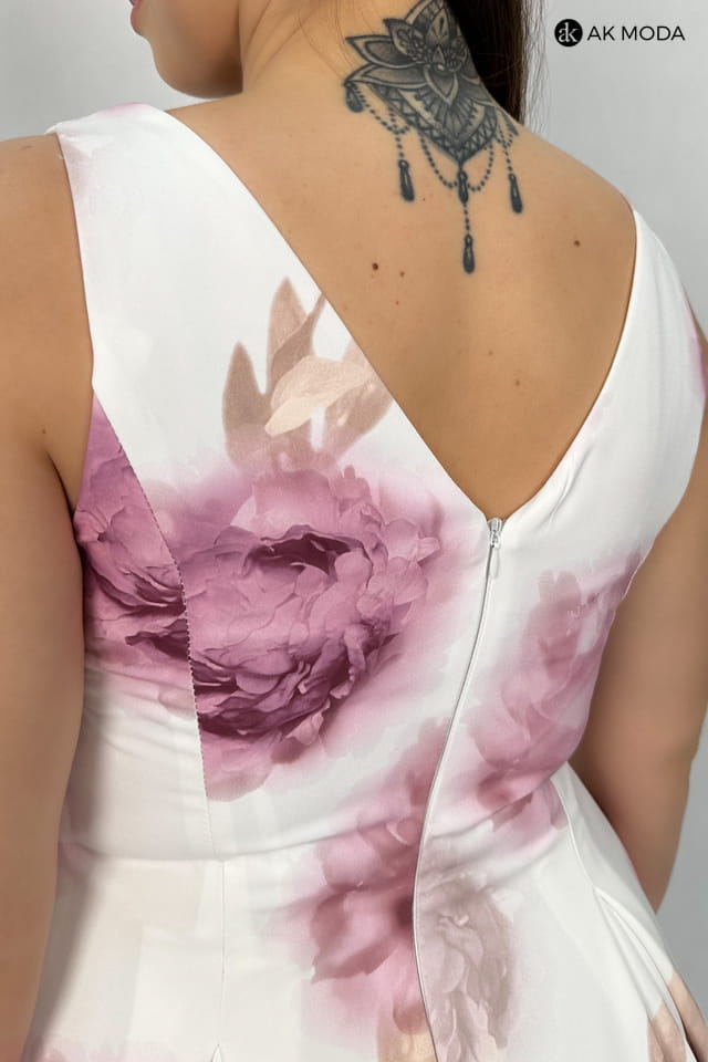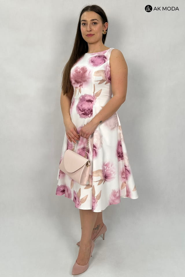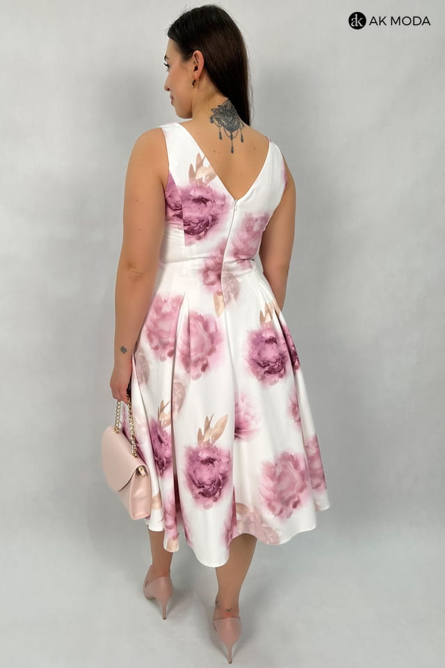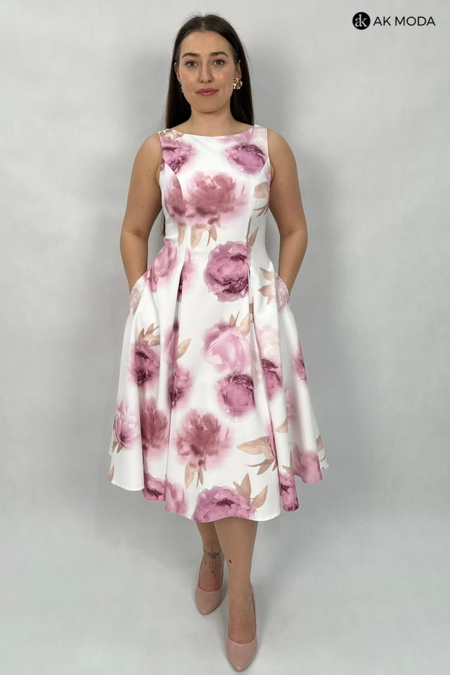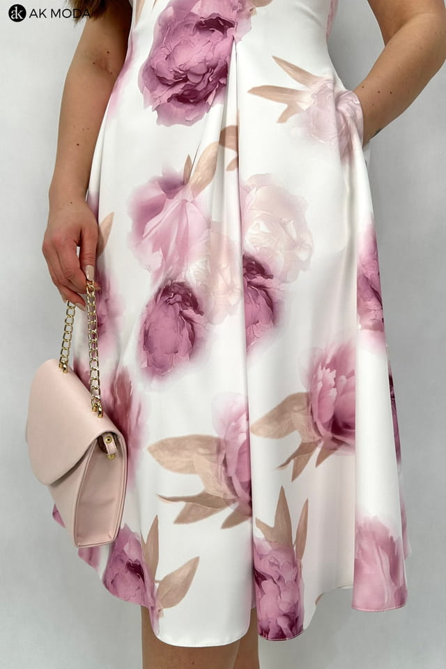 Elegancka sukienka midi w kolorze śmietankowym z kwiatowym printem. Dekolt okrągły, na plecach wycięcie w serek. Fason rozkloszowany z usztywnionym dołem i kieszeniami.