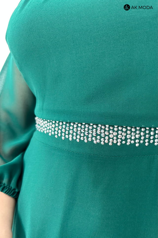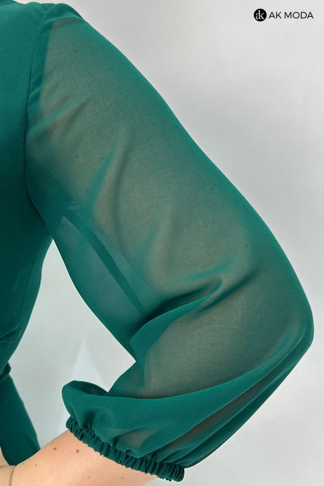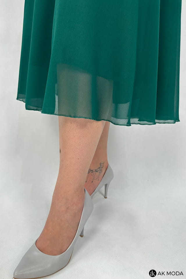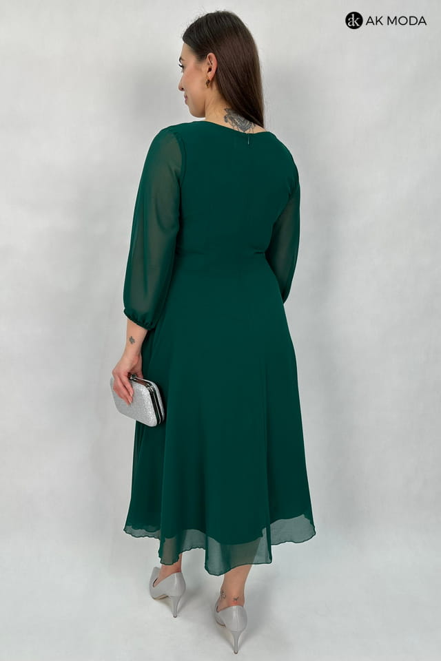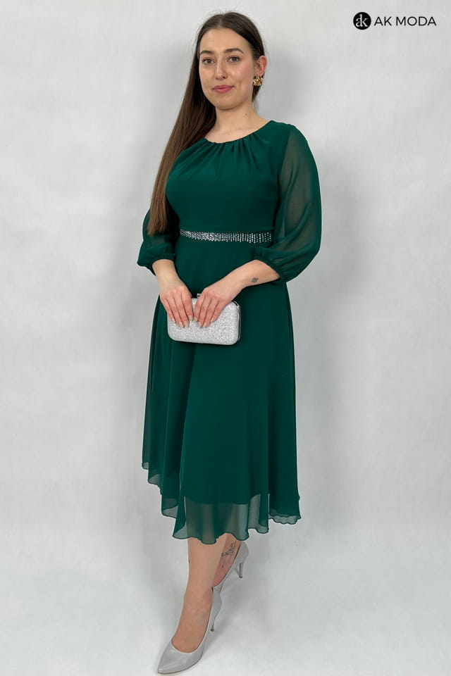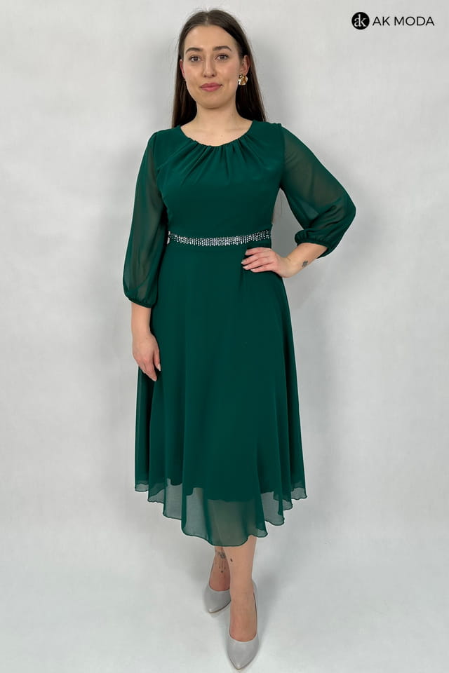 Rozkloszowana sukienka midi w kolorze butelkowej zieleni z długimi transparentnymi rękawami. Dekolt okrągły z efektownym marszczeniem, w pasie ozdobne cyrkonie.