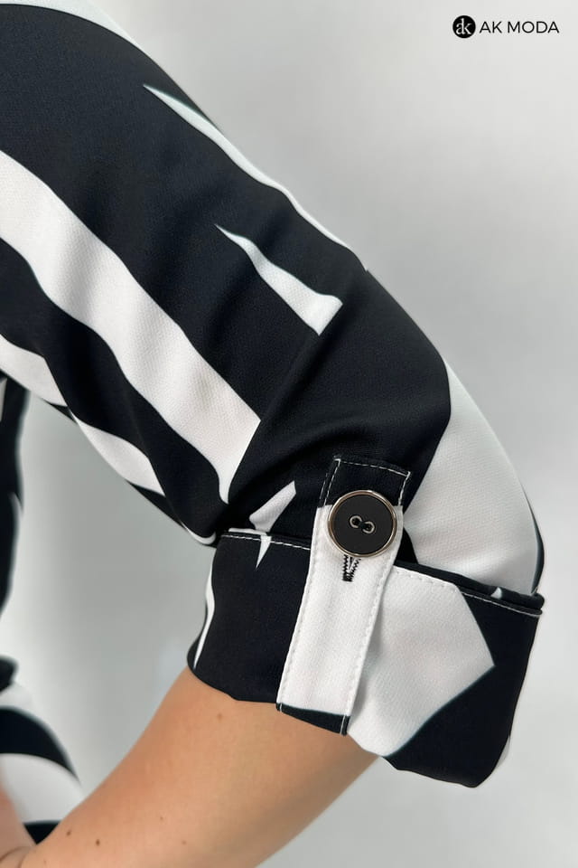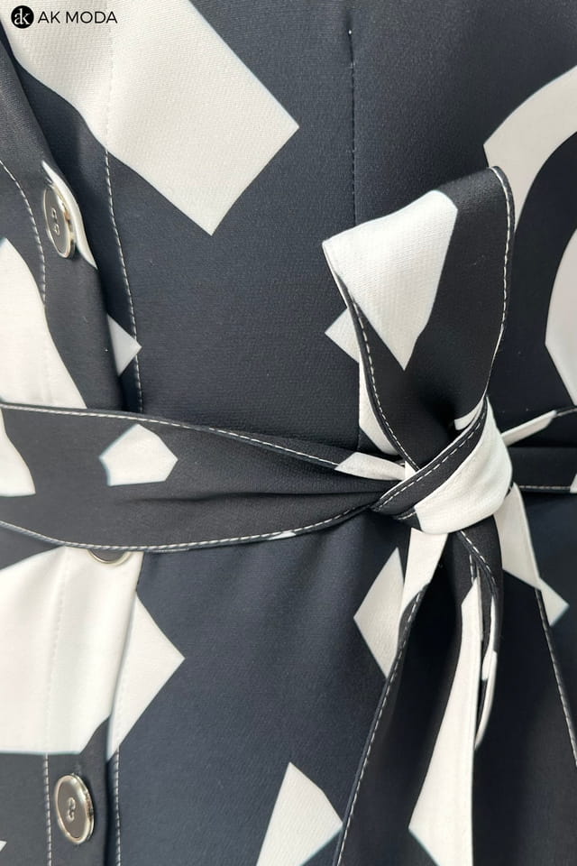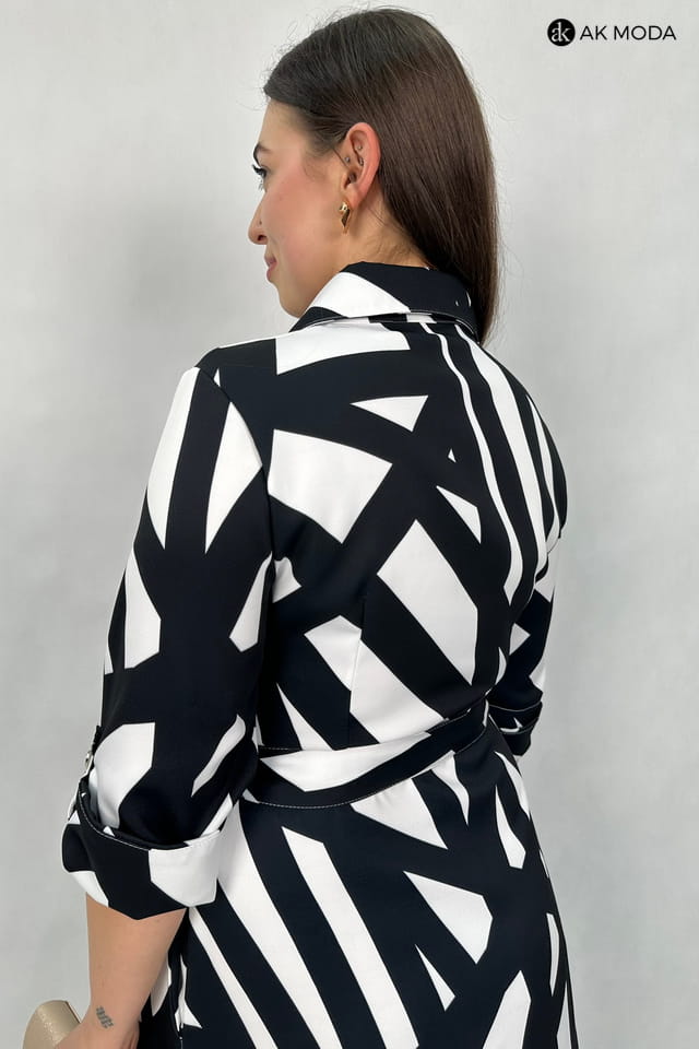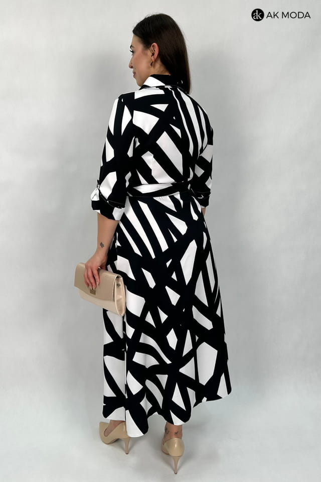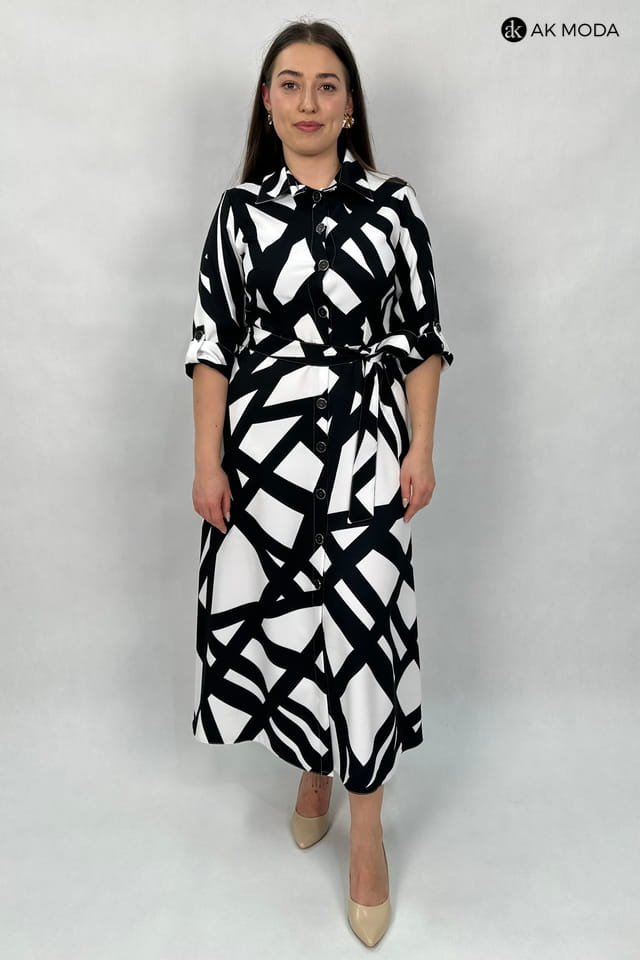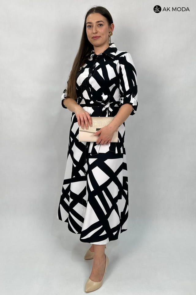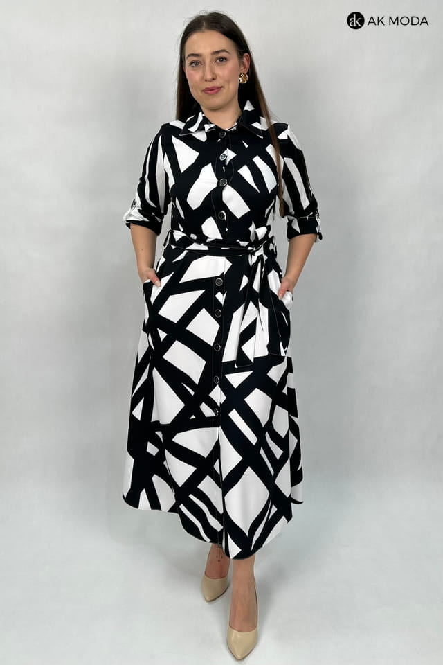 Rozkloszowana sukienka midi typu szmizjerka, w czarno - biały geometryczny wzór. Rękawy 3/4 podwijane, w talii pasek. Sukienka posiada kieszenie.