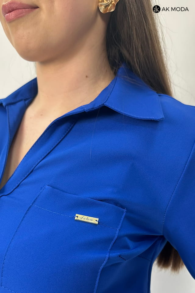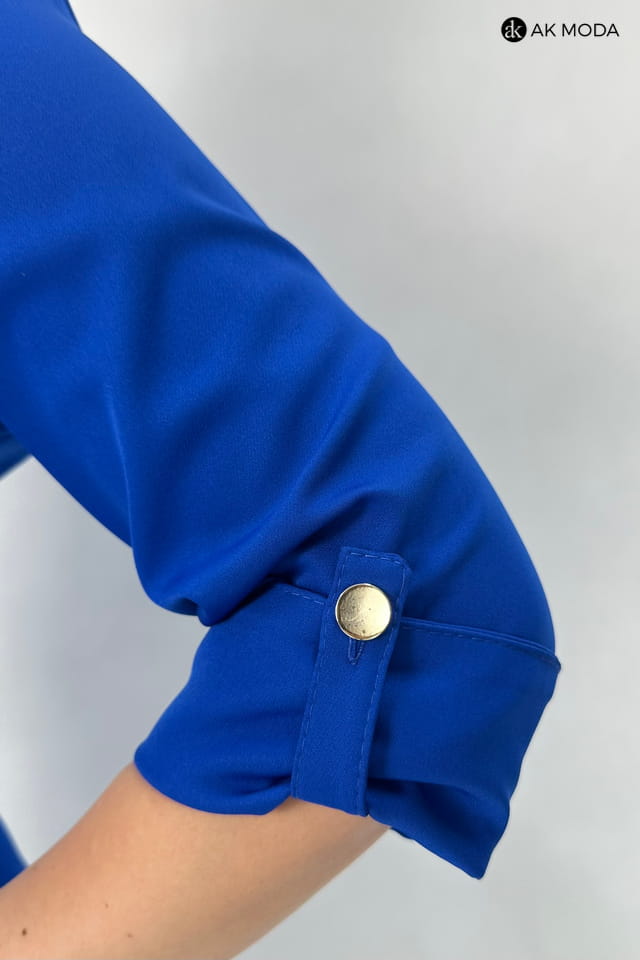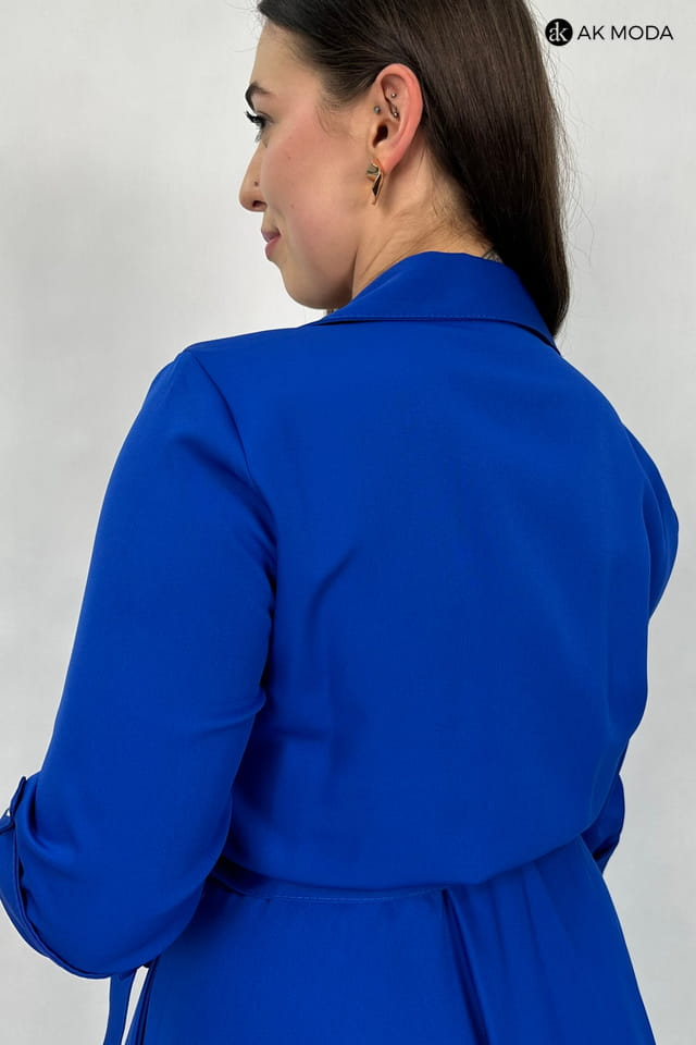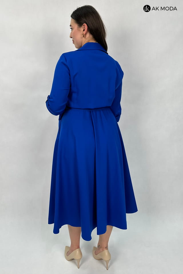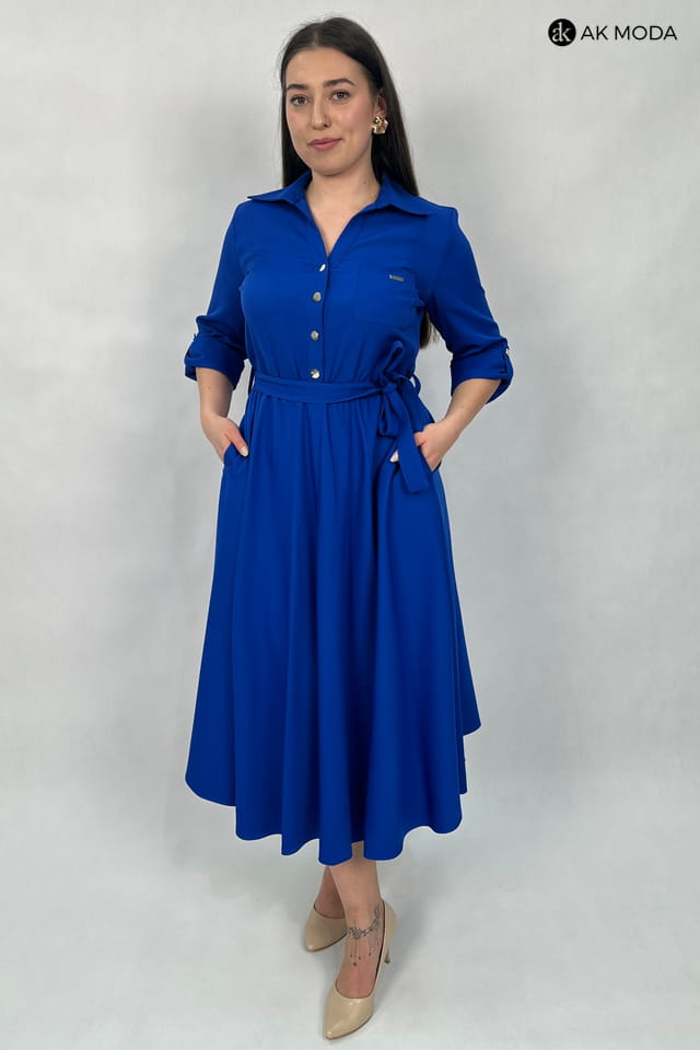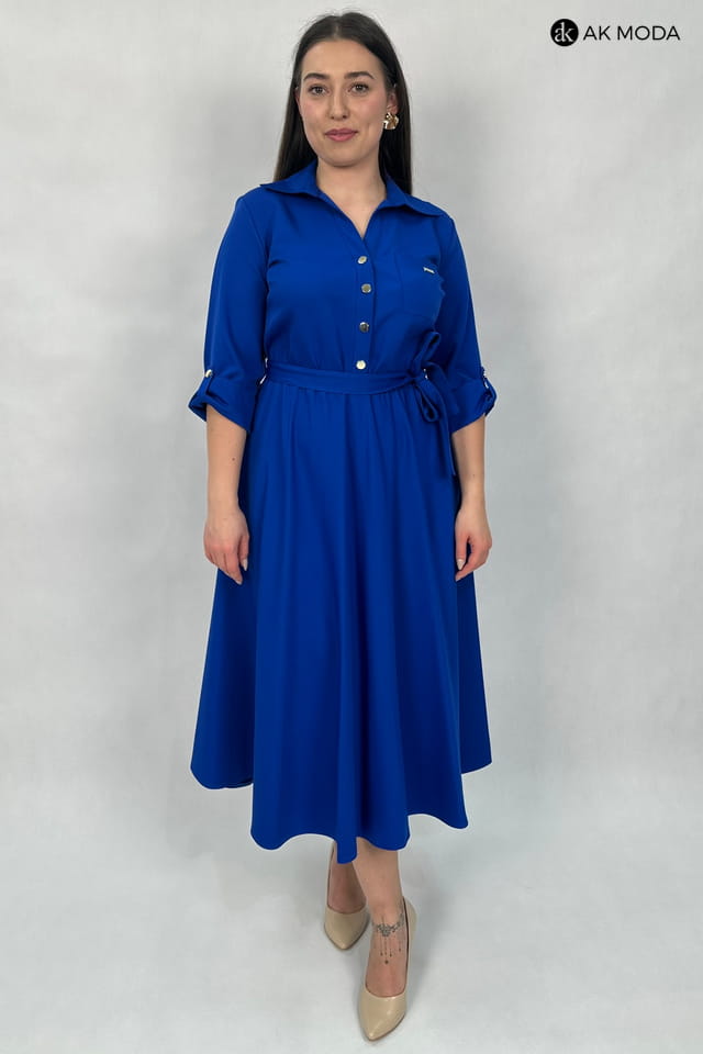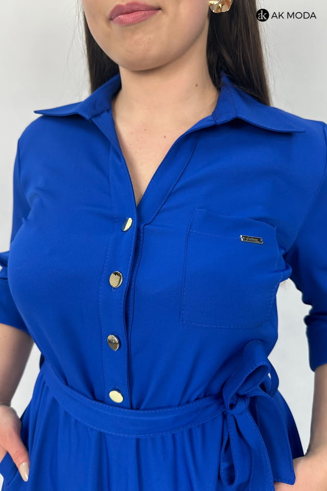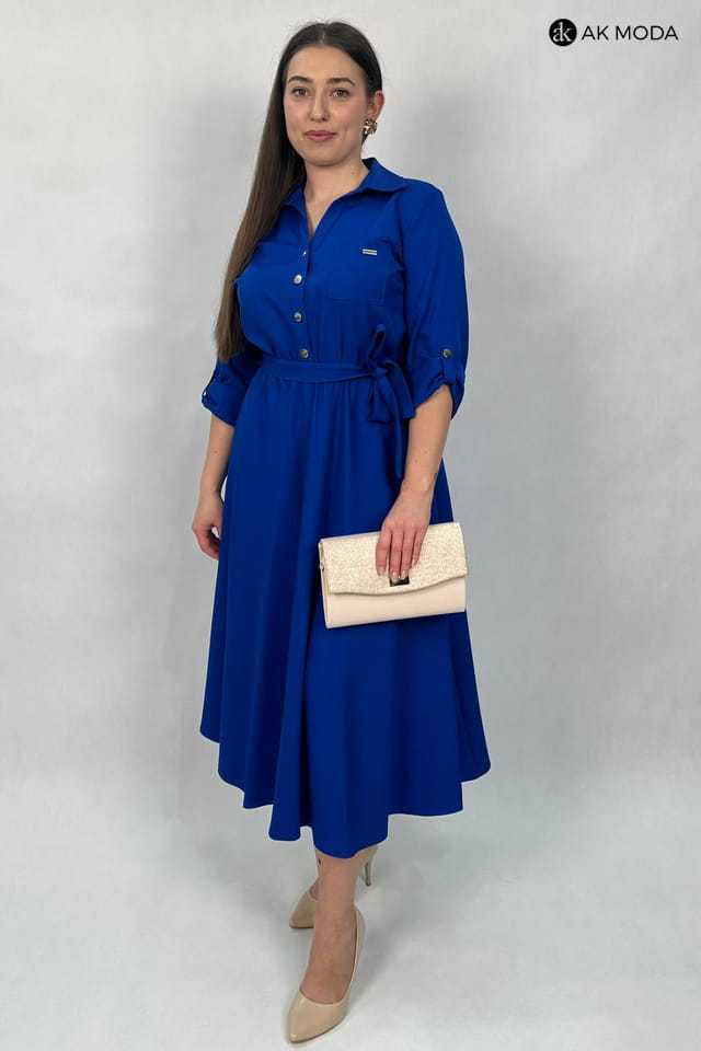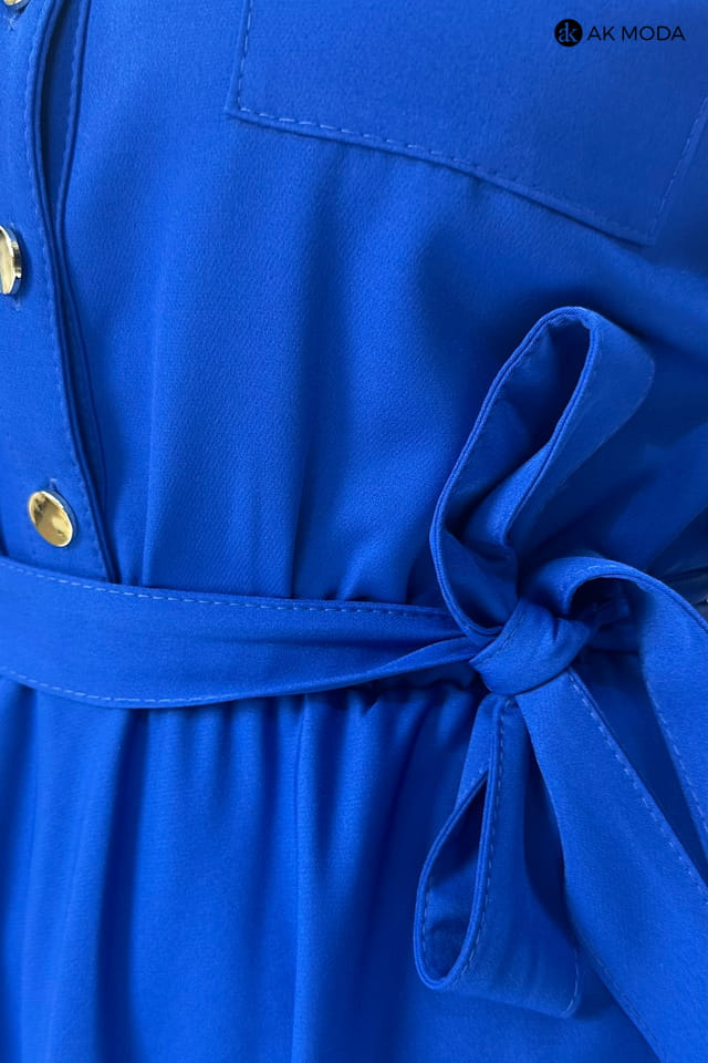 Elegancka sukienka midi w kolorze chabrowym. Górna część z kołnierzem i zapięciem na guziki, rękaw 3/4 odwijany, w pasie gumka i pasek. Fason rozkloszowany z kieszeniami.