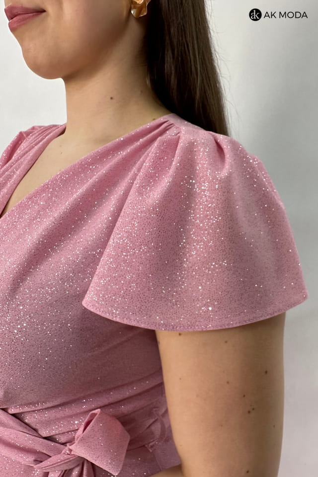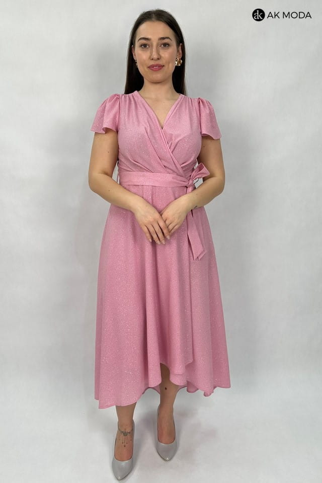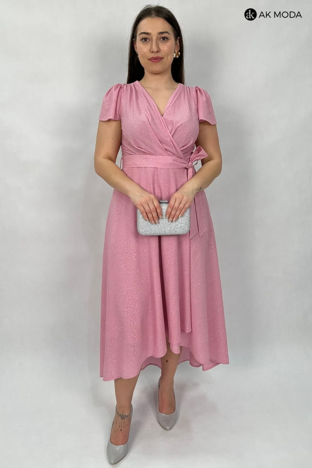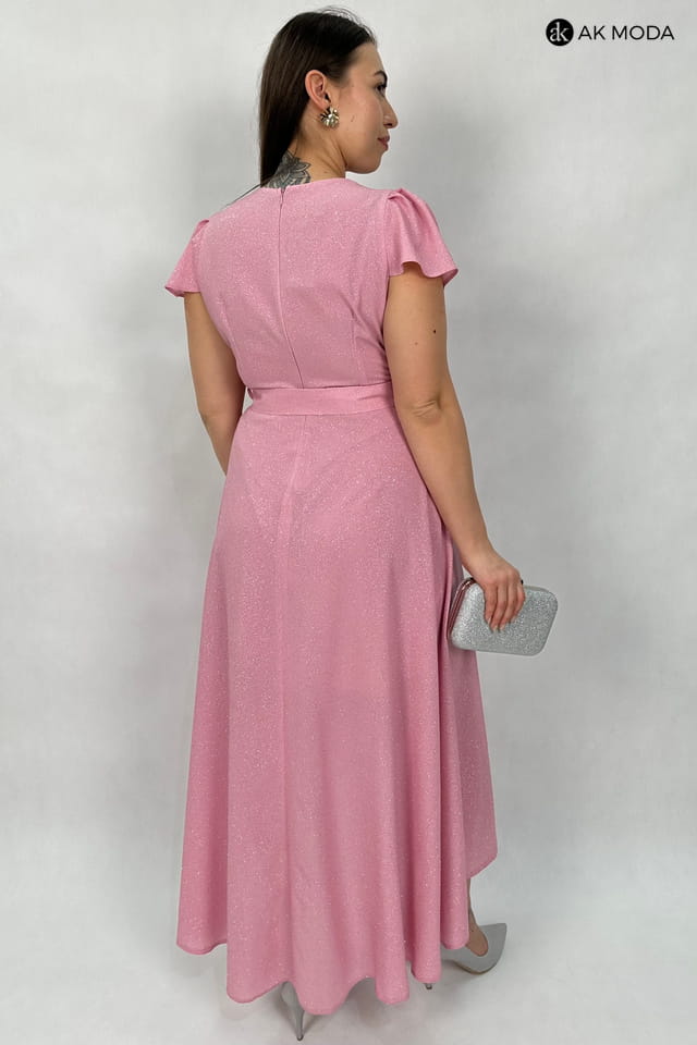 Asymetryczna sukienka maxi w kolorze różowym z zakładanym dołem, uszyta z brokatowego materiału. Dekolt kopertowy, krótkie luźne rękawy, w talii wiązany pasek..
