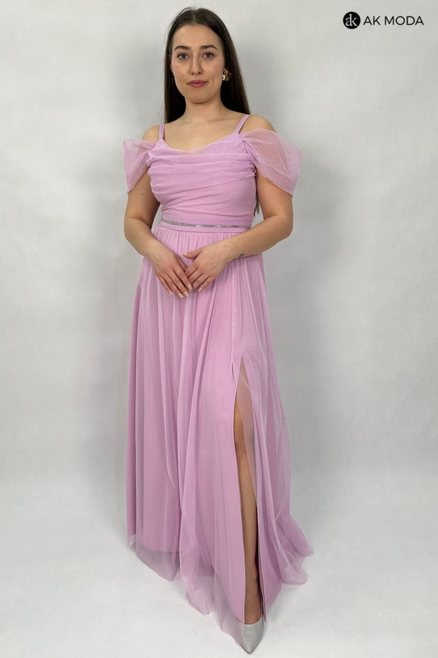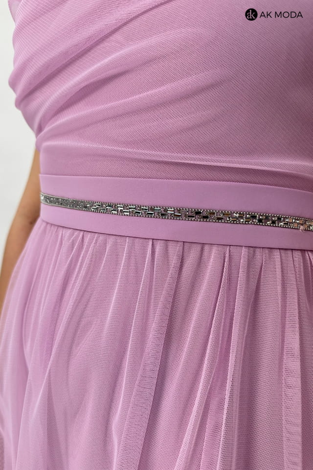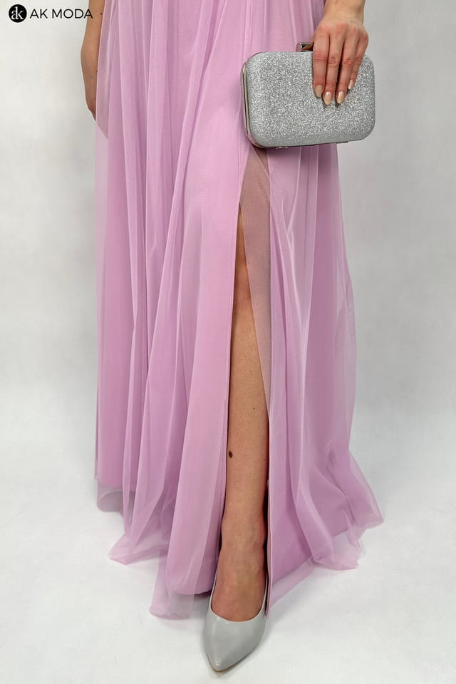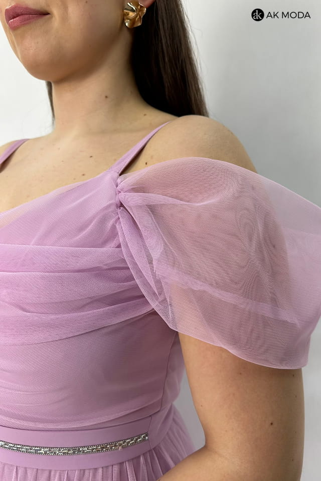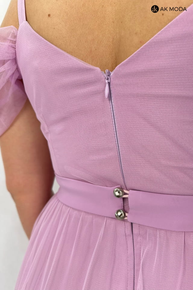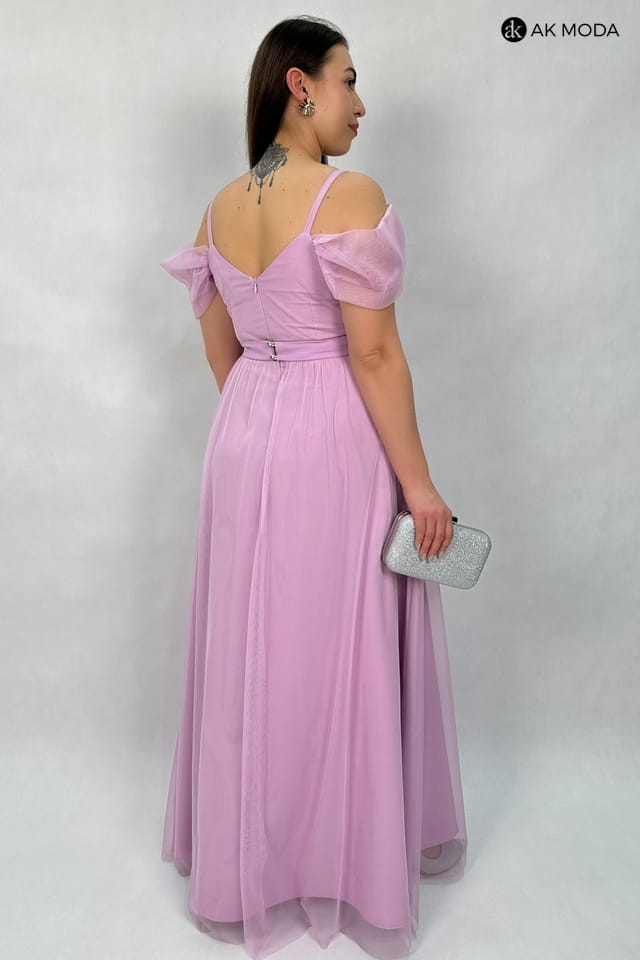 Długa rozkloszowana sukienka w kolorze jasnofioletowym z tiulową wierzchnią warstwą, na cienkich szelkach z opadającymi ramionami. Dekolt w szpic, z boku rozcięcie, w talii zapinany ozdobny pasek.