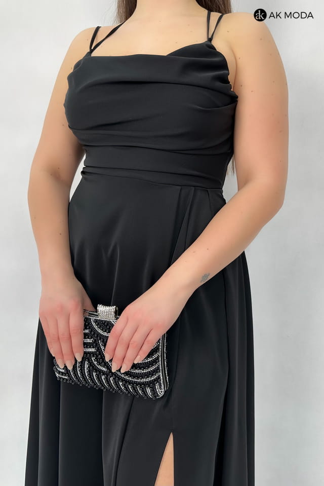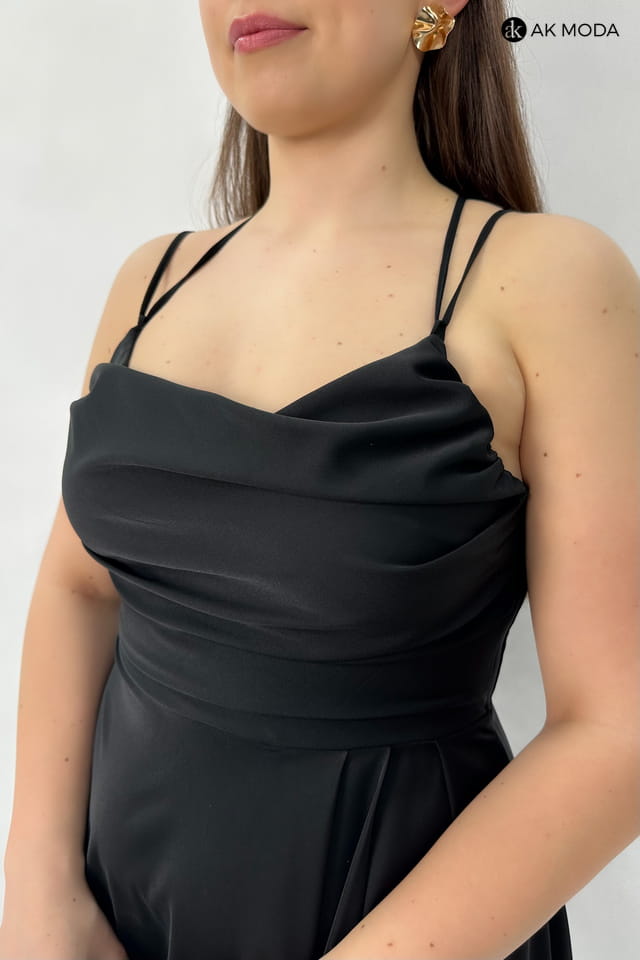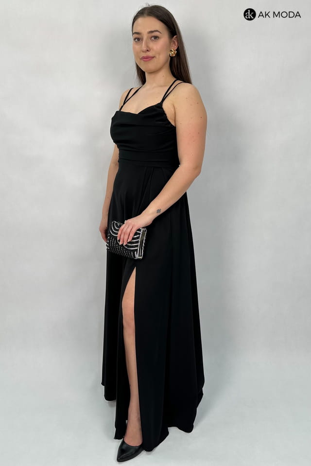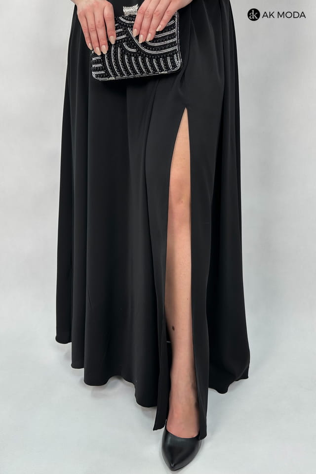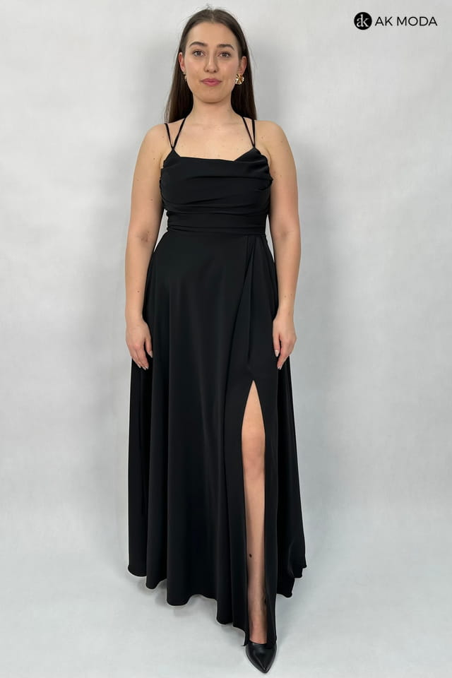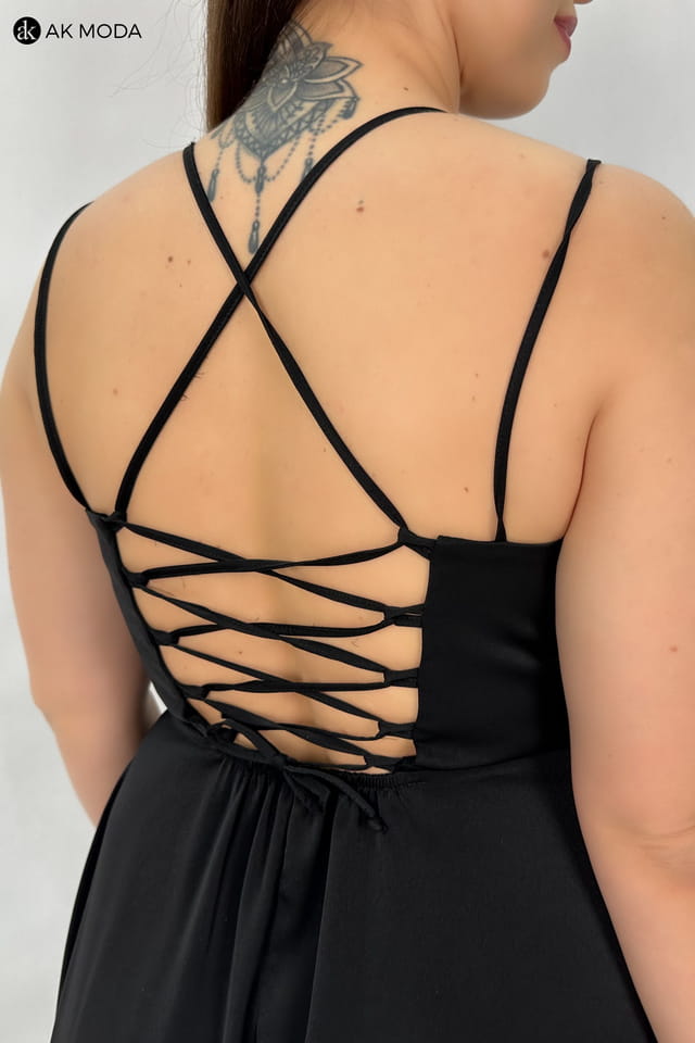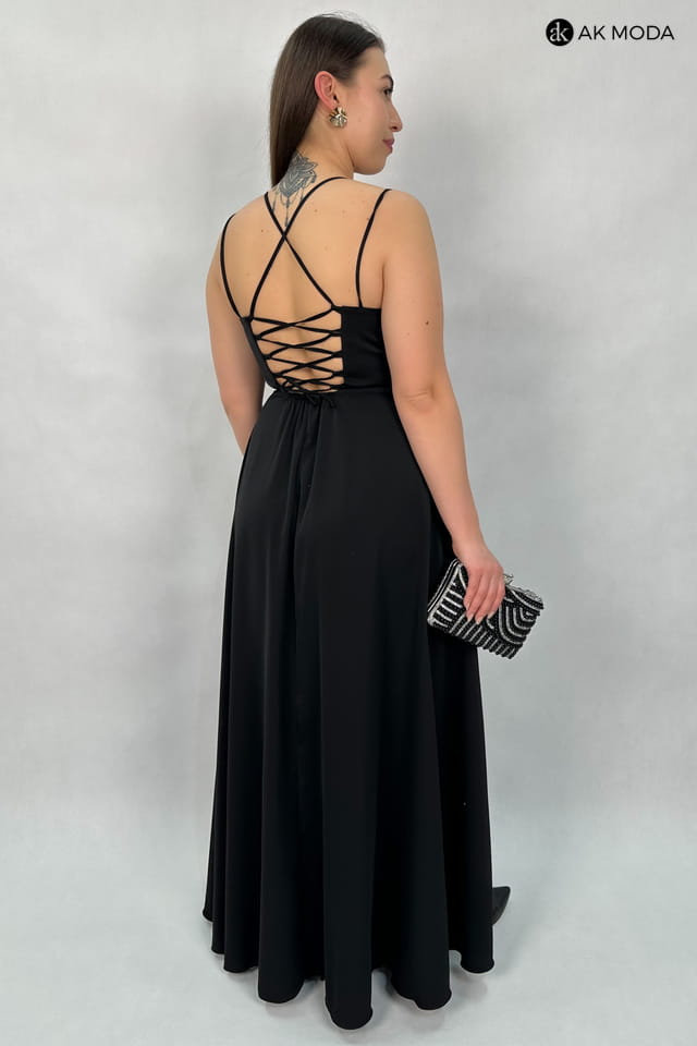 Długa rozkloszowana sukienka w kolorze czarnym z efektownym sznurowaniem na plecach. Dekolt typu "woda", w pasie z tyłu gumka, rozcięcie na nodze.