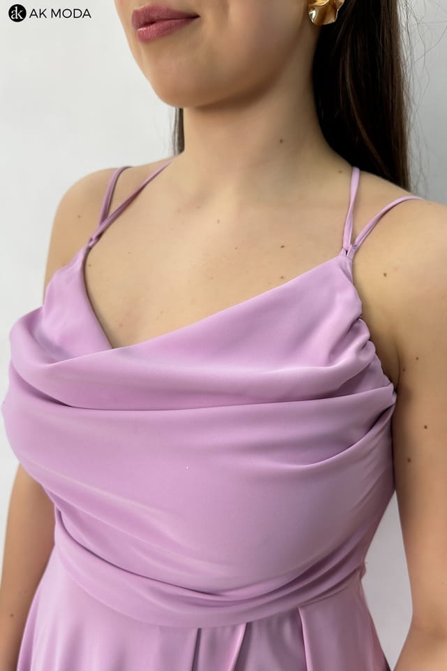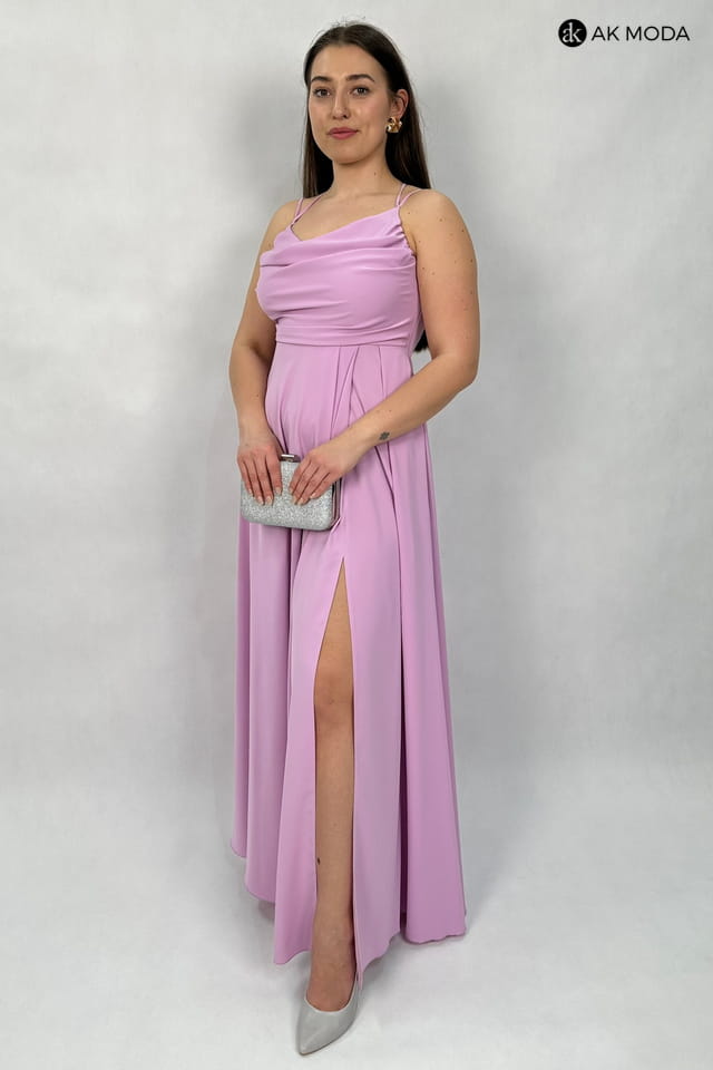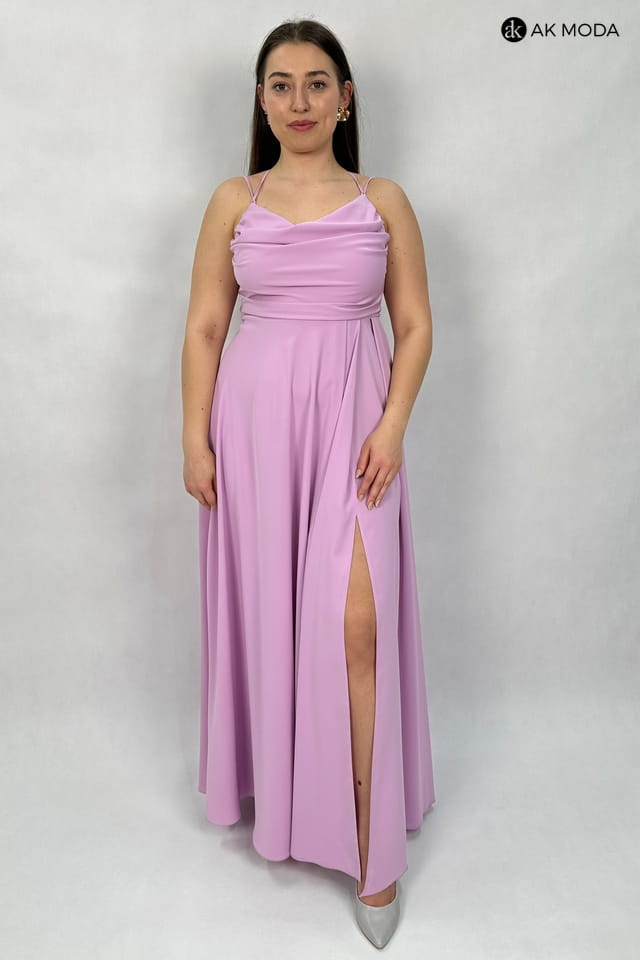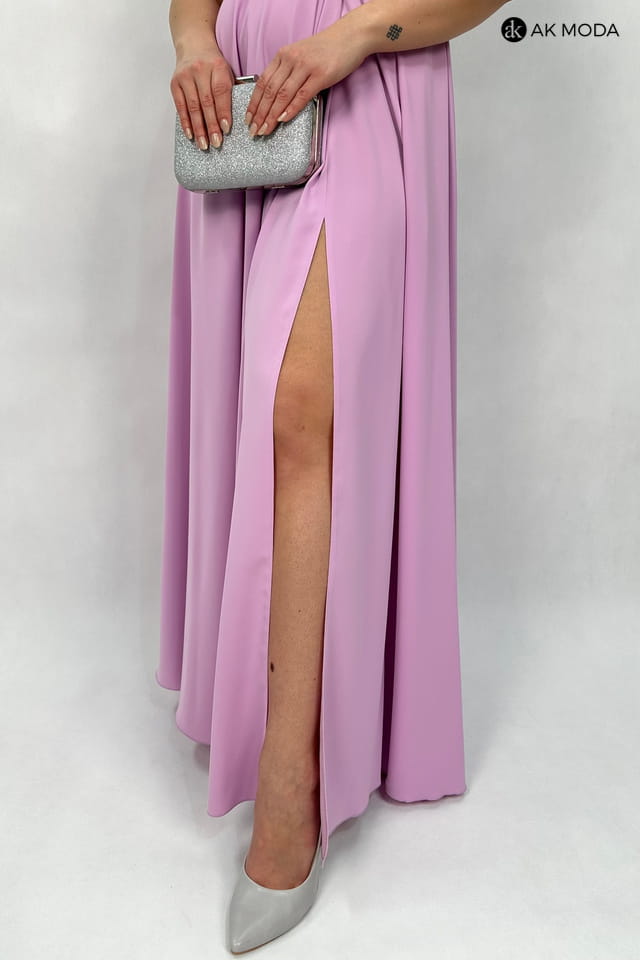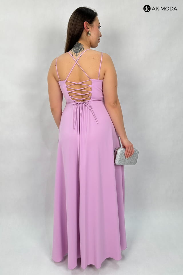 Długa rozkloszowana sukienka w kolorze jasnofioletowym z efektownym sznurowaniem na plecach. Dekolt typu "woda", w pasie z tyłu gumka, rozcięcie na nodze.