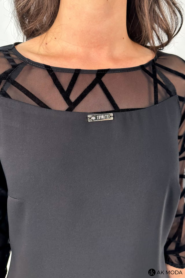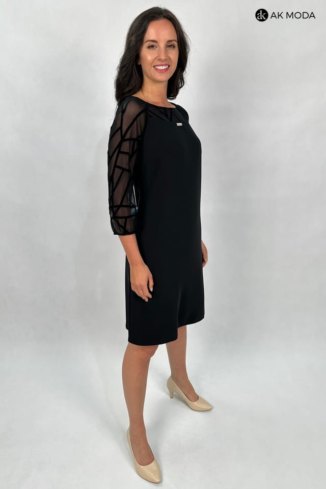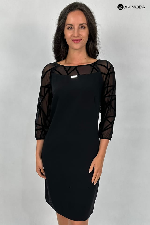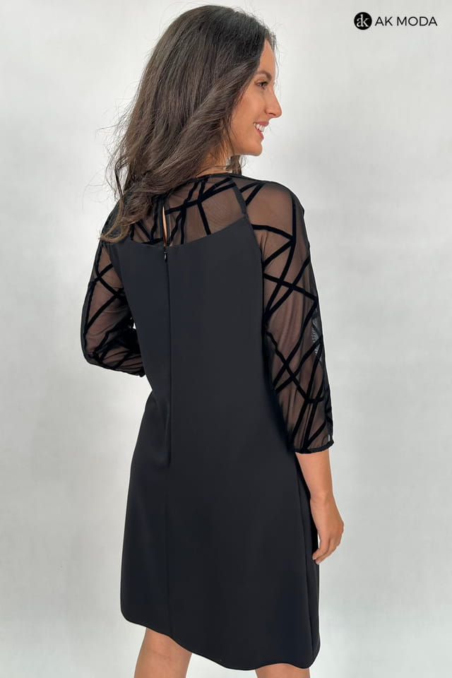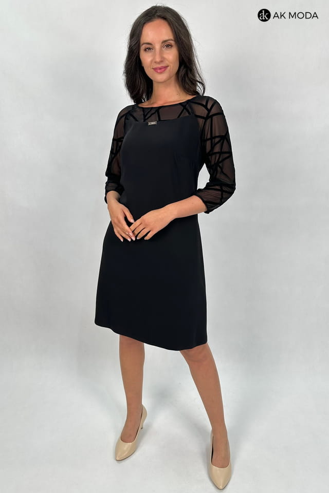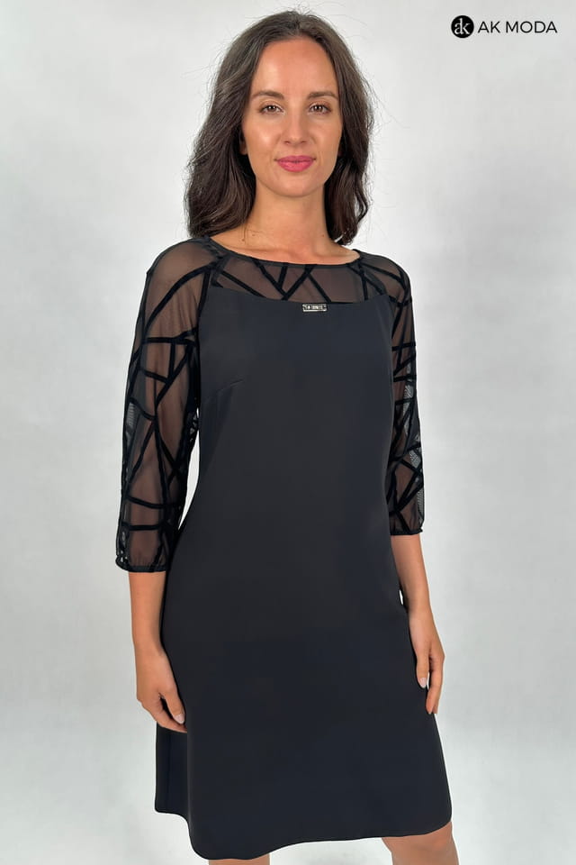 Elegancak czarna sukienka o lekko trapezowym fasonie i rękawami 3/4. Rękawy oraz wstawka przy dekolcie i na plecach uszyte z ozdobnej, transparentnej siateczki.
