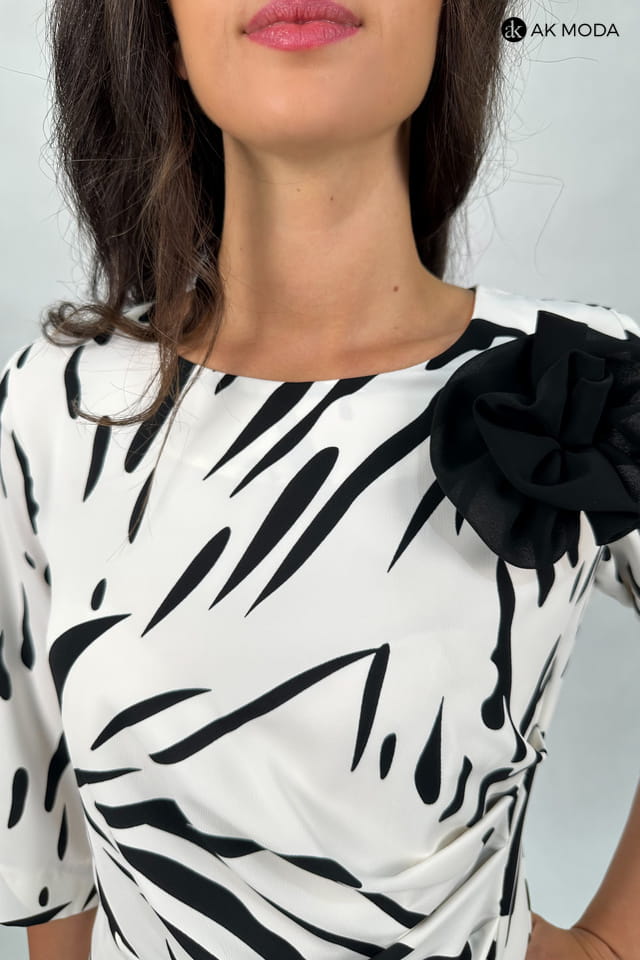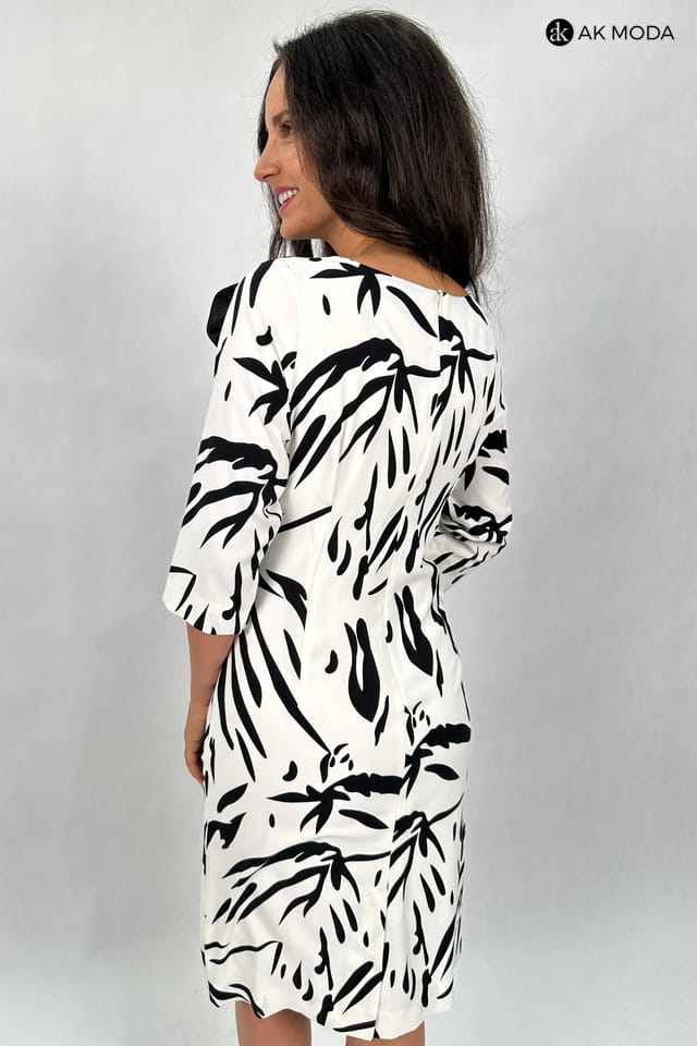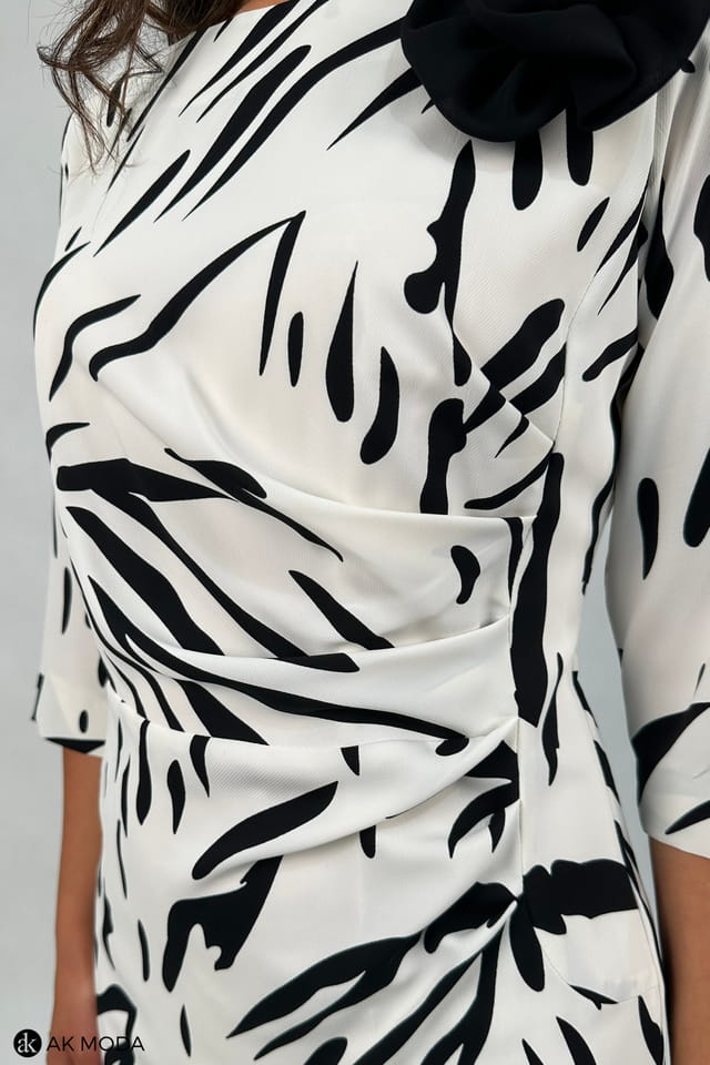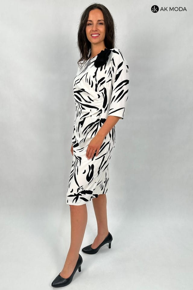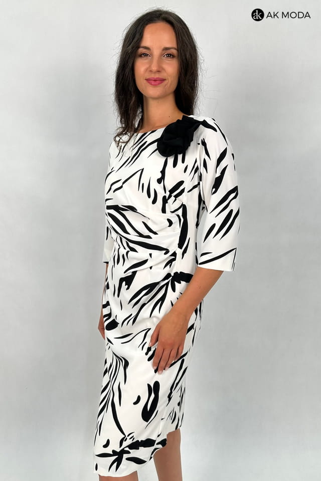 Elegancka sukienka w kolorze ecru w czarny wzór, z odpinanym ozdobnym kwiatkiem. Rękawy do łokcia, dekolt okragły, w talii z boku marszczenie.