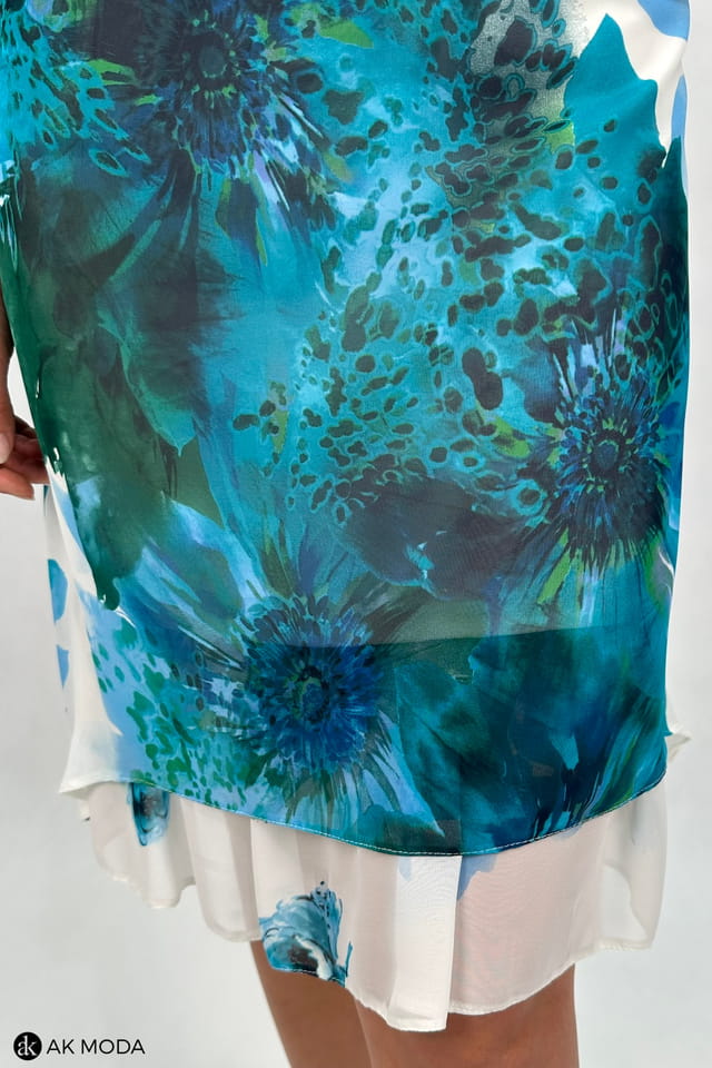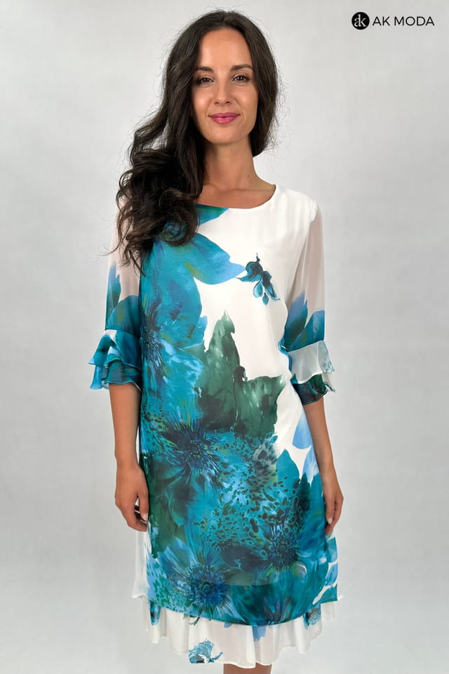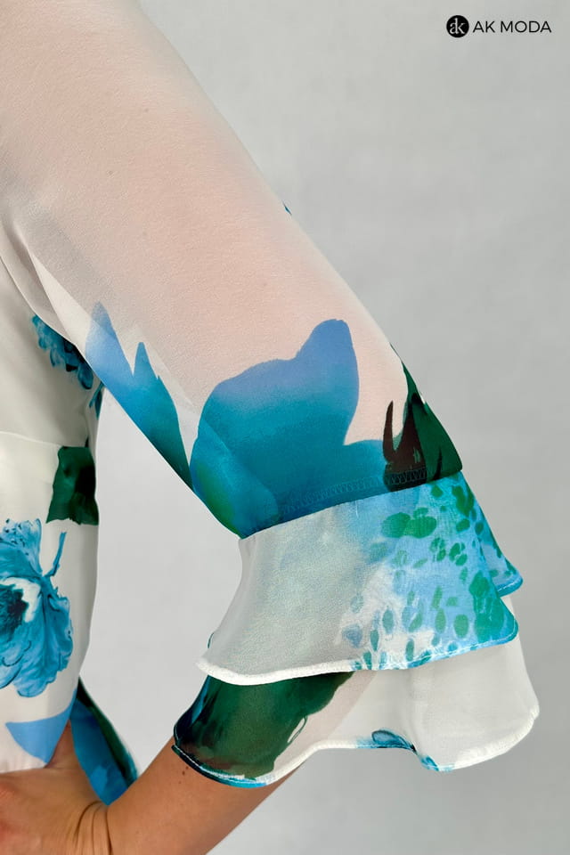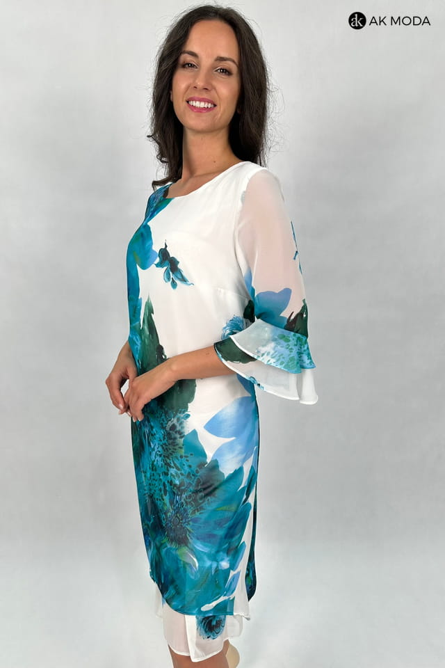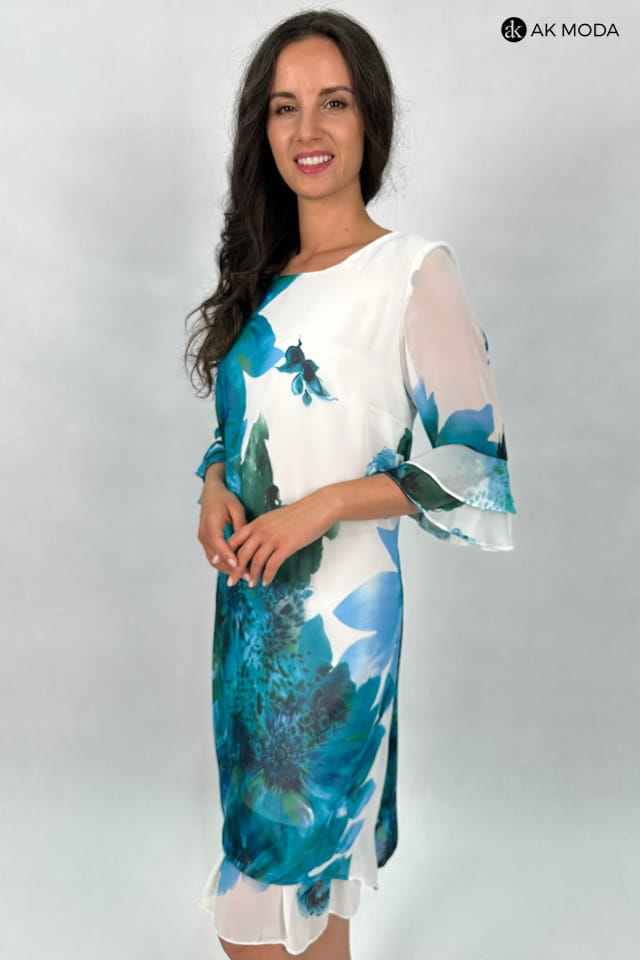 Śmietankowa sukienka o trapezowym kroju, z kwiatowym printem w odcieniach zieleni i błękitu. Dekolt okrągły, transparentne rękawy do łokcia, zakończone falbankami