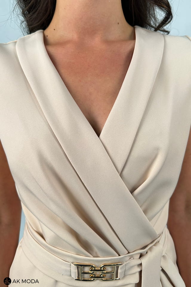 Krótka, dopasowana sukienka w kolorze beżowym z zakładanym, asymetrycznym dołem i szalowym kołnierzem. Fason odcinany, w talii pasek z ozdobną klamrą.