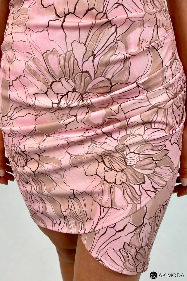 Krótka, dopasowana sukienka w kolorze różowym z kwiatowym, beżowym printem. Dekolt kopertowy, krótkie marszczone rękawy, dół zakładany z marszczeniem po boku.