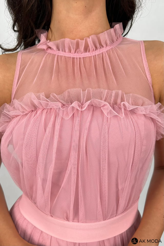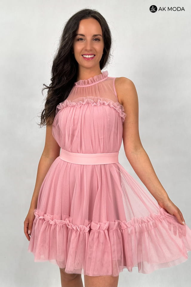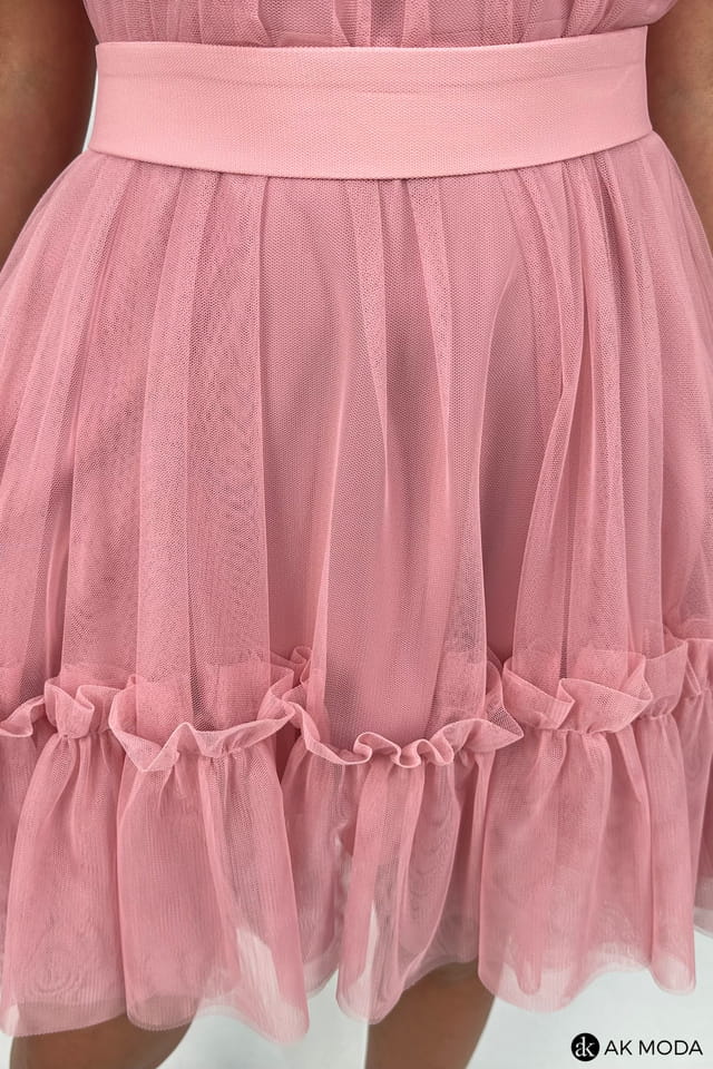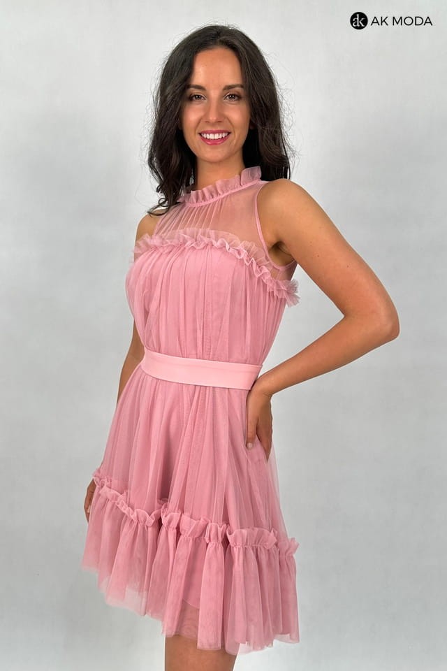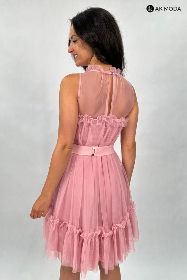 Rozkloszowana sukienka mini w kolorze różowym, z luźną wierzchnią warstwą tliulu. Dekolt okrągły, ozdobiony falbanką, w talii pasek.