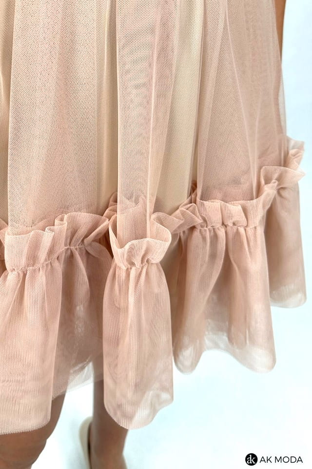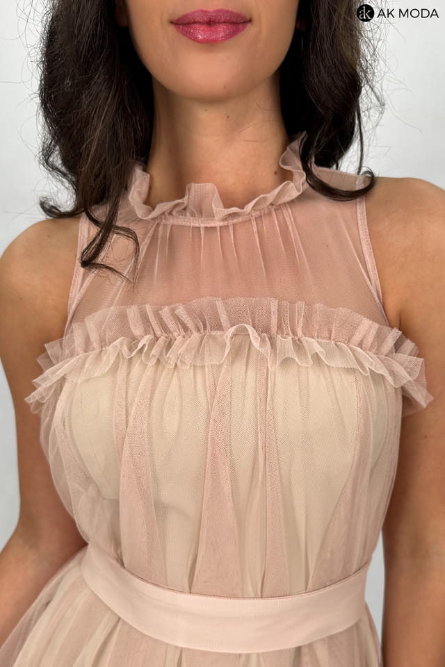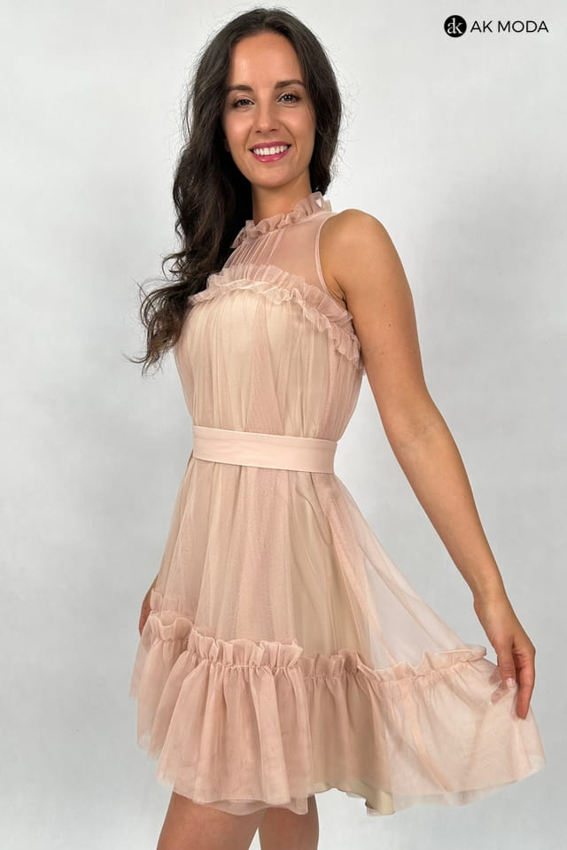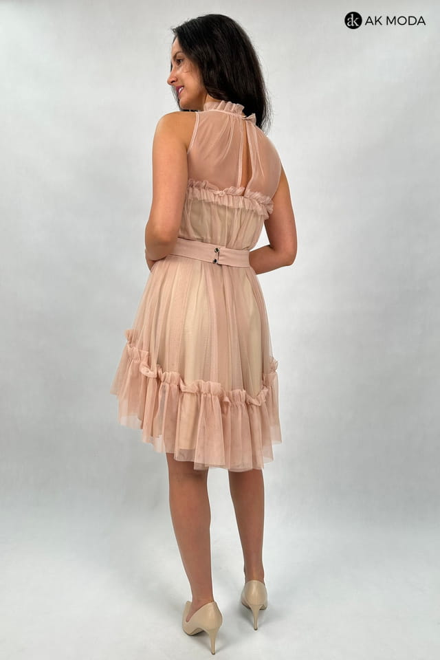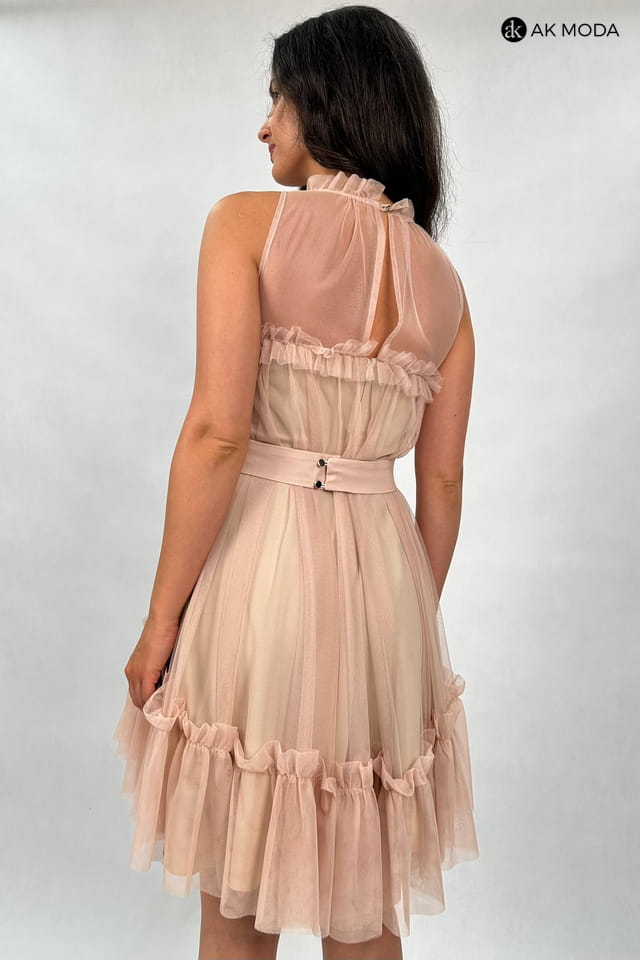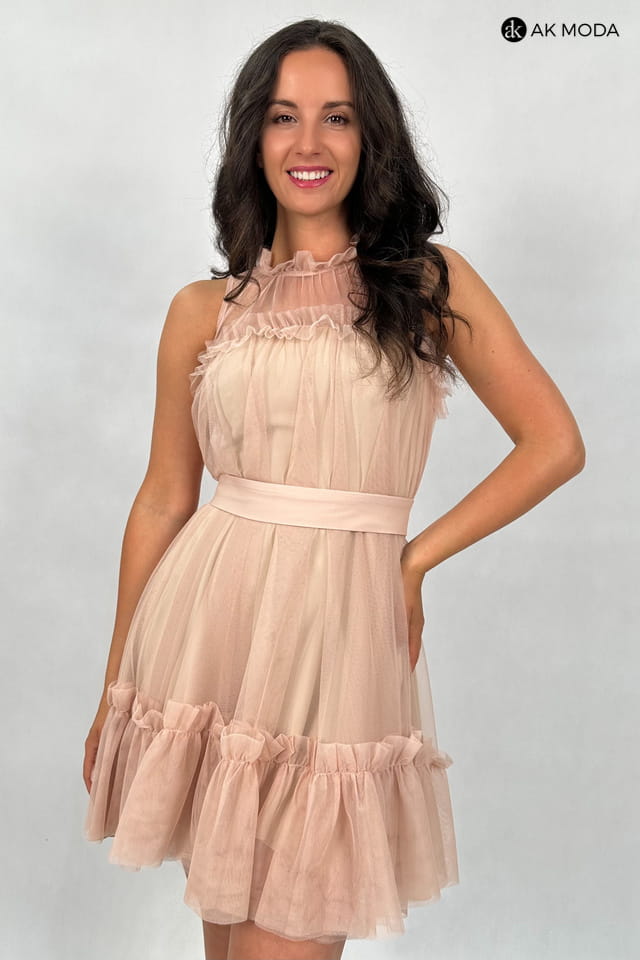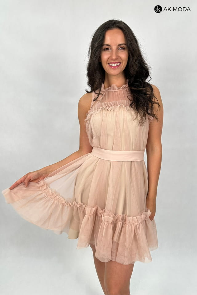 Rozkloszowana sukienka mini w kolorze beżowym, z luźną wierzchnią warstwą tliulu. Dekolt okrągły, ozdobiony falbanką, w talii pasek.