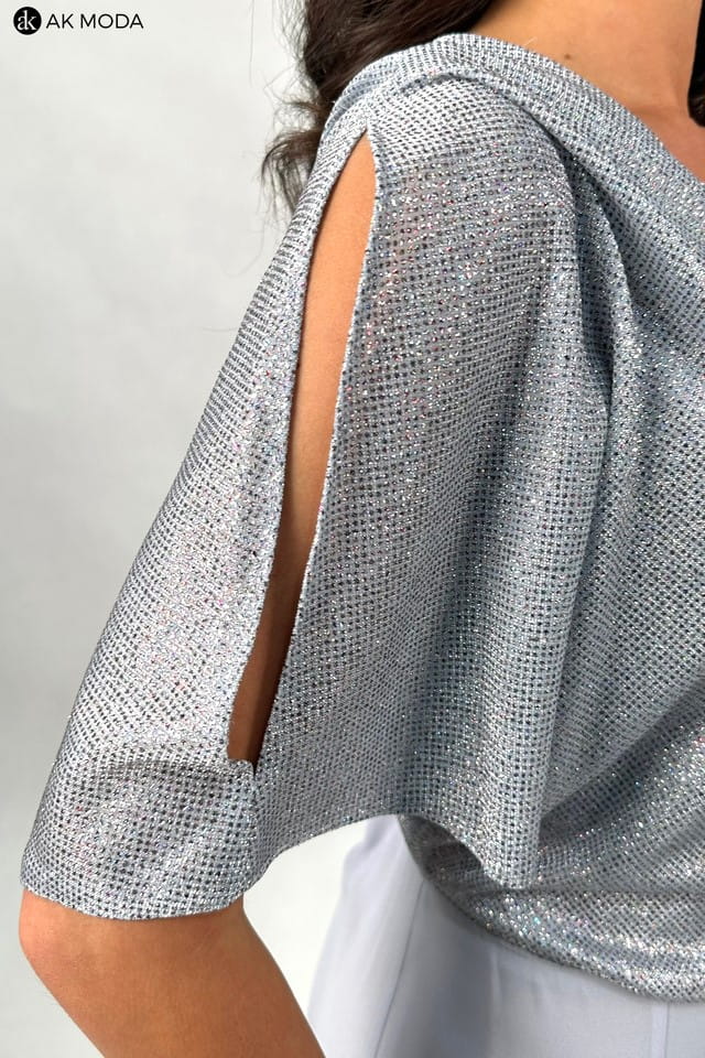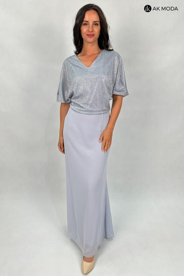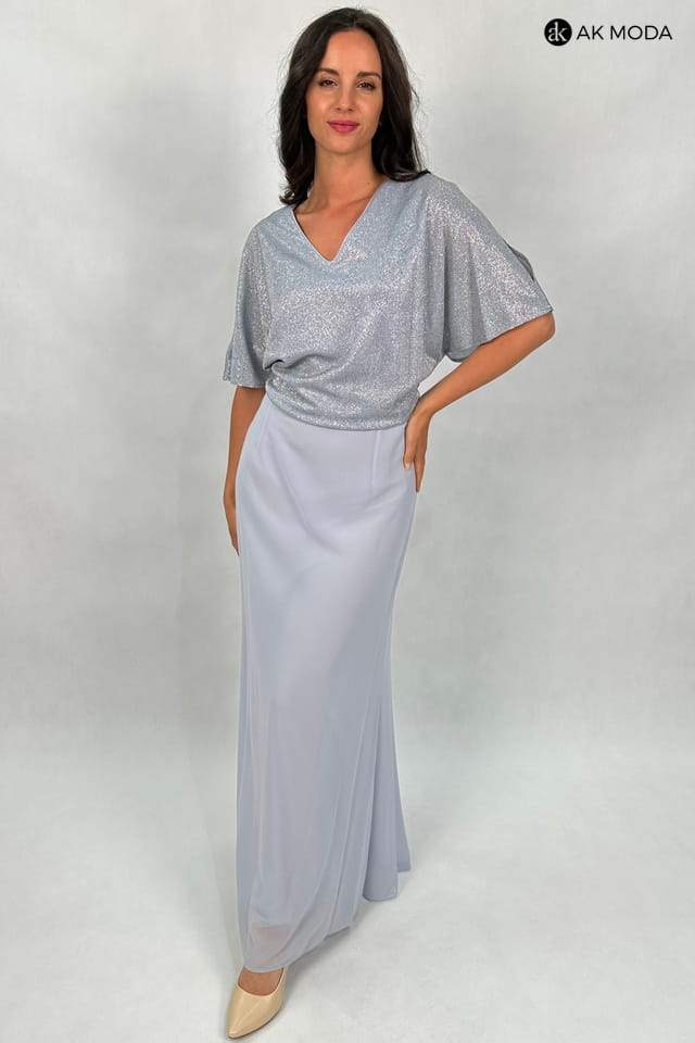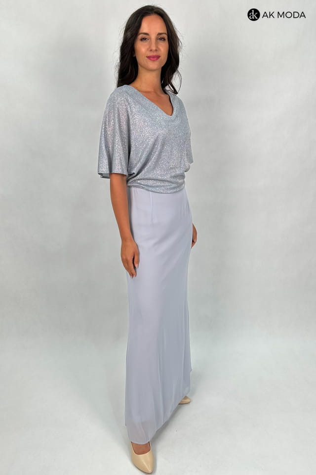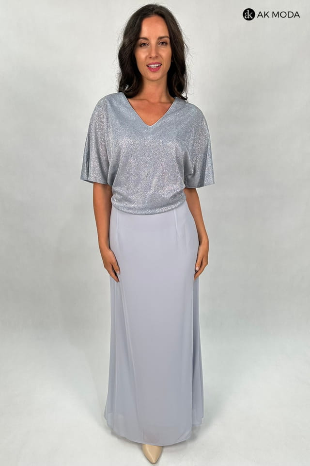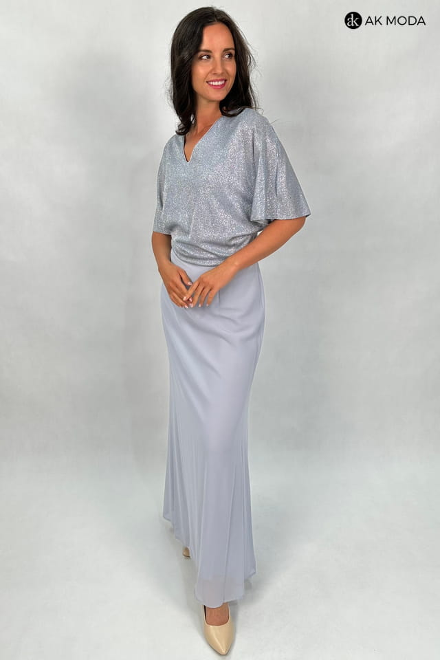 Elegancka sukienka maxi w kolorze szarym. Dekolt w szpic, krótkie kimonowe rękawy z pęknieciami. Góra sukienki uszyta z błyszczacego, elastycznego materiału, dół tiulowy.